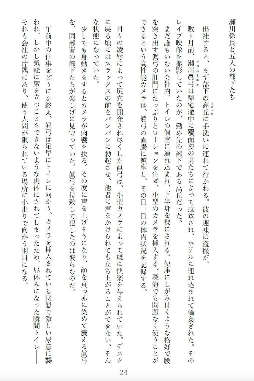 ・瀬川係長と五人の部下たち五人×係長。撮影、小スカ、飲尿、射精管理、二輪挿しなど。