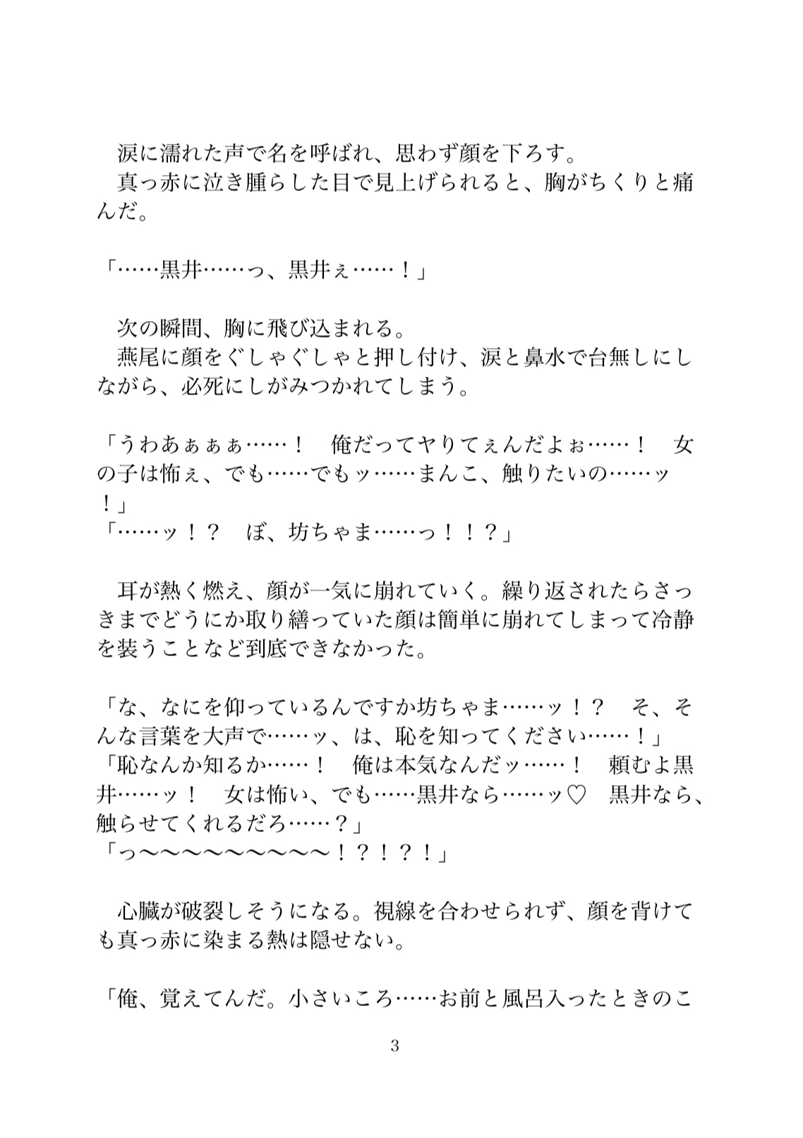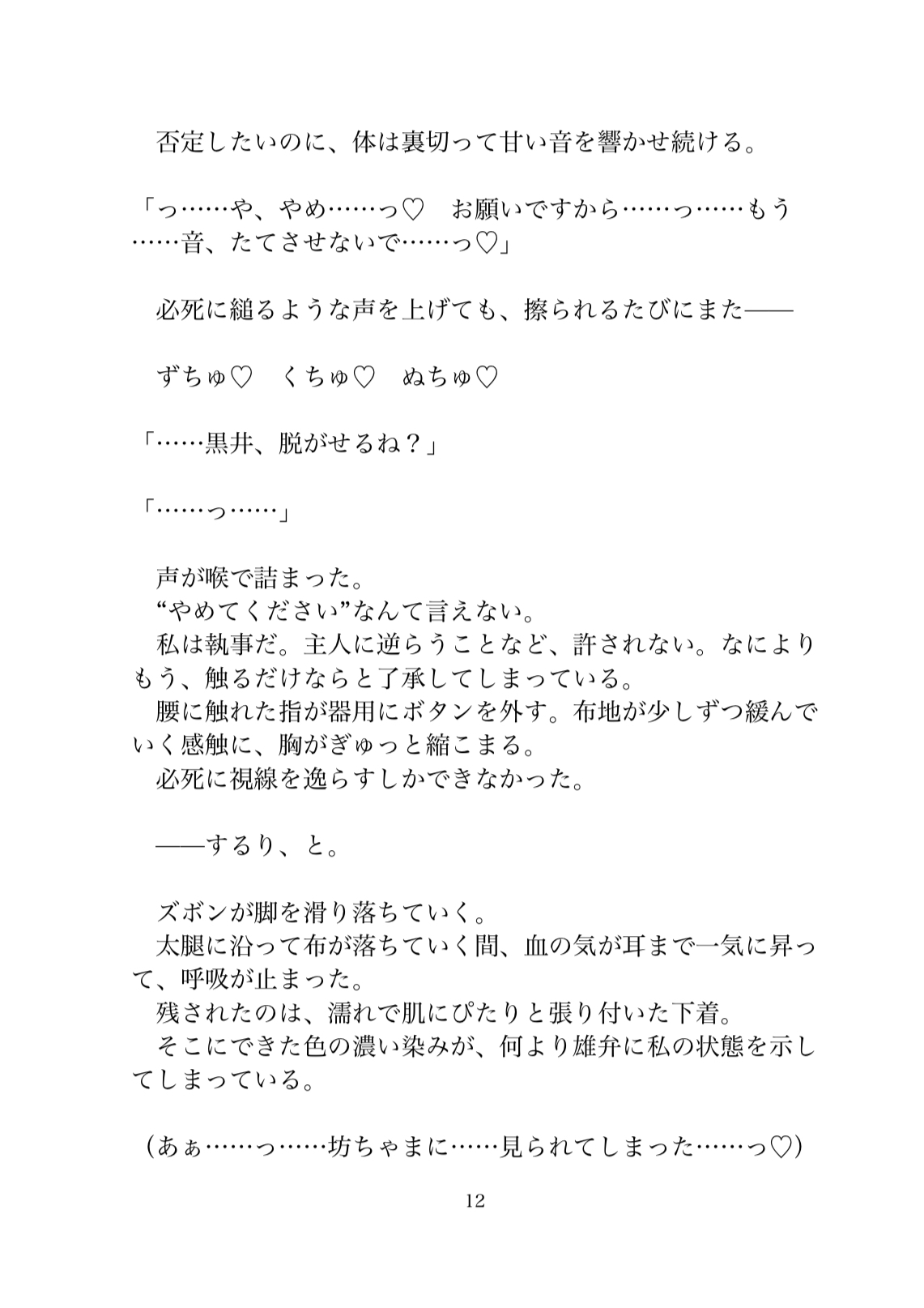 カントボーイの執事の黒井は、女子にこっぴどく振られた坊っちゃまを慰めていた時、おまんこに触りたいヤリたいと欲望を暴露される。ダメだと思いつつも一生のお願いと言われてしまったら執事の立場的にも断れなくて、その日から黒井のおまんこは坊っちゃまのものに……♡