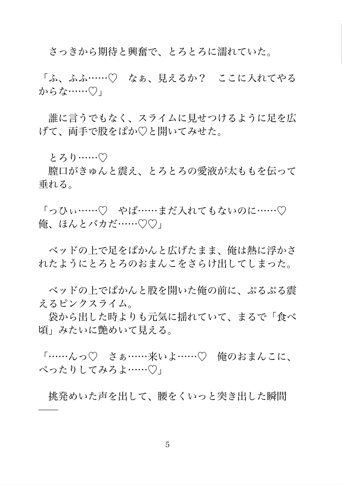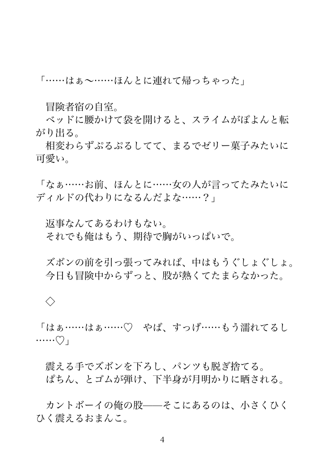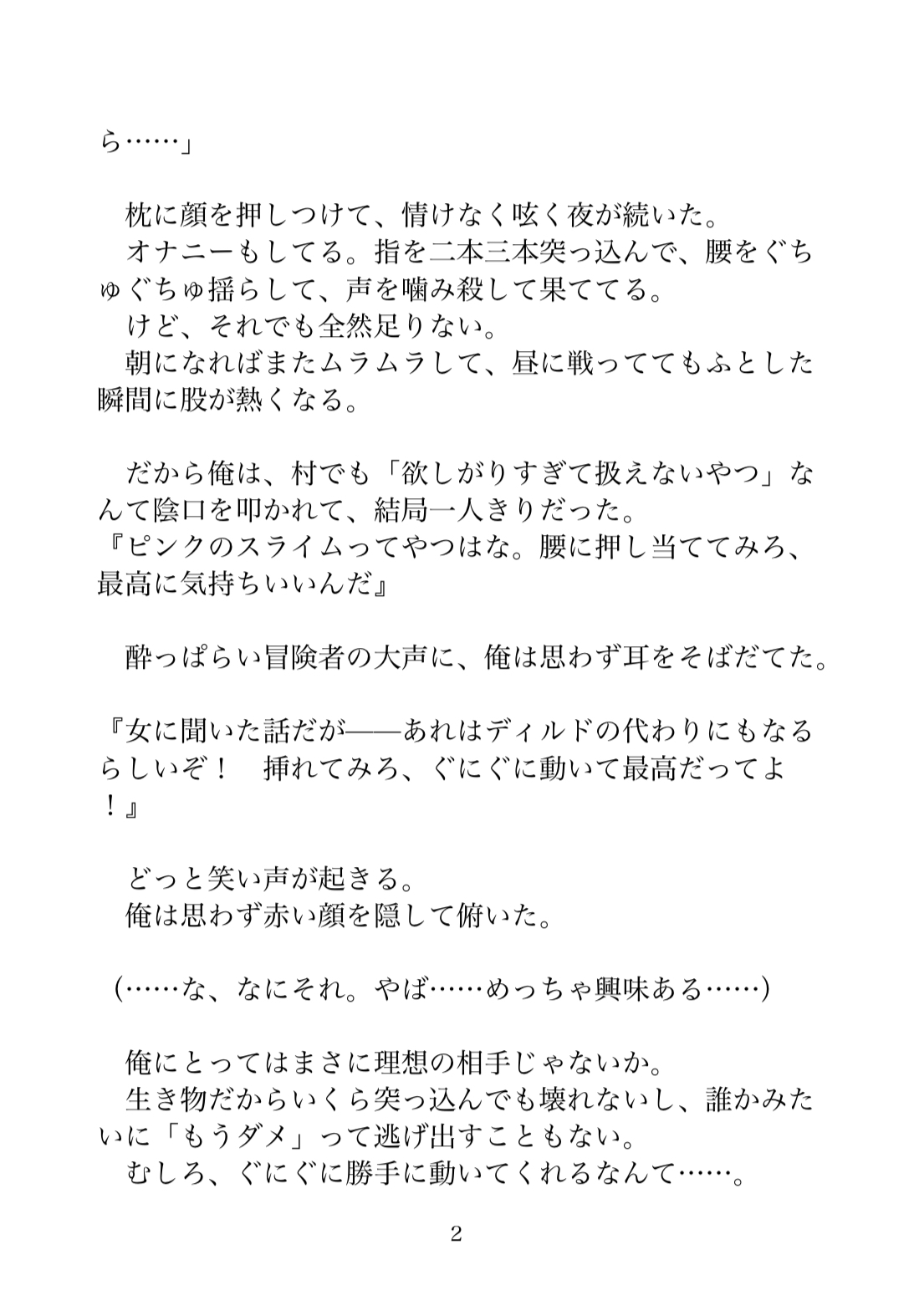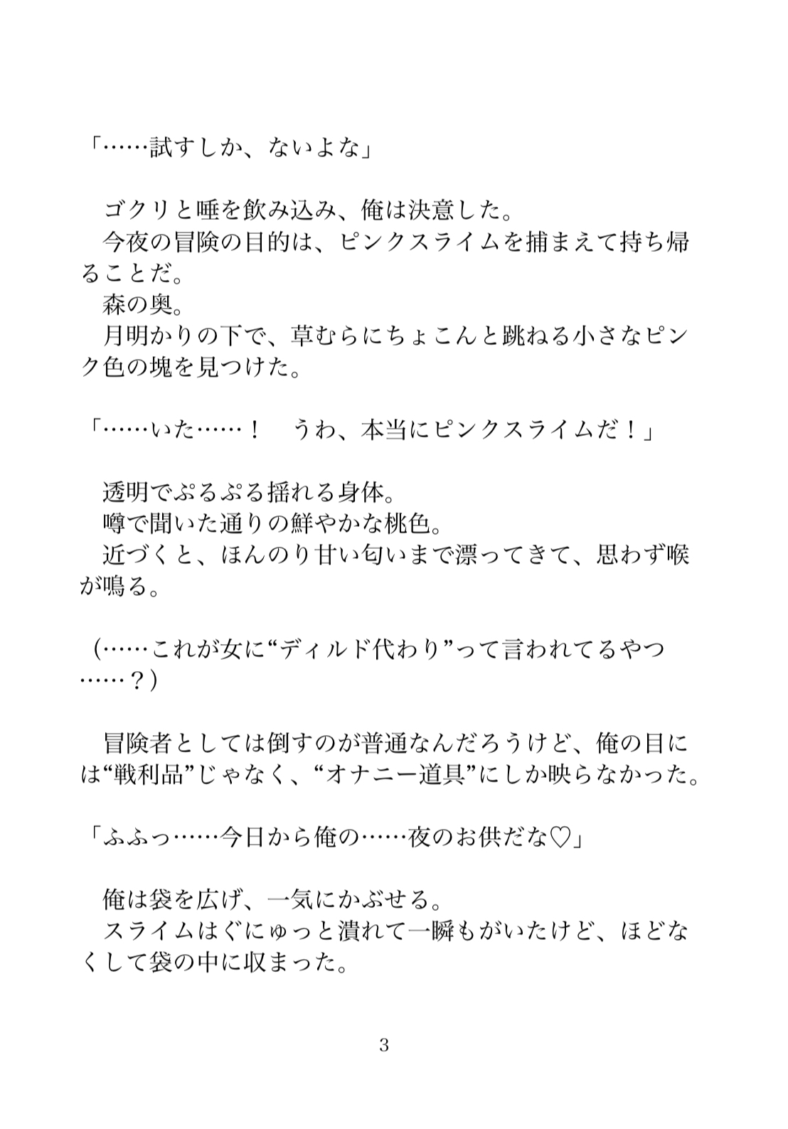 性欲が強すぎてセックスの相手が見つからない冒険者はある日スライムでオナニーすると気持ちいいらしいという話を聞く。それを実行するべく捕まえた冒険者はさっそく家で使ってみるが思っていたよりもずっと気持ち良くて快楽堕ちさせられる話です。