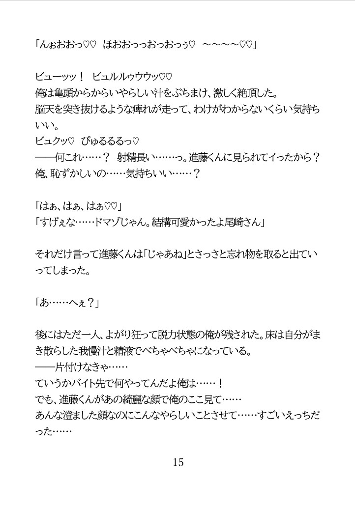 「ほんとにやらしいな。イけよ、ドマゾ乳首♡」平凡な大学生・尾崎眞宏(まひろ)は、カフェバイトで出会ったイケメン後輩・進藤諒(りょう)に、更衣室で乳首オナニーしている姿を目撃されてしまう。黒髪高身長で「メロいバイトが入った」と人気の進藤は、実はS気質で執着深い性質。「調教しがいがあるな」と嗜虐心を露わにし、言葉責め×おもちゃ×焦らし寸止めで、眞宏をメス堕ちさせていく。眞宏はノンケのはずが、乳首からお尻まで開発され、やがて「進藤のモノ」を欲しがるようになり……。番外編では海辺のイベントで嫉妬に駆られた進藤の独占欲が爆発し、体液まみれの甘トロ絶頂セックスで完全に虜に…♡ カフェバイト先でのオナニー現場バレ&羞恥プレイから攻め宅での目隠し・手錠・ローター調教海辺イベントでの嫉妬からの強引セックスまで――