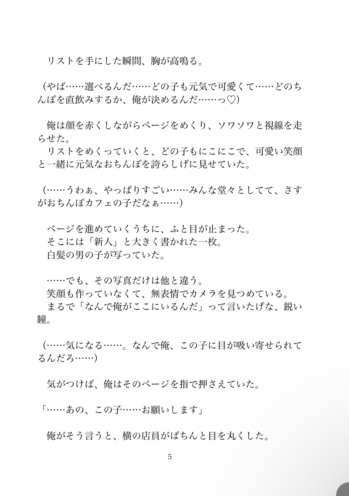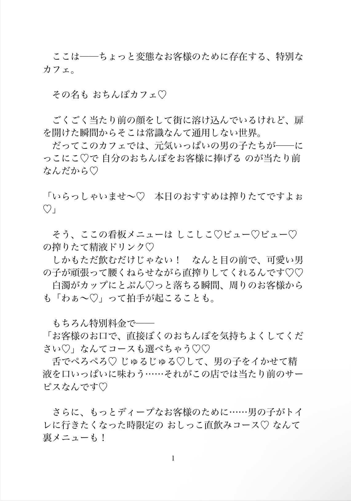 ごくごく当たり前の顔をして街に溶け込んでいるけれど、扉を開けた瞬間からそこは常識なんて通用しない世界。だってこのカフェでは、元気いっぱいの男の子たちが──にっこにこ♡で 自分のおちんぽをお客様に捧げる のが当たり前なんだから♡