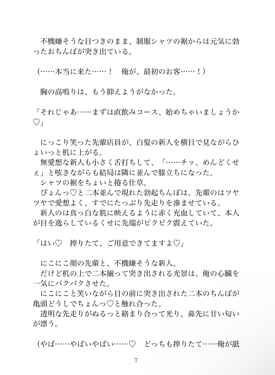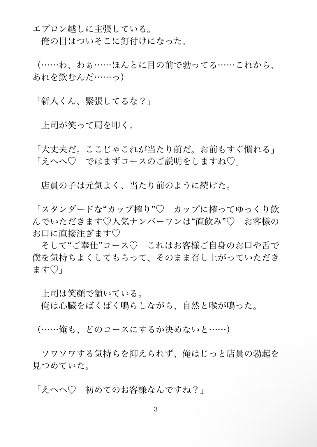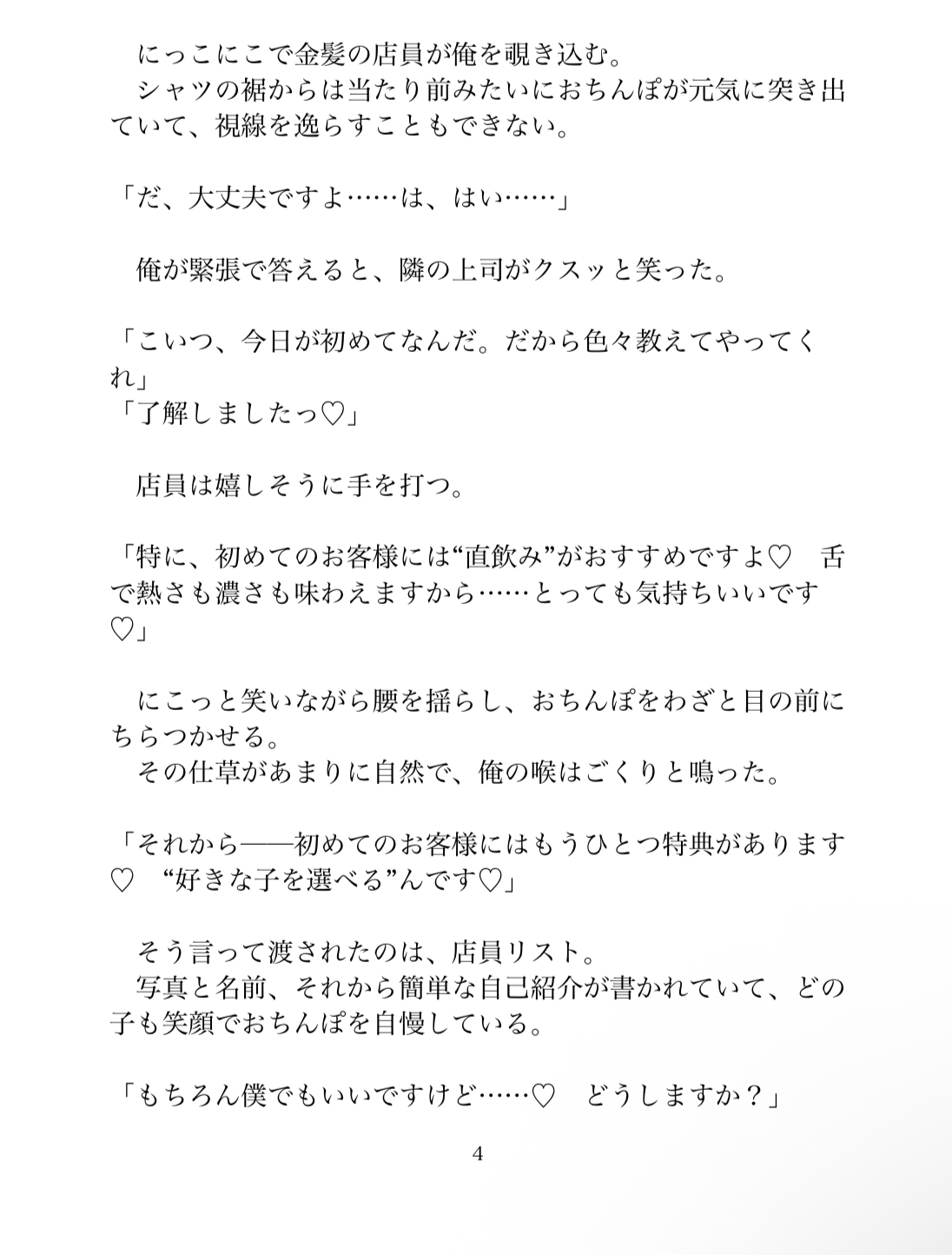 もちろん特別料金で──「お客様のお口で、直接ぼくのおちんぽを気持ちよくしてください♡」なんてコースも選べちゃう♡♡舌でぺろぺろ♡ じゅるじゅる♡して、男の子をイかせて精液を口いっぱいに味わう……それがこの店では当たり前のサービスなんです♡