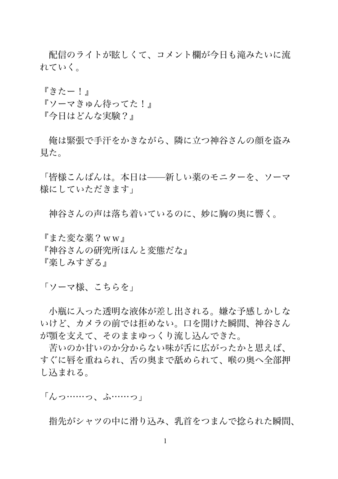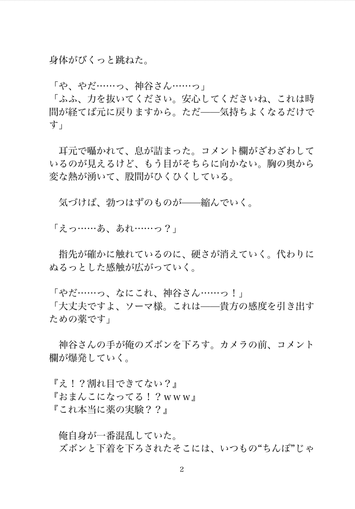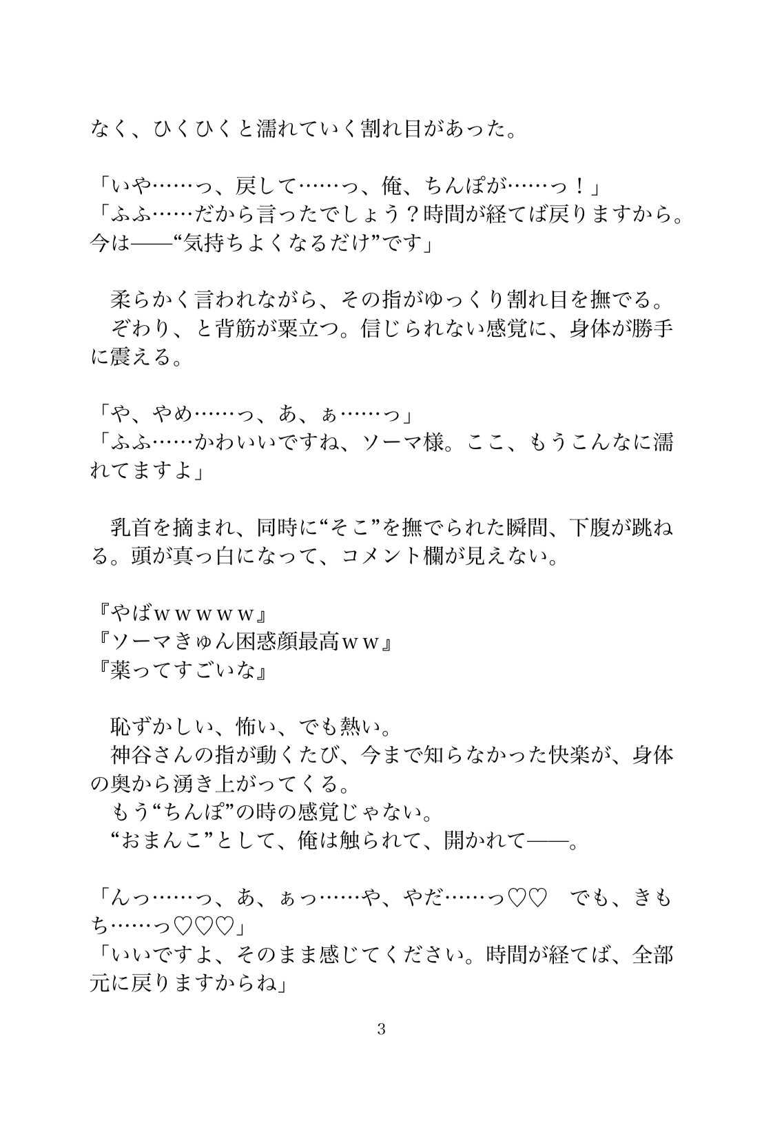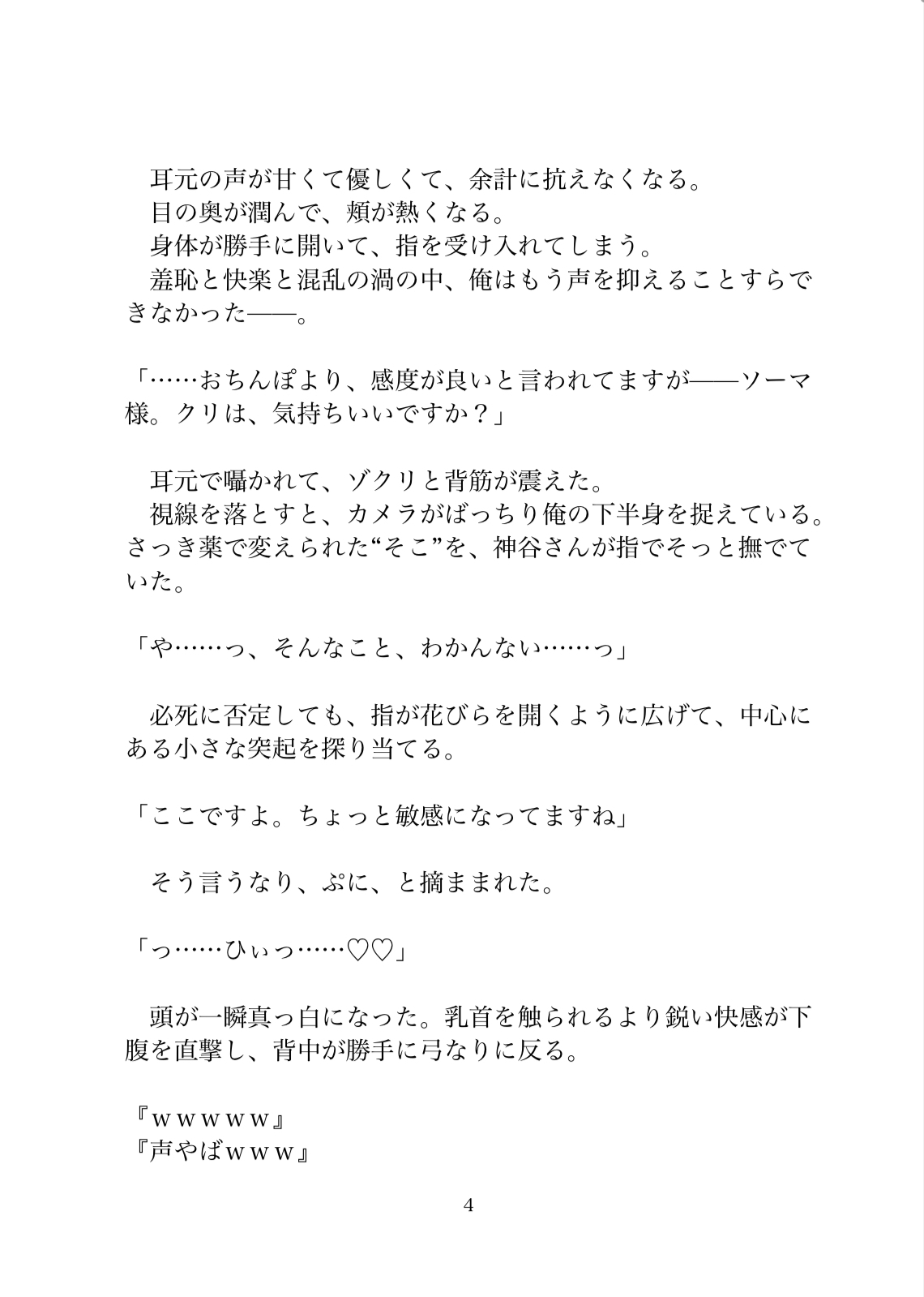 神谷のおちんぽケースとして配信を続けていたソーマは、新しく開発されたという薬の実験台に!なんと、おちんぽがおまんこに!初めての女の快楽にトロトロにされながらクリ責め!クスコで処女膜を見られながらオネダリさせられて、ついに処女喪失の瞬間まで配信されちゃう!中出しセックスで潮ふきしちゃうソーマくんの話です!