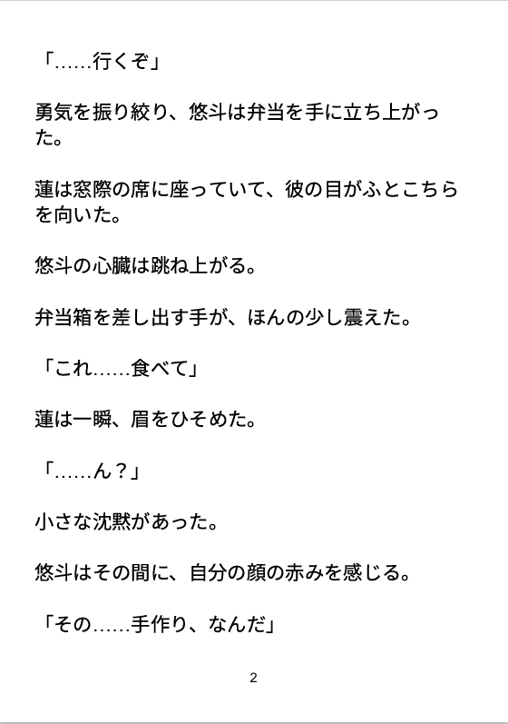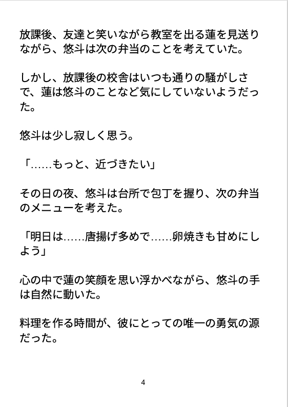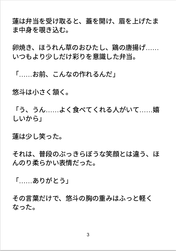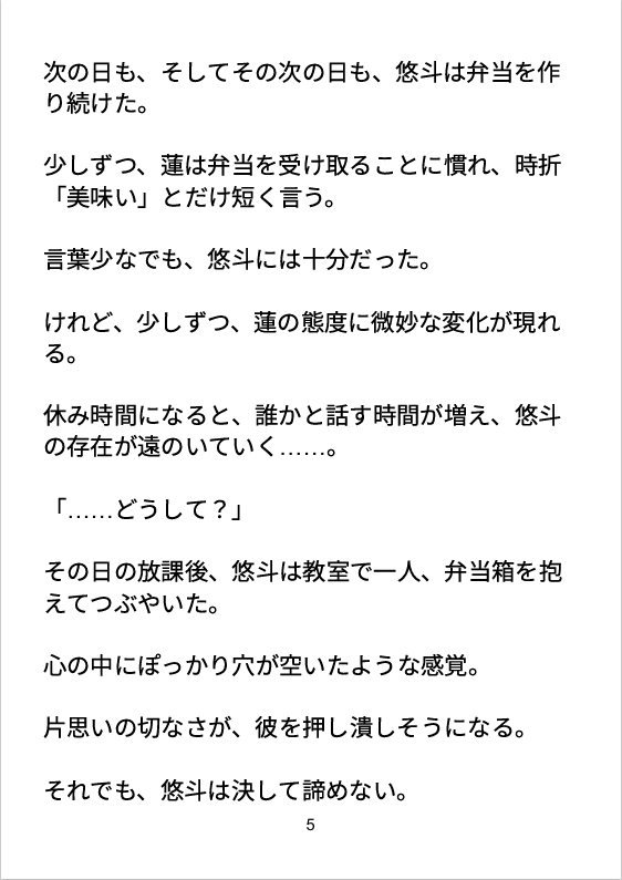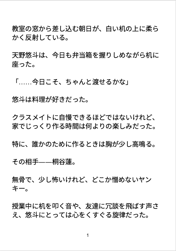 高校2年生の天野悠斗は、料理が得意な内向的な少年。クラスの人気者で無骨なヤンキー、桐谷蓮に密かに片思いをしている。勇気を出して手作り弁当を渡す日々を送る悠斗だったが、ある日、蓮が転校生の噂や友人関係のトラブルで少し距離を置くようになり、悠斗は胸を痛める。それでも諦めず、自分の想いと向き合った悠斗は、蓮に改めて弁当を手渡し、互いの気持ちを確かめ合う。一時的な寂しさとすれ違いを乗り越え、二人の関係はゆっくりと、でも確実に温かい絆へと変わっていく――。 この作品は「BL小説10本詰め合わせセット! (RJ01471140)」と内容の重複があります。