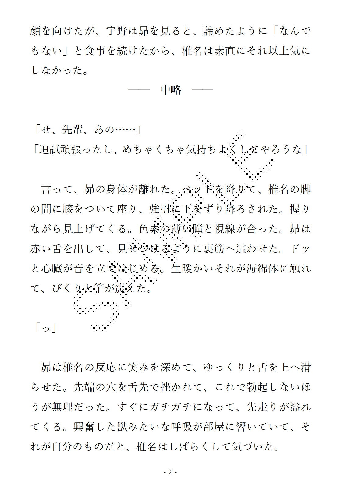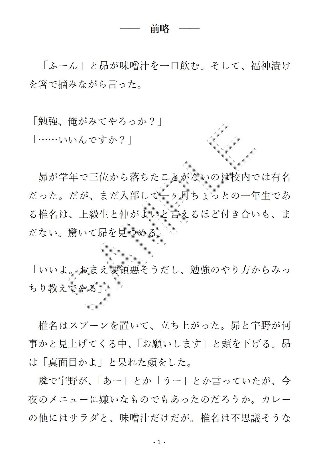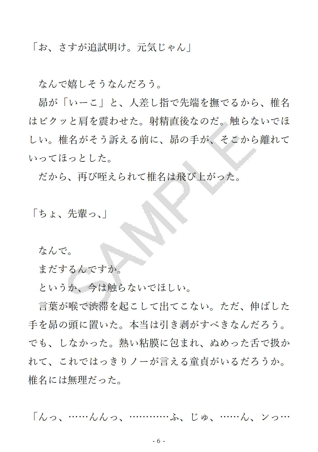 ビッチ受け/襲い受け/♡喘ぎ/痙攣アクメ/童貞攻め/巨根攻め/年下攻め/絶倫/中出し/フェラ/騎乗位/メスイキ/連続絶頂/68ページ(22872字)前後予定 中間試験で赤点をとってしまった椎名は、部活の憧れの先輩・昴に追試の勉強を見てもらえたことで、無事追試をパスする。