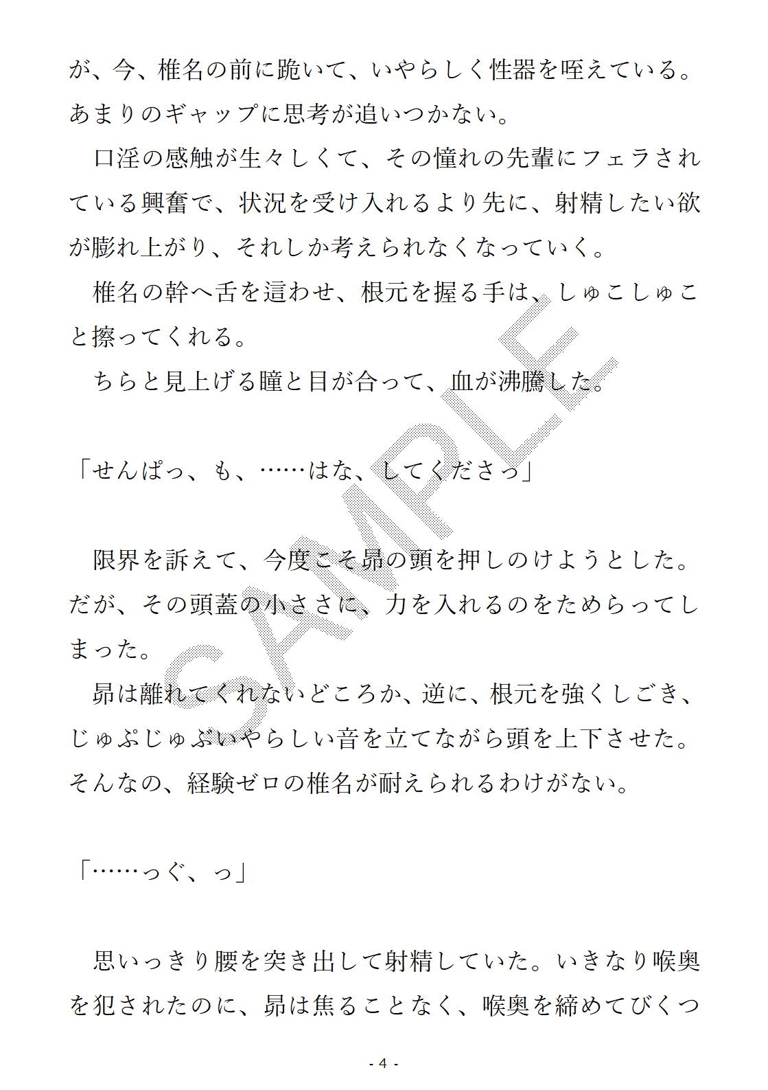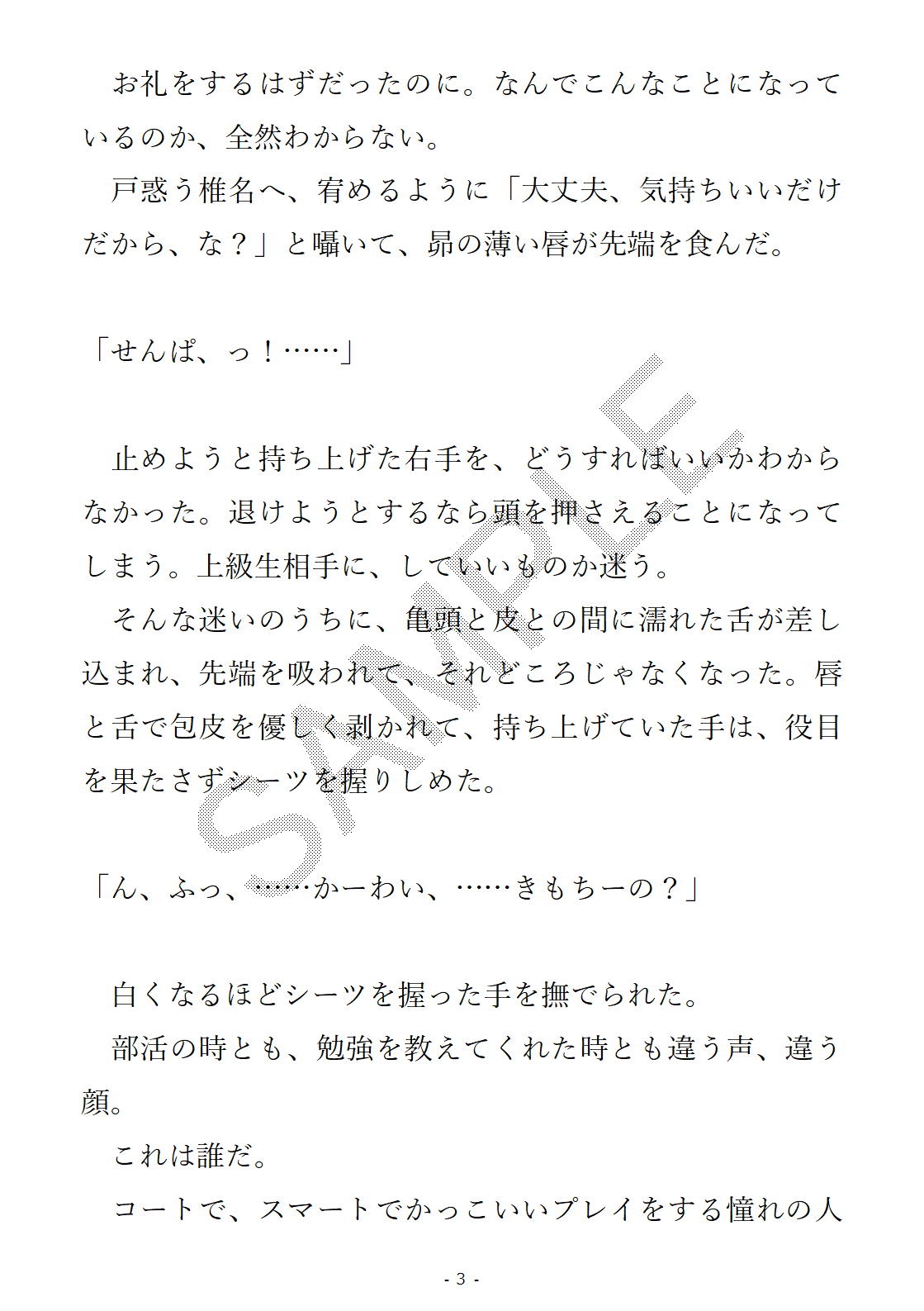 憧れてはいても、先輩をそういう対象に見たことはなかったはずなのに、泣きながら乱れる先輩が可愛く見えてきてしまい―。 ●椎名雄一郎(攻)昴のプレイに魅せられてバスケ部に入部した高校一年生。寮生活中。身長188cm。素直、朴訥、無表情で無口。真面目で要領が悪い。加減を知らないので部活の練習中によくぶっ倒れる。