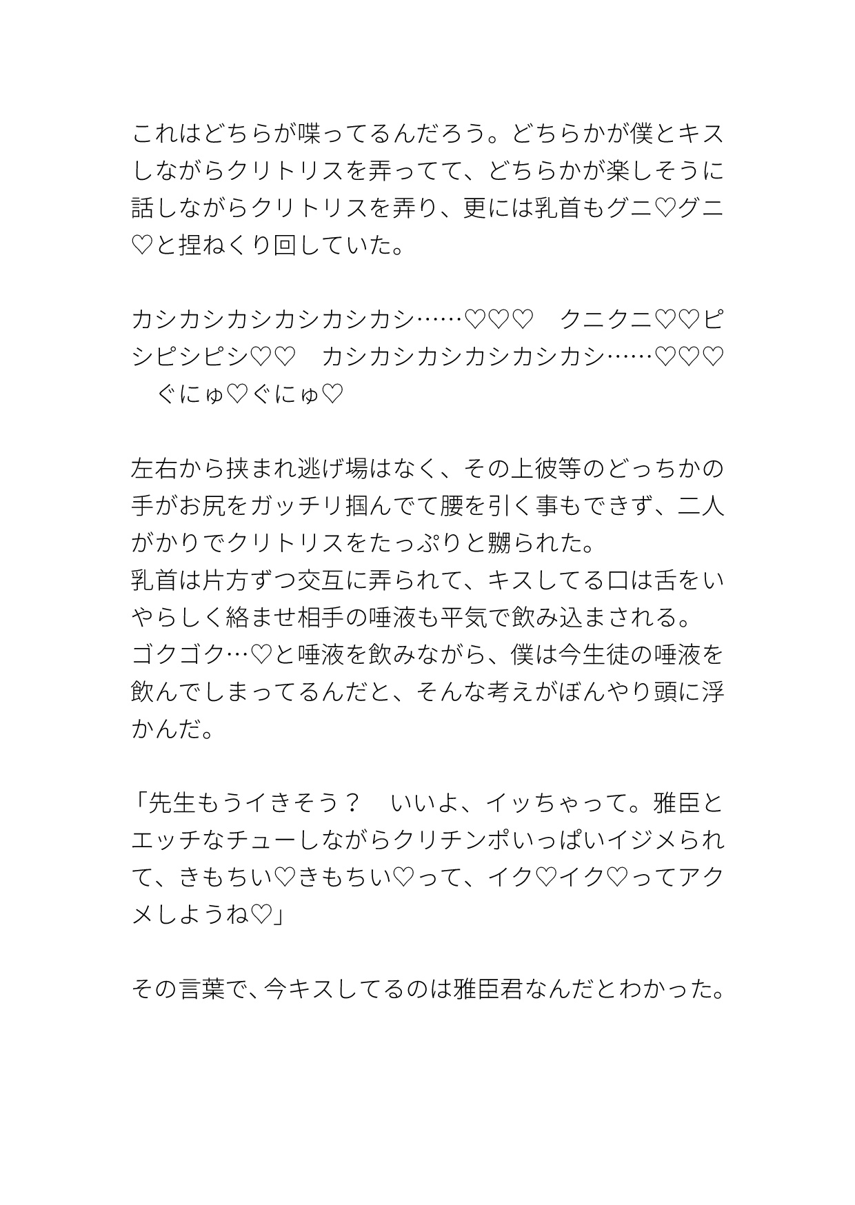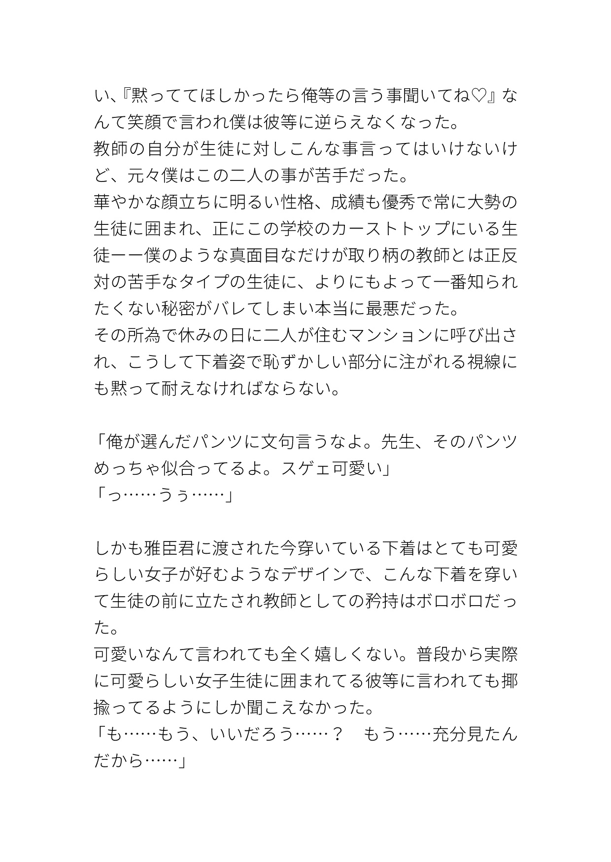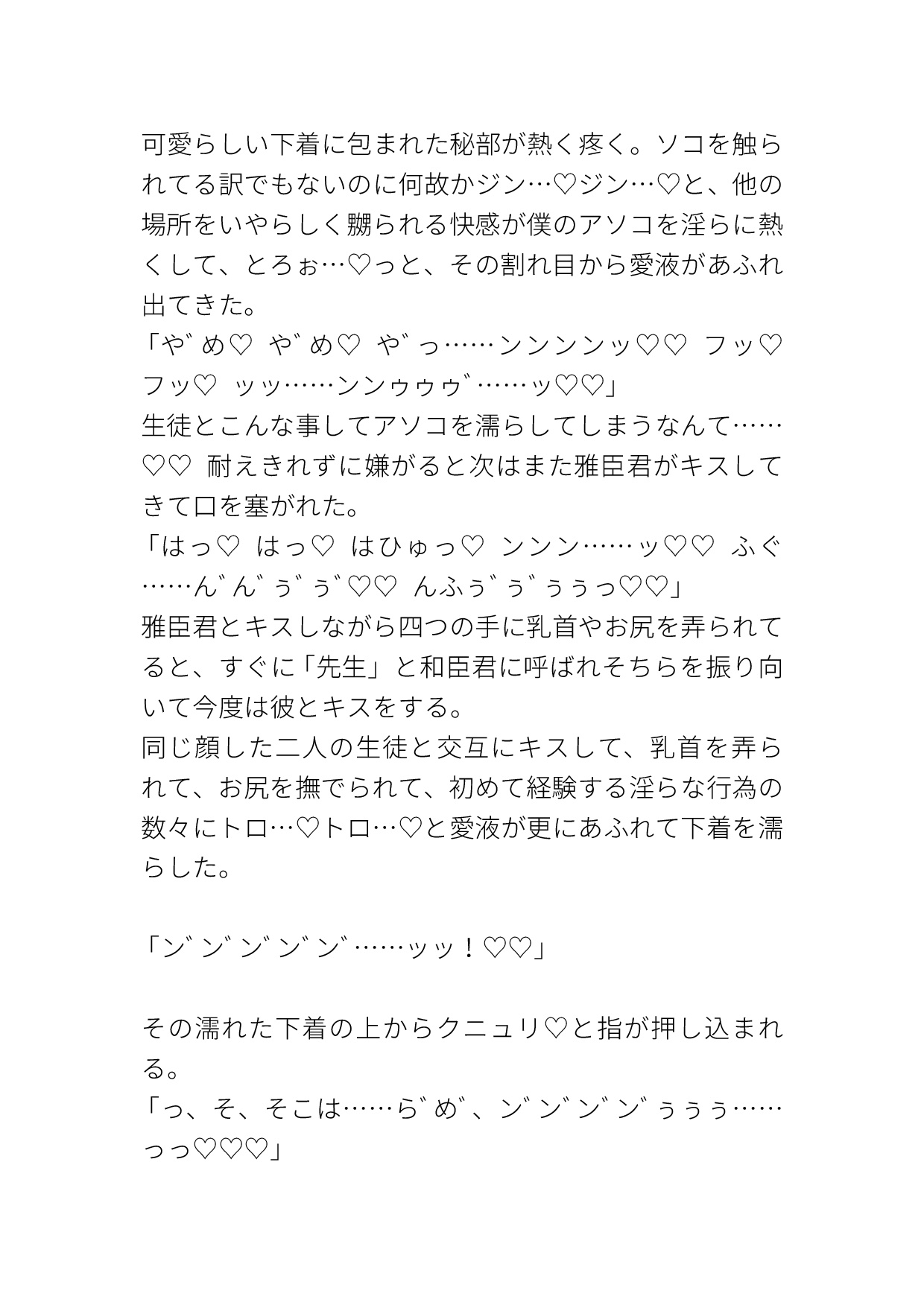 学校一人気なイケメン双子にカントボーイだとバレてしまい、『黙っててほしかったら俺等の言う事聞いてね♡』と脅され好き勝手されてしまうカントボーイ教師の話です。エッチなパンツを穿かされてクリ責めされたり、キスされながらイかされたり、いやらしい事をたくさん言われたり、陽キャイケメン双子に色々されてしまいます。