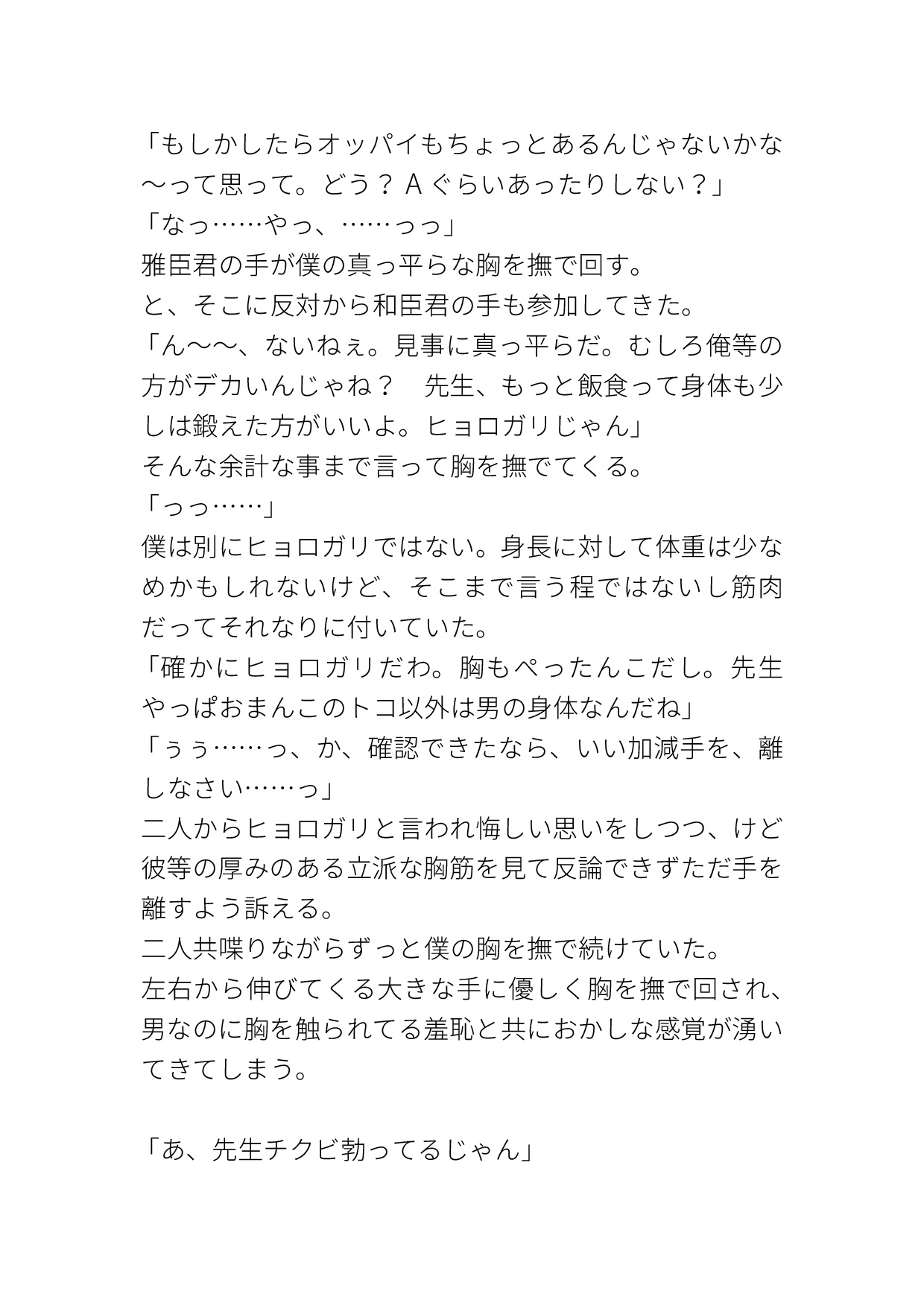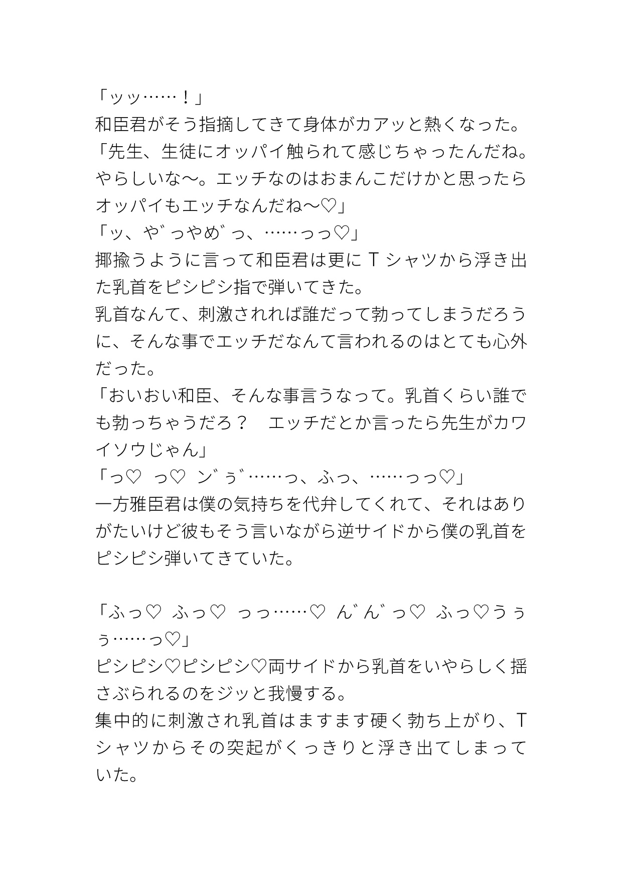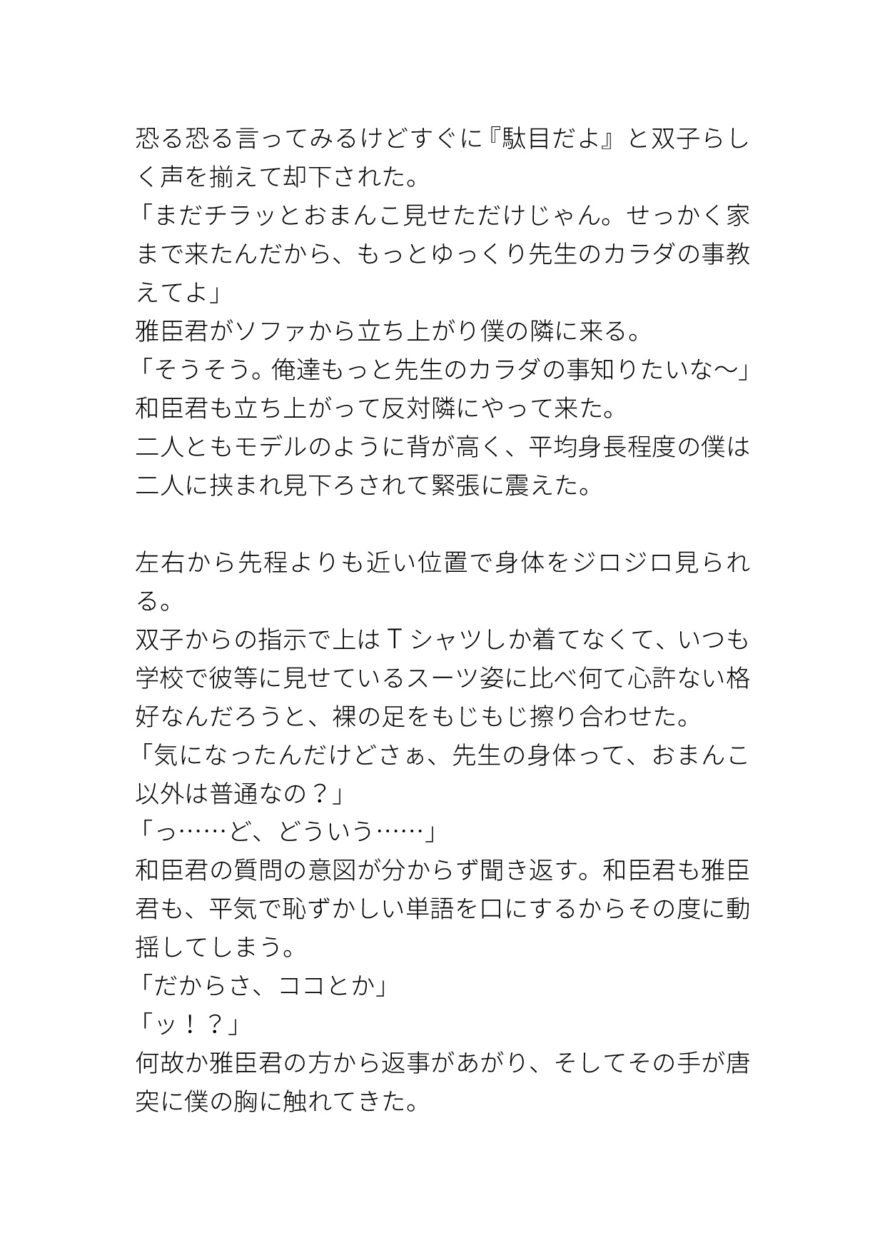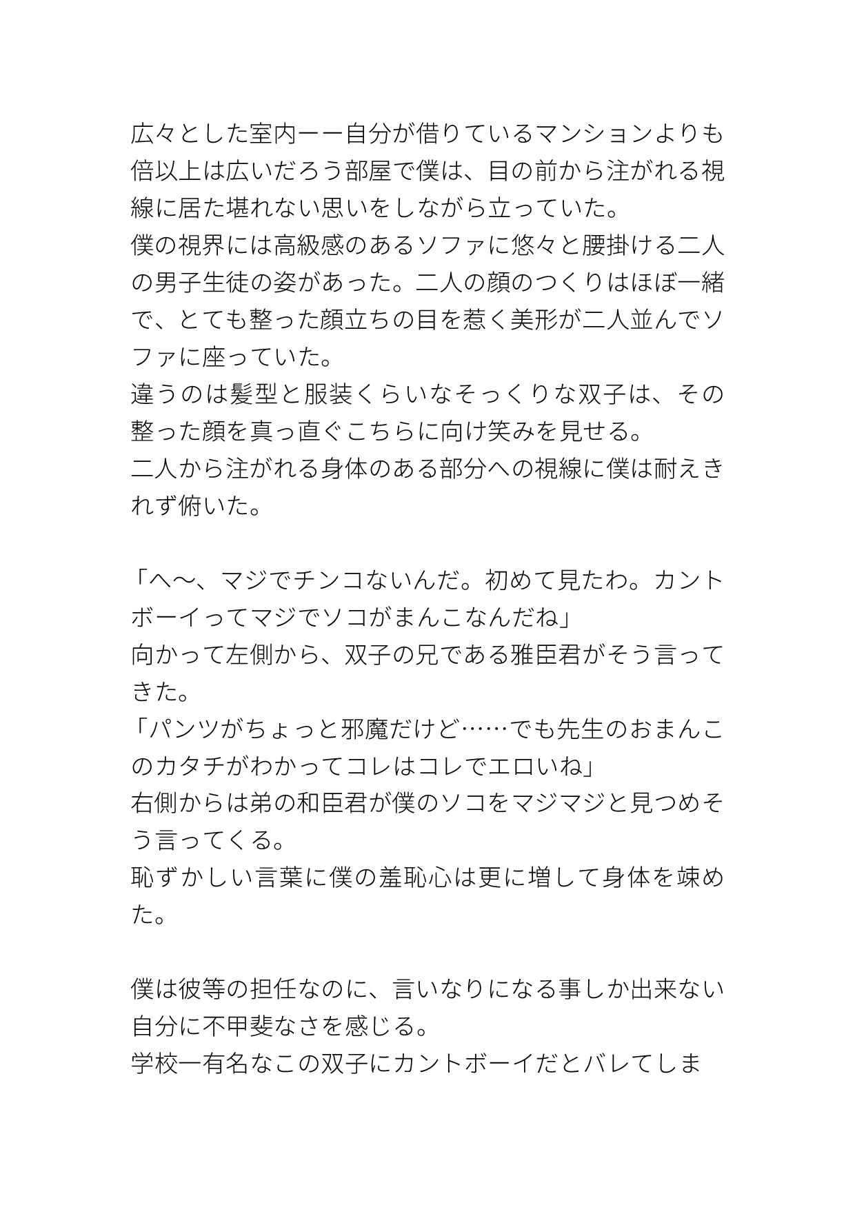 学校一人気なイケメン双子にカントボーイだとバレてしまい、『黙っててほしかったら俺等の言う事聞いてね♡』と脅され好き勝手されてしまうカントボーイ教師の話です。エッチなパンツを穿かされてクリ責めされたり、キスされながらイかされたり、いやらしい事をたくさん言われたり、陽キャイケメン双子に色々されてしまいます。