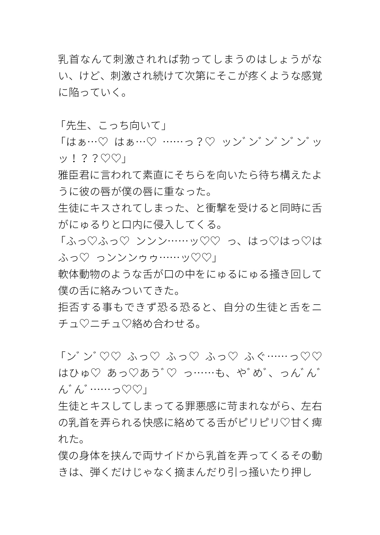 この作品は見事にパーフェクトです。最後もとにもどったもののこれからのあのひとたちのストーリーが気になります。価格がちょっぴり高めかなということで☆4とさせていただきました!救われなかった。乳首責めプレイ、前立腺をコリコリ、何度も中出し・・・きっとこの生徒は普通の生活は難しいと思います。
