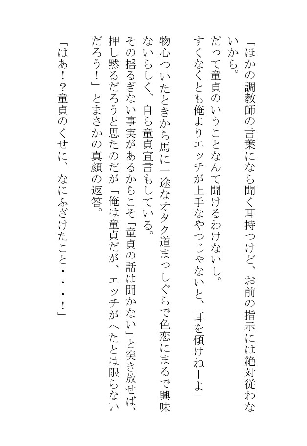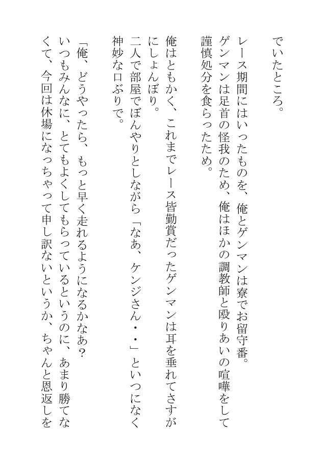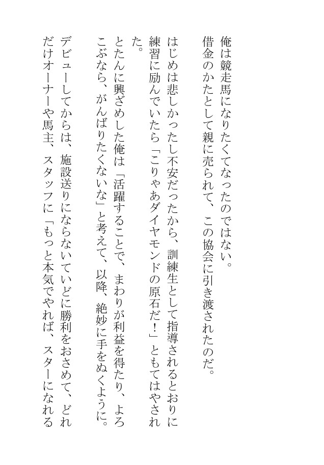 競走馬として訳ありだったり、悩みを抱えていたり、感情をこじらせている彼らが、調教師などの個性豊かで癖の強い男たちに、どろどろぐちょぐちょに甘々に調教されまくるBL小説です。馬の獣人受けガチムチ受け、抱く視点抱かれる視点半々のアダルト全開まっしぐらR18。