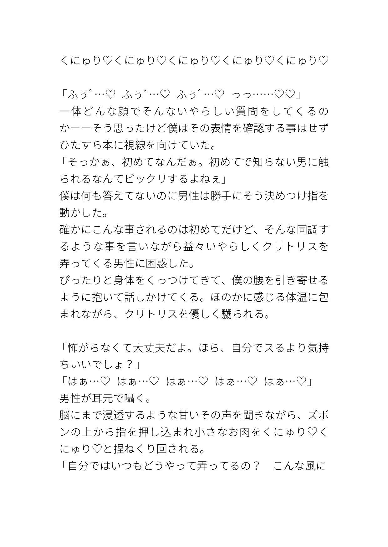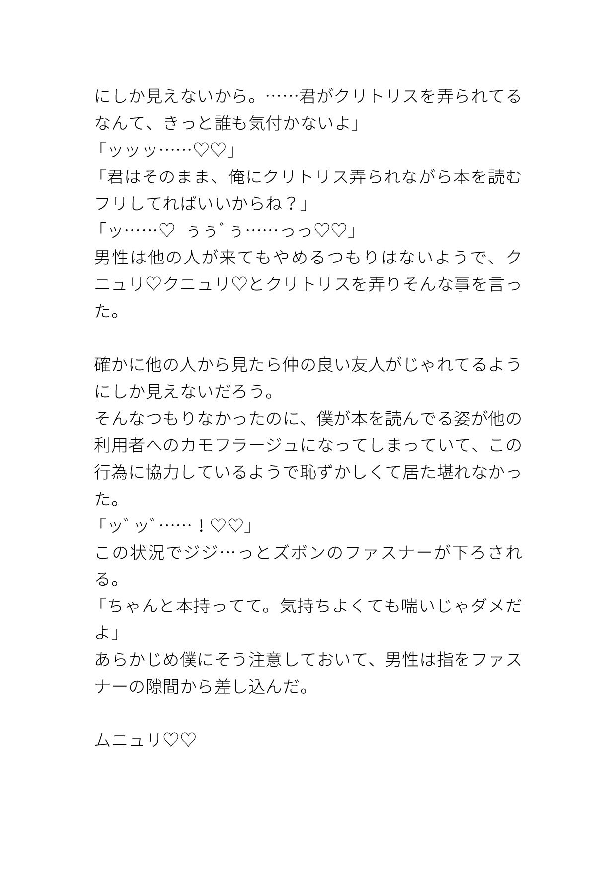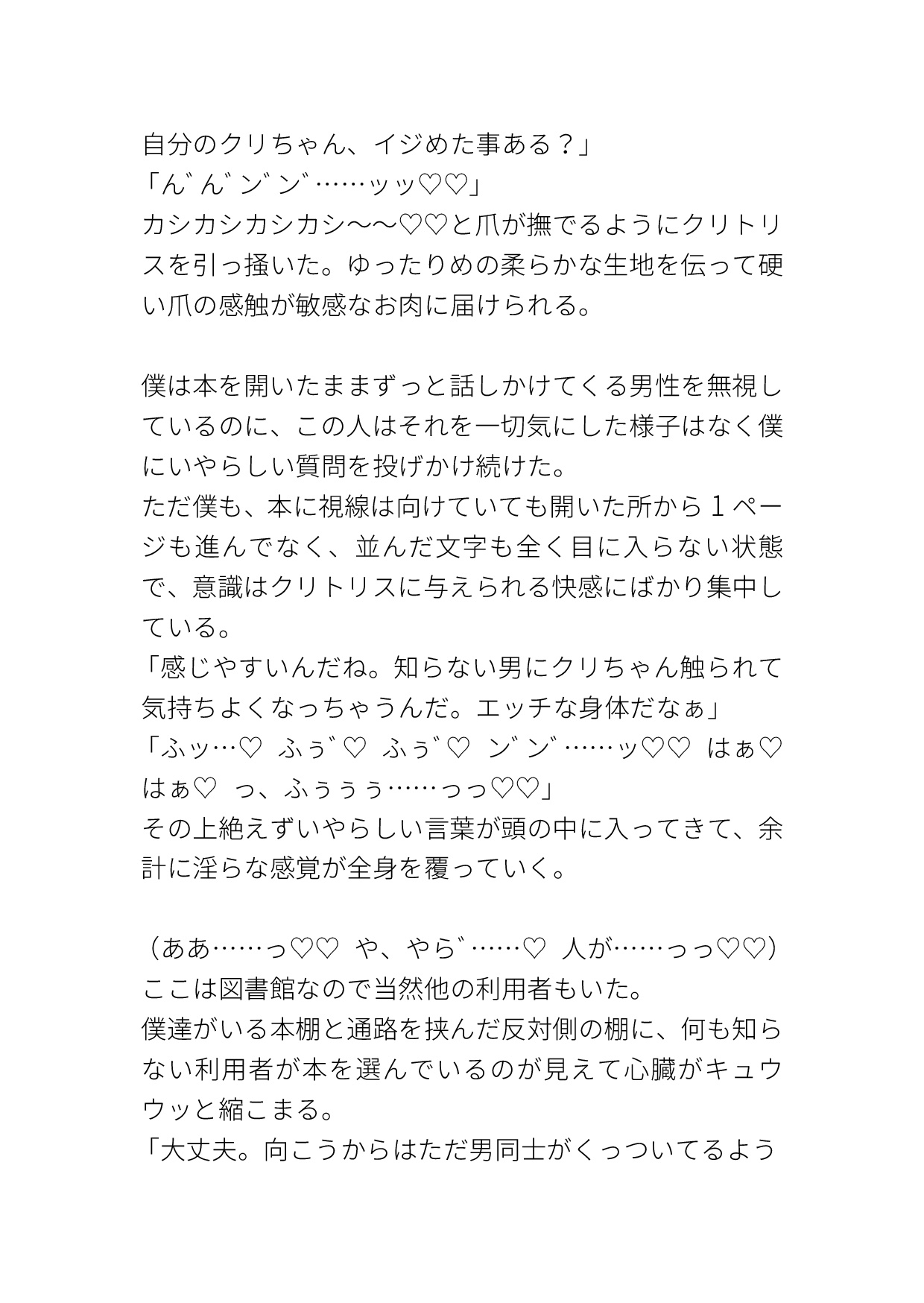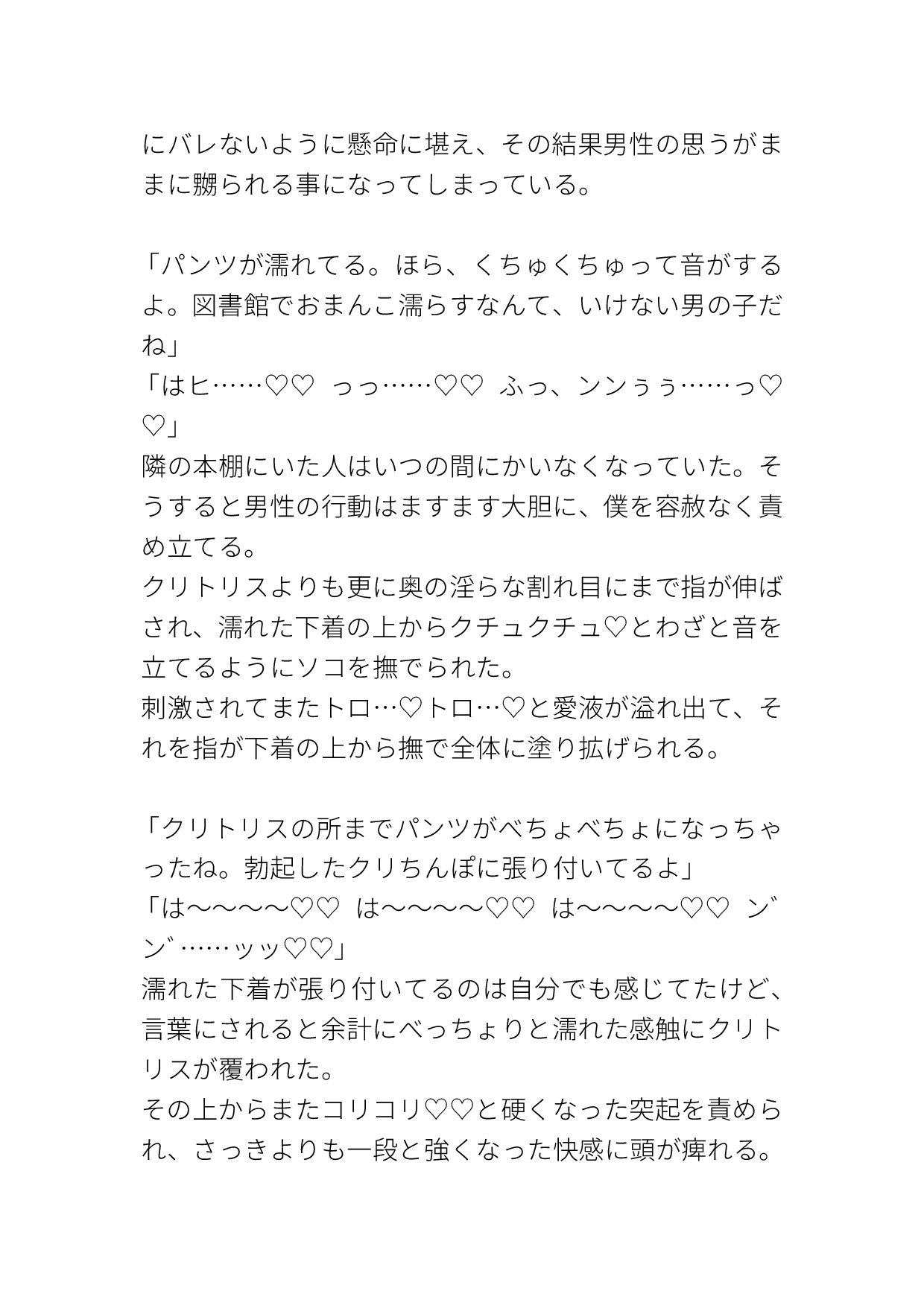 カントボーイが図書館でイケメンに中出しされてしまう話です。甘い声でたっぷりと言葉責めされながらクリトリスを弄られ、乳首を弄られ、本棚の前で立ったままイかされます。その後非常階段に移動してクリフェラされたり手マンされたりしてイかされ、手隙に掴まって後ろから挿れられ子宮に種付けされます。