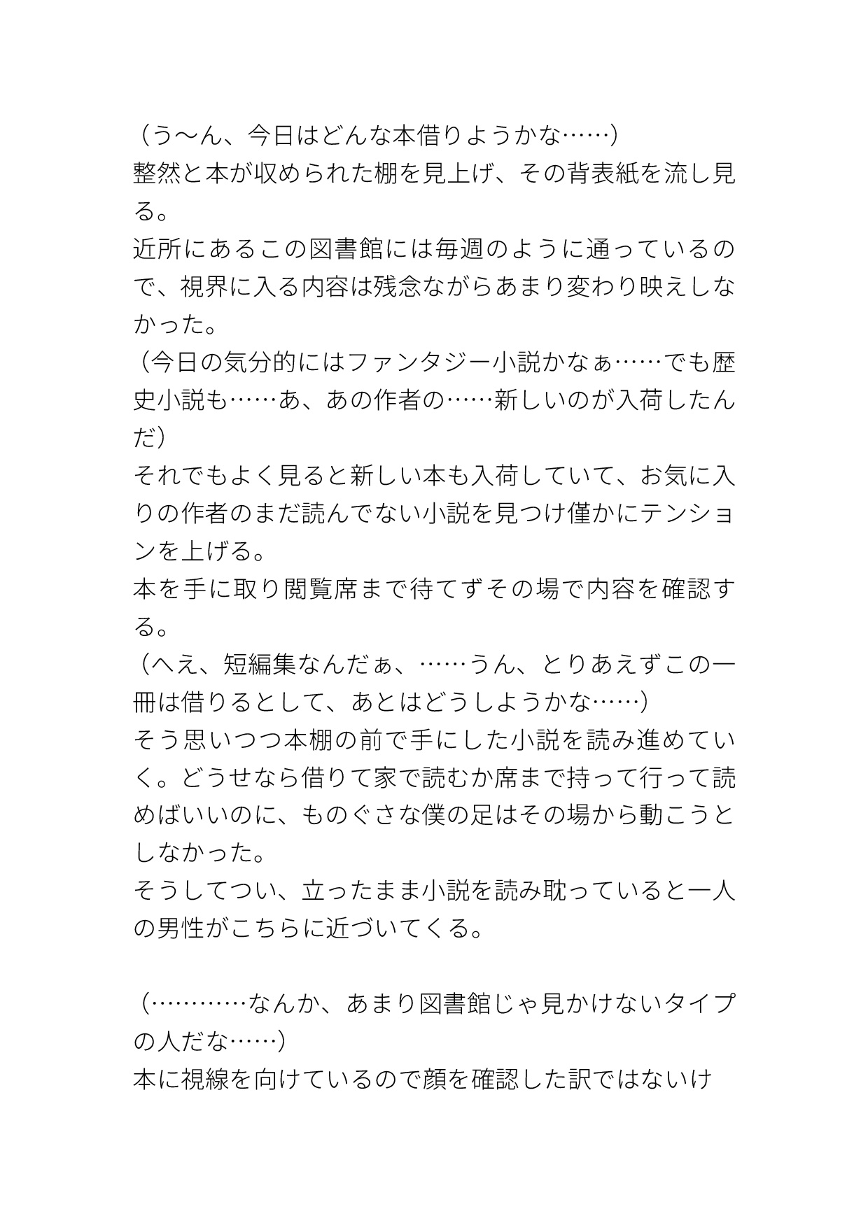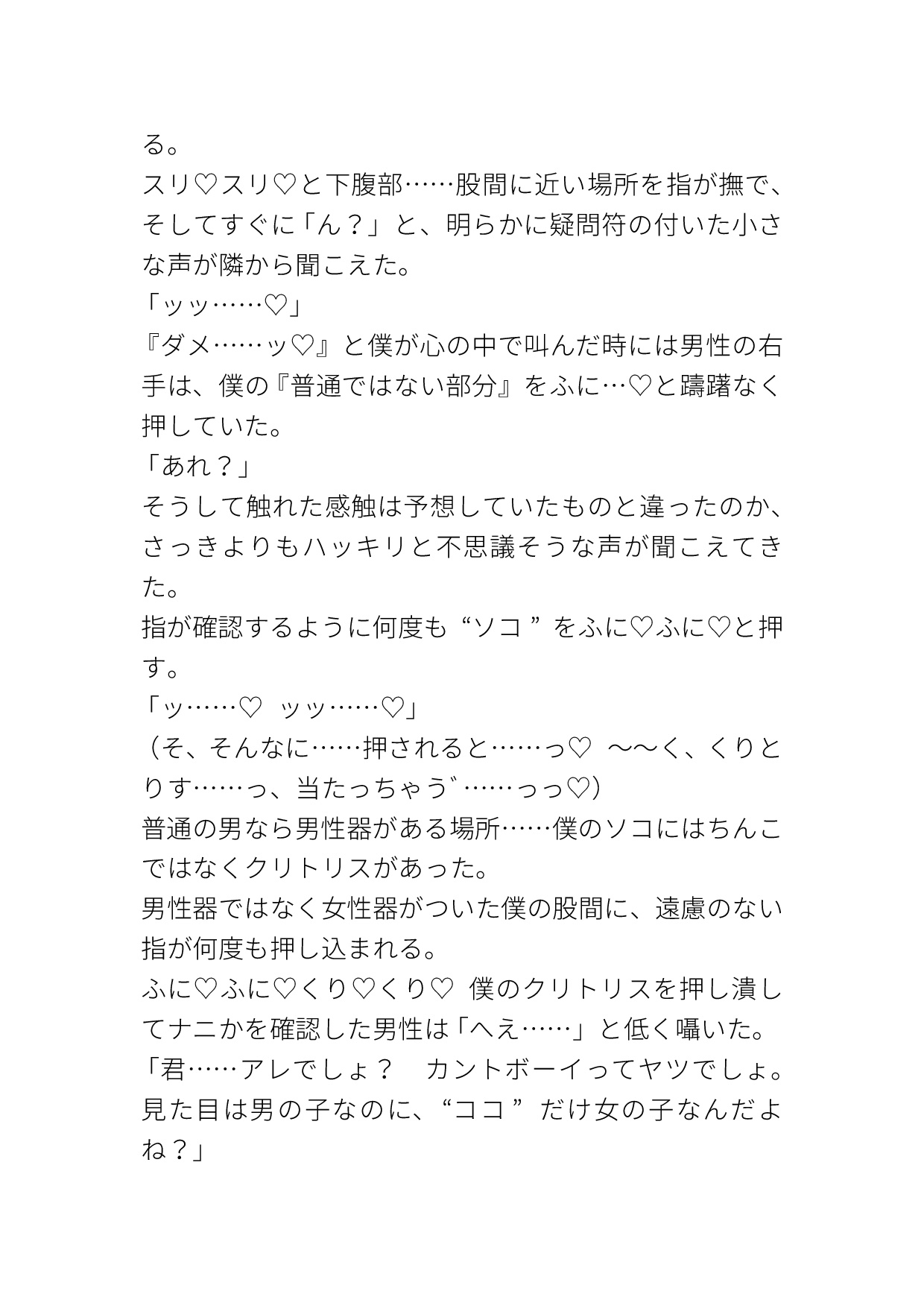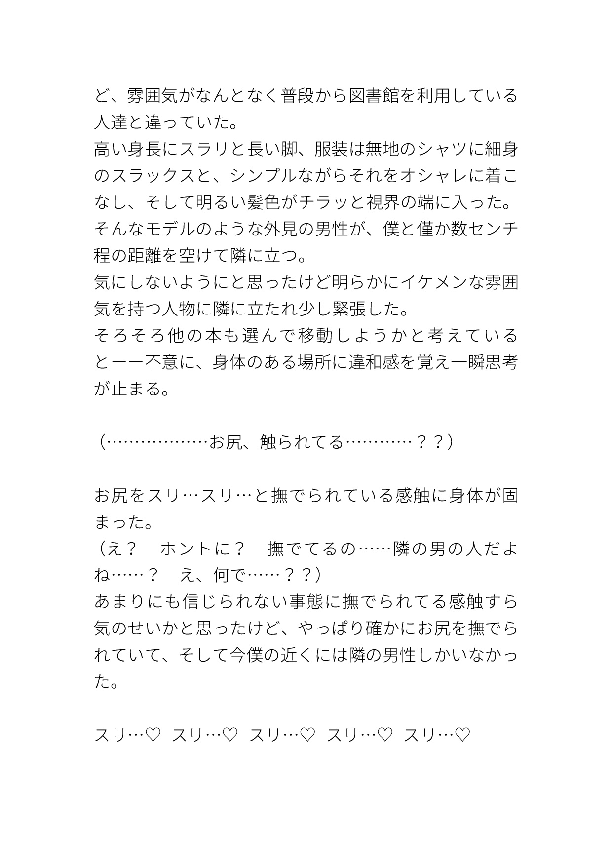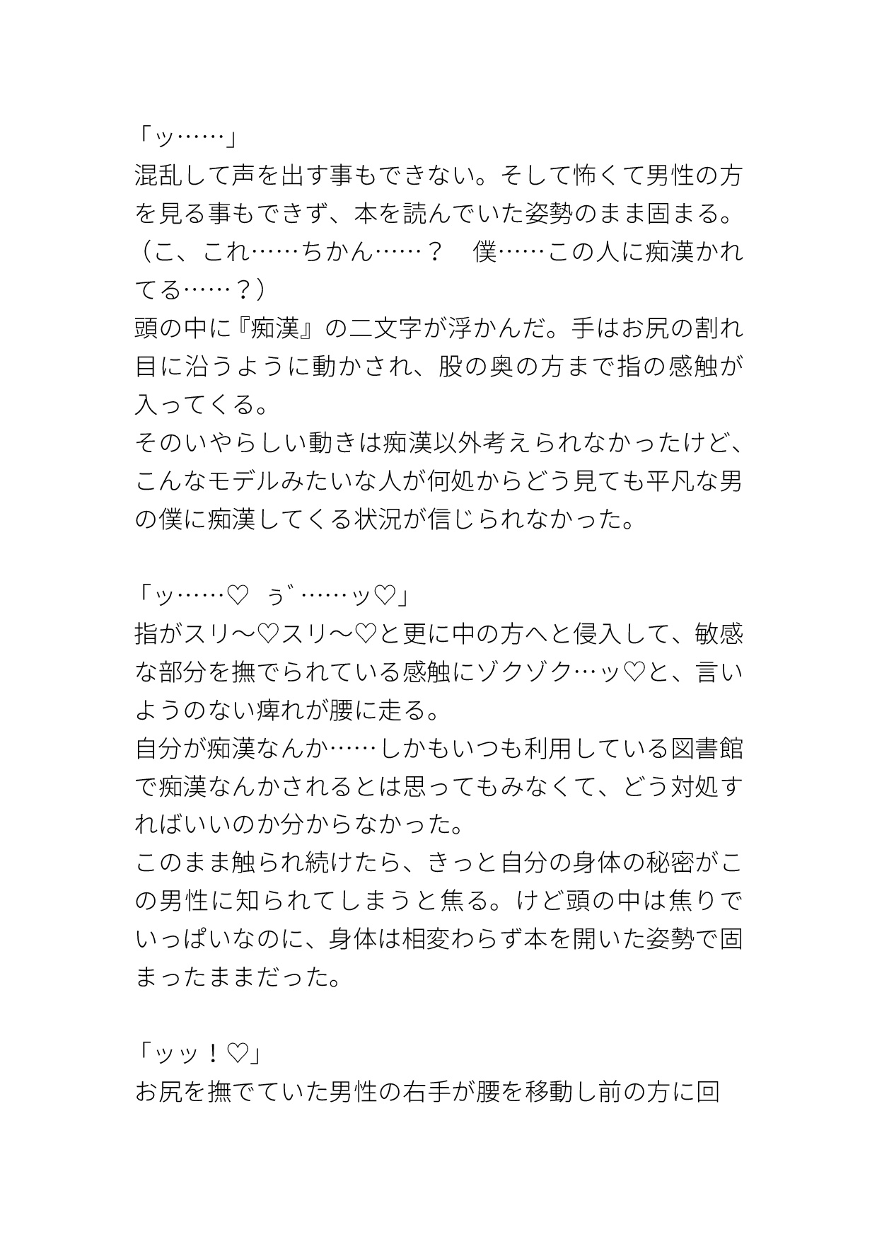 カントボーイが図書館でイケメンに中出しされてしまう話です。甘い声でたっぷりと言葉責めされながらクリトリスを弄られ、乳首を弄られ、本棚の前で立ったままイかされます。その後非常階段に移動してクリフェラされたり手マンされたりしてイかされ、手隙に掴まって後ろから挿れられ子宮に種付けされます。