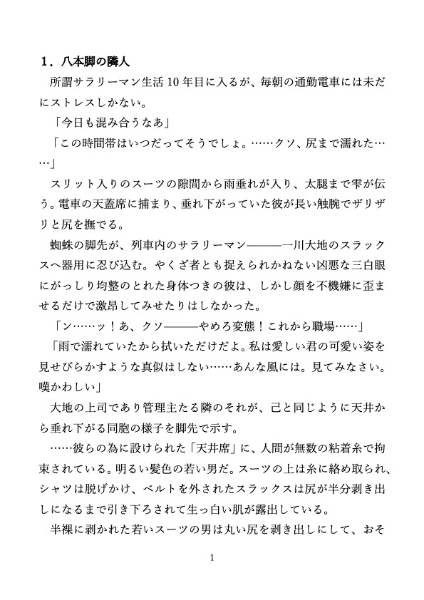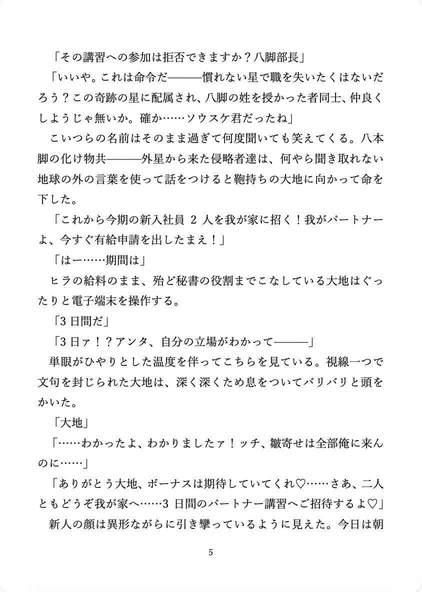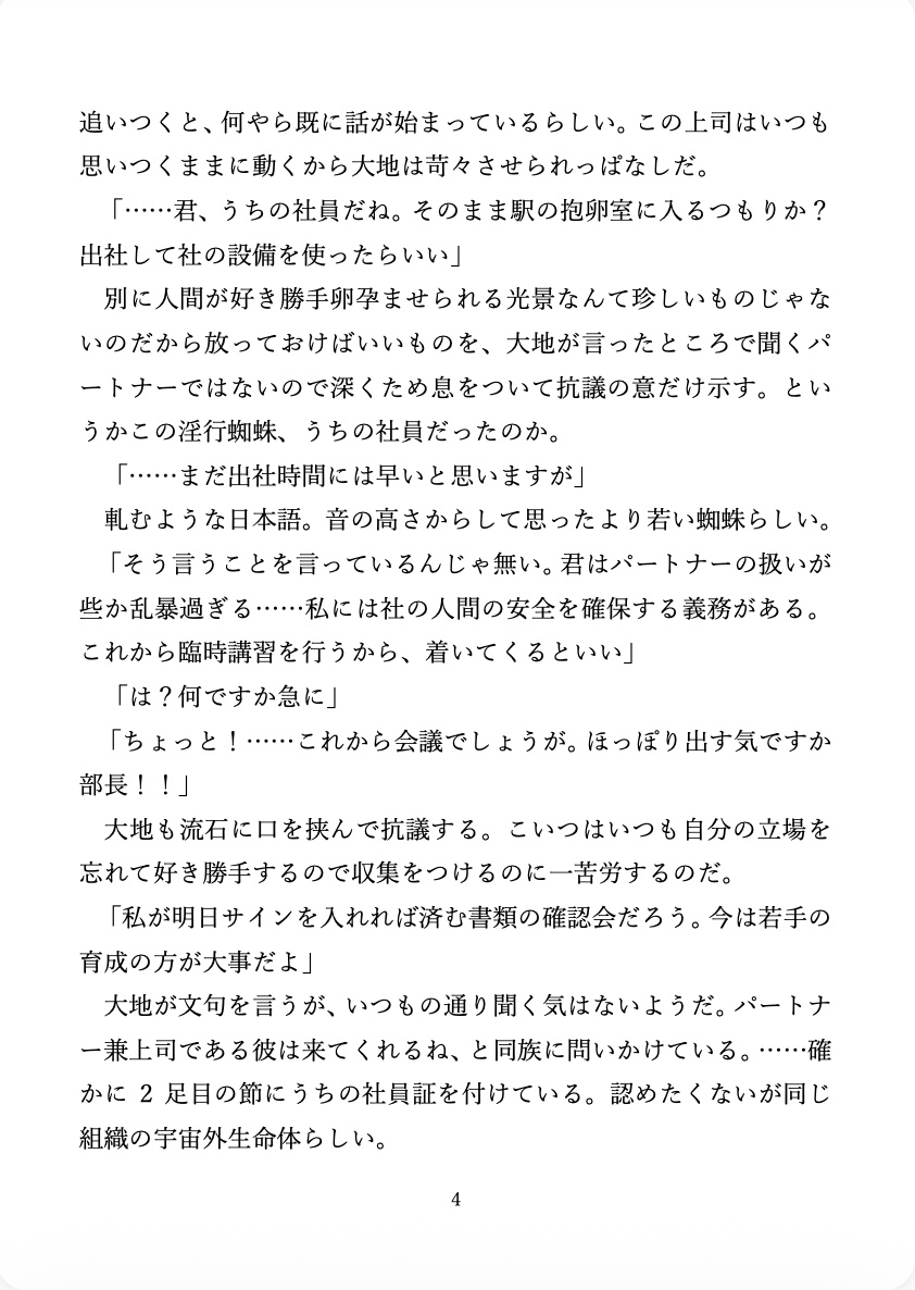———近未来、人類は蜘蛛型宇宙人と共生社会を築いていた。しがないサラリーマン一川大地(いちかわだいち)とその管理主である八脚正親(やつあしまさちか)は、通勤途中の電車内で非友好的な強○交尾を目の当たりにしてしまう。パートナーである宇宙人、八脚宗輔(やつあしそうすけ)に手ひどく当たられていた同社員の青年、双葦優人(ふたあしゆうと)を確保した正親は、上司の権限を行使して二人に「共生講習補講」を受講させるが———。