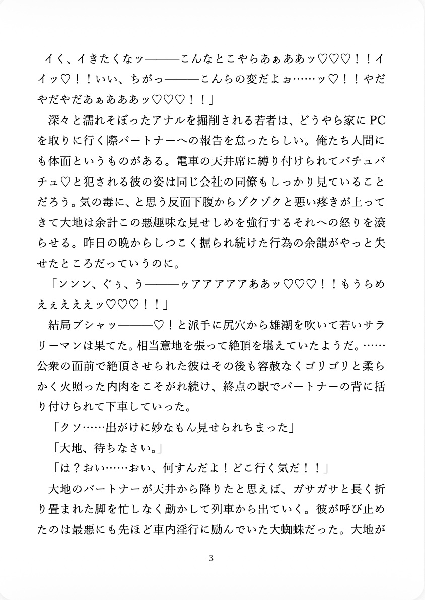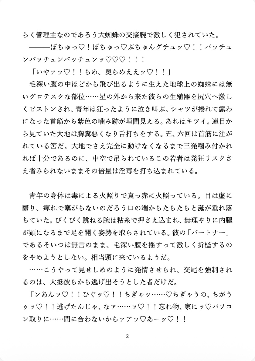 ※人類の尊厳が消失した世界※媚毒責め※粘糸による拘束プレイ※受けの腸壁に卵を植え付ける蜘蛛型宇宙人との抱卵プレイ