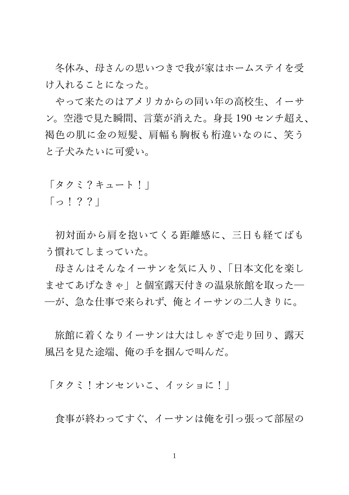 ホームステイでやって来た外国人DKに懐かれた受けが、温泉旅館でいっぱい犯される話。