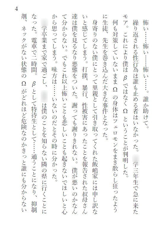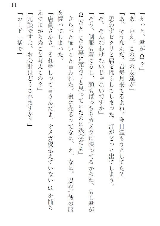 あらすじβとして生きてきた飯嶋薫。だがある日、突如としてΩへと変わる、〇学で大きなフェロモン事件になった。βからΩに変わったことで親戚の元で差別を受けながらも、勉学に打ち込み、県外の高校へ進学する。βとして生きる道を選び孤独の日々を耐え抜く彼の前に、転校生のα・古賀光樹が現れる。オメガ税を払えない中、モアを抑えることができず薬局で抑制剤を盗もうとしたところを、光樹は偶然見かけ声をかけ、代わりに抑制剤を購入してくれた。光樹は「見つけた」その一言だけ伝え、以降も薫を決して見捨てなかった。傷ついた心に忍び寄る──それは、愛か束縛か。