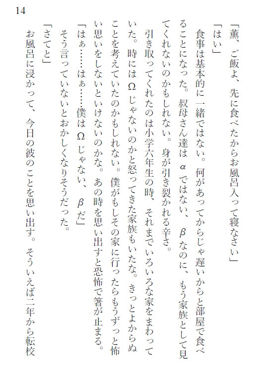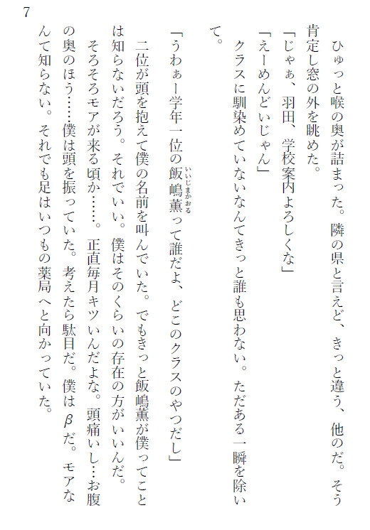 紹介文βとして生きてきた飯嶋薫は、思春期に突然Ωへと変わり、家族にも社会にも居場所を失った。県外の高校で“βとして”孤独に生きることを選ぶが、ある日、抑制剤を盗みかけた場面を転校生α・古賀光樹に見られてしまう。しかし彼は責めるどころか、薫に抑制剤を買い与え、ただ光樹は「やっと見つけた」とそう思う。