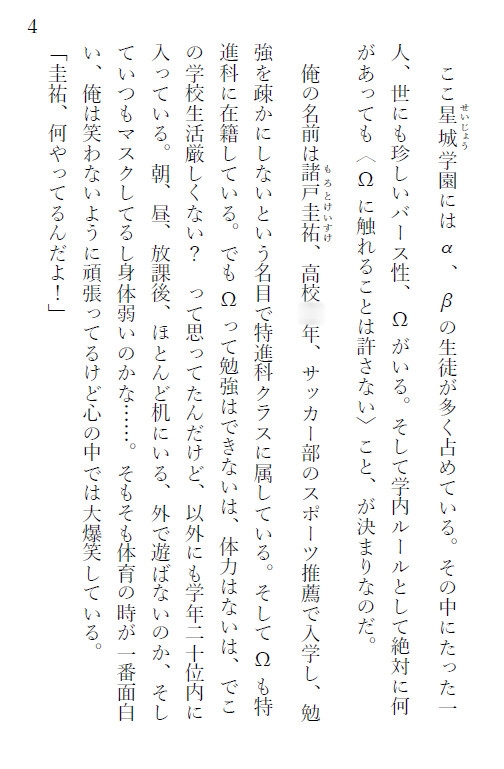 あらすじ学園唯一のΩ・赤城華には、「誰も触れてはいけない」という厳格なルールがあった。孤独を受け入れるしかないはずの彼に、密かに心を寄せるα・諸戸圭祐。サッカー部のエースである彼は、どうにか赤城に近づこうと放課後にデートを仕掛け、諦めることなく想いを伝え続けていた。