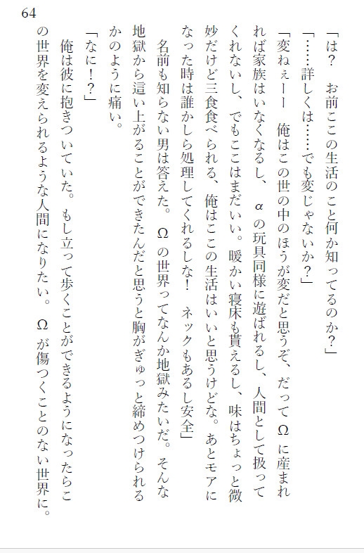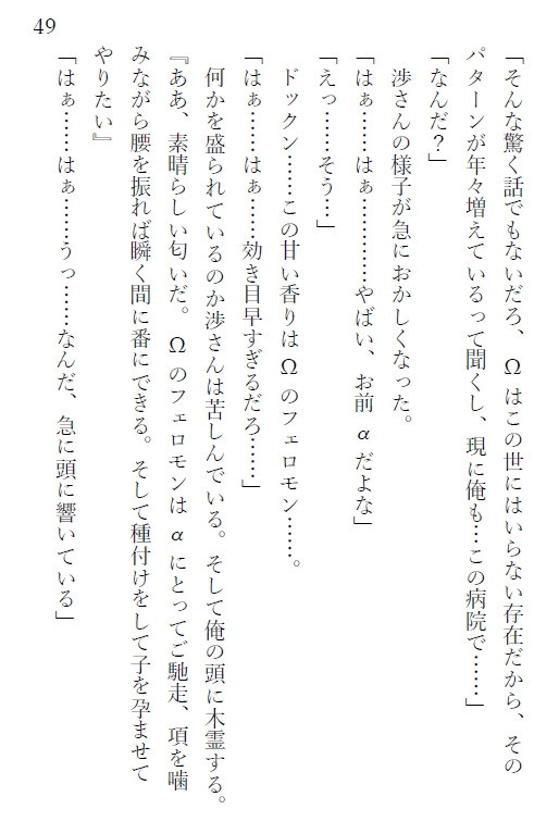 含まれるプレイなどオメガバース/ダークファンタジー/シリアス/サスペンス / ミステリー/闇医者 / 医療/閉鎖病棟/裏社会/人体改造 / 変異/洗脳 / 操作/転換(α→Ω)/執着 / 狂愛/監禁 / 隔離/追跡・逃走/トラウマ・心的負荷/ハピエン/無理矢理/モブかん/レイ○/孕ませ/Ω×α/α×α/α×Ω