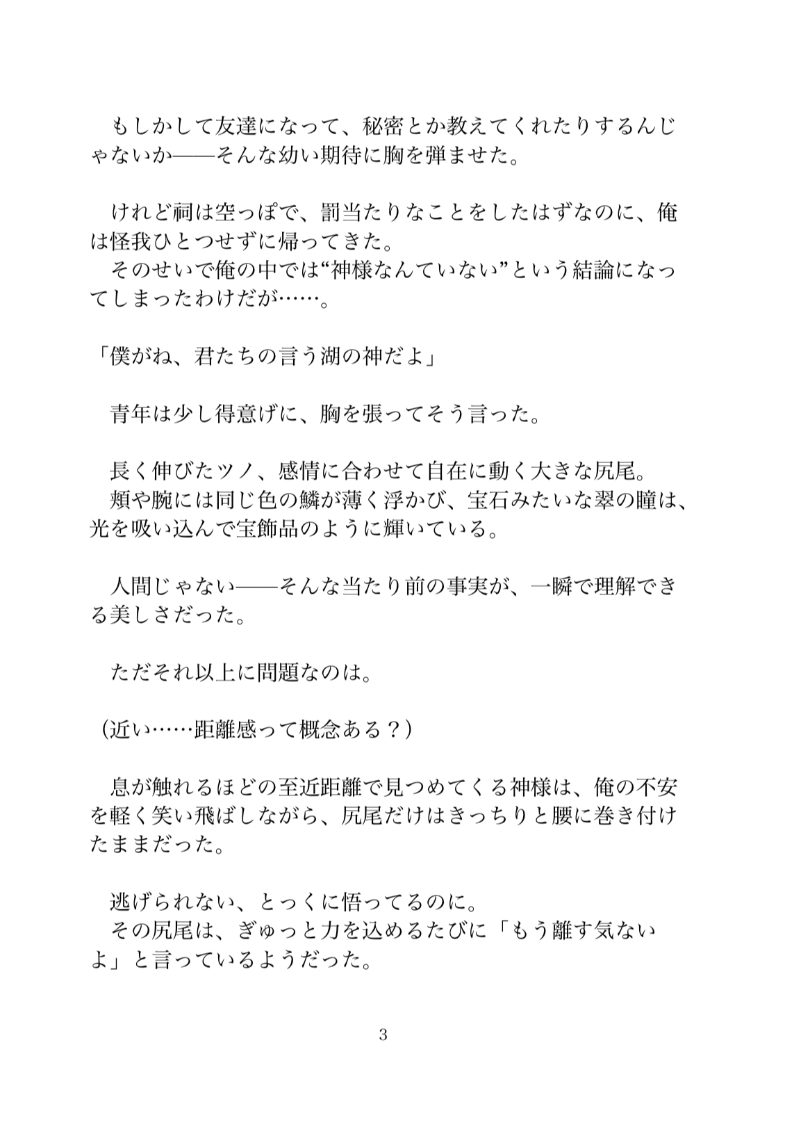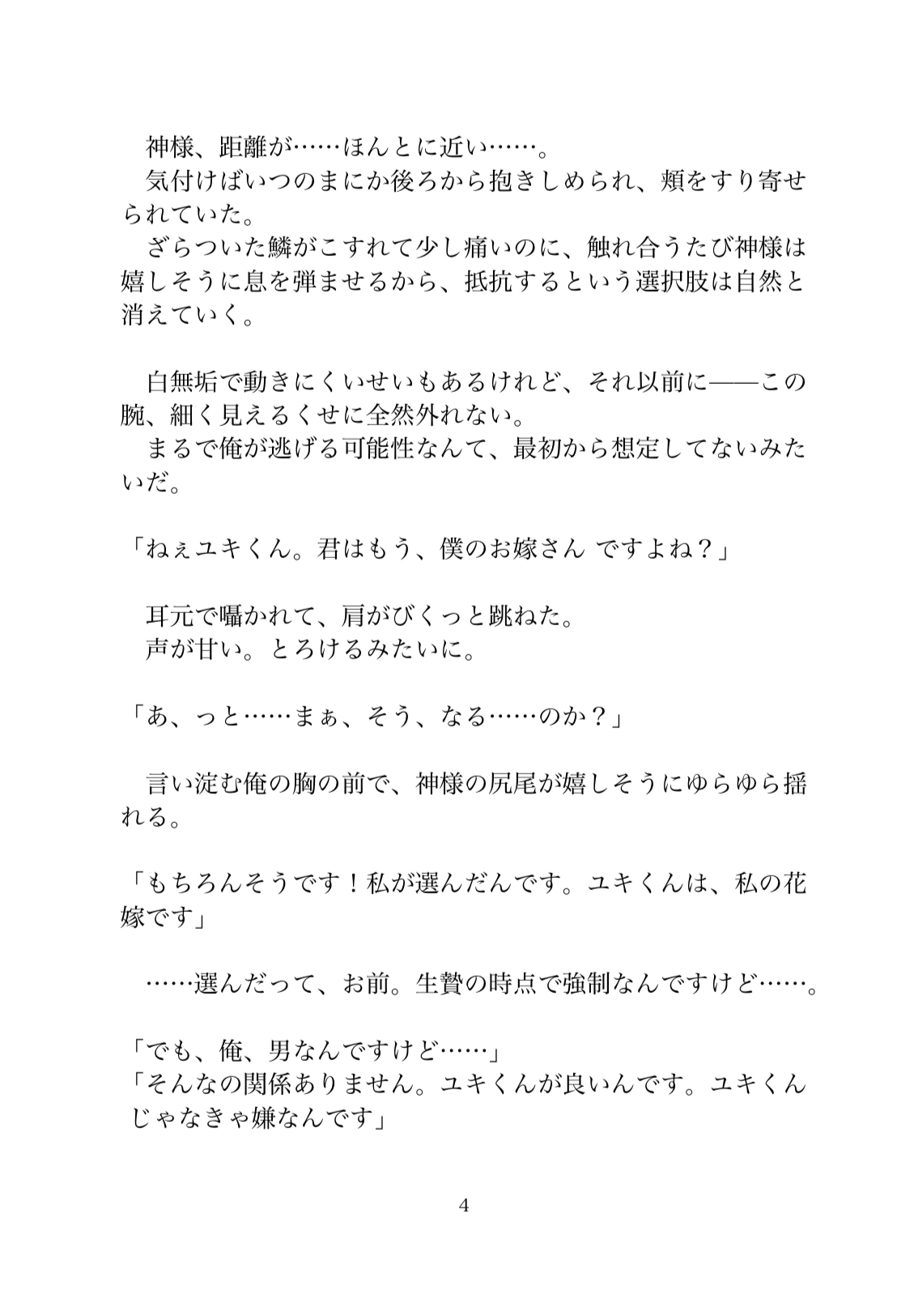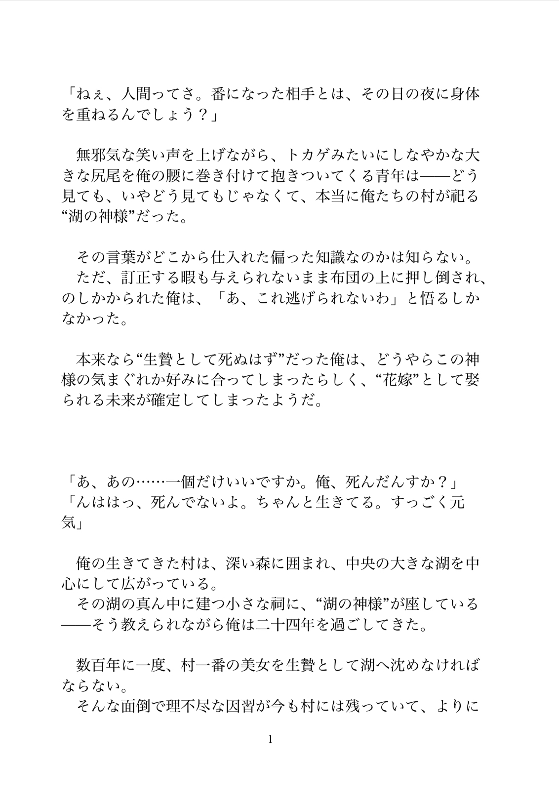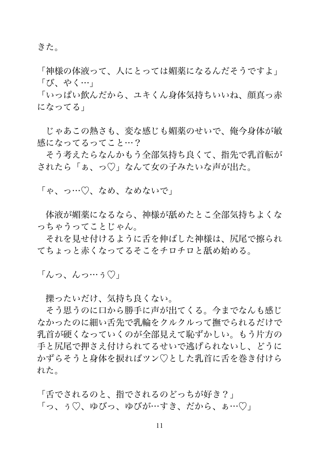 村の掟として、生贄として捧げられた男。てっきり自分は死んだのかと思っていたが、目が覚めた先には神様を名乗る青年が。出会ったことがないはずなのに、何故かその神様に気に入られていた青年は、流されるまま神様と花嫁として抱かれることに……!神様の唾液は媚薬で、尻尾は気持ち良くて、舌は細長くて尿道まで入ってきちゃう!?童貞にいきなりハードルが高すぎる!人外いちゃラブセックス!!