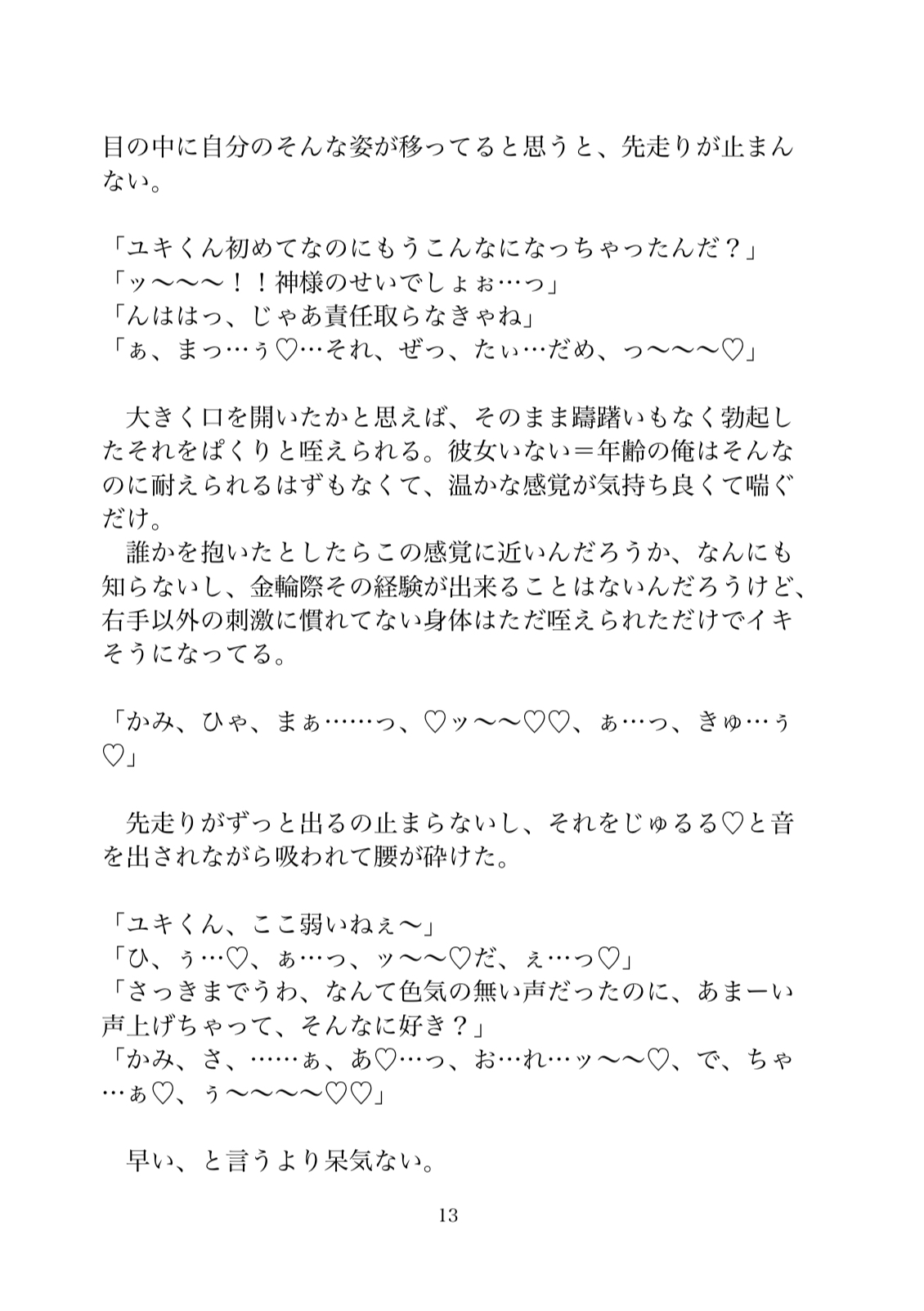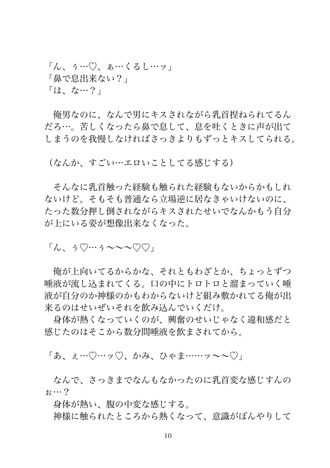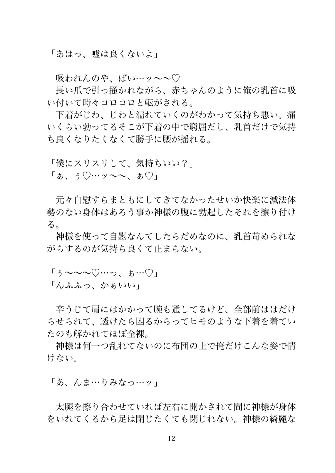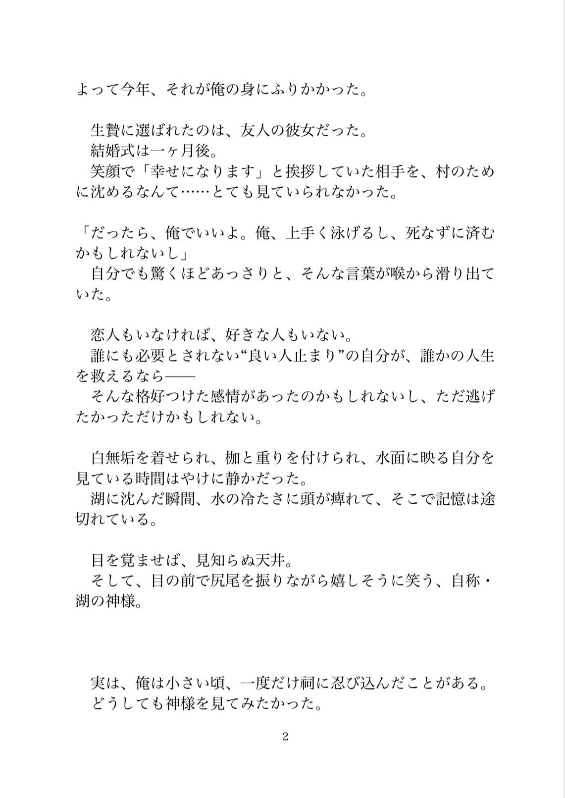 村の掟として、生贄として捧げられた男。てっきり自分は死んだのかと思っていたが、目が覚めた先には神様を名乗る青年が。出会ったことがないはずなのに、何故かその神様に気に入られていた青年は、流されるまま神様と花嫁として抱かれることに……!神様の唾液は媚薬で、尻尾は気持ち良くて、舌は細長くて尿道まで入ってきちゃう!?童貞にいきなりハードルが高すぎる!人外いちゃラブセックス!!