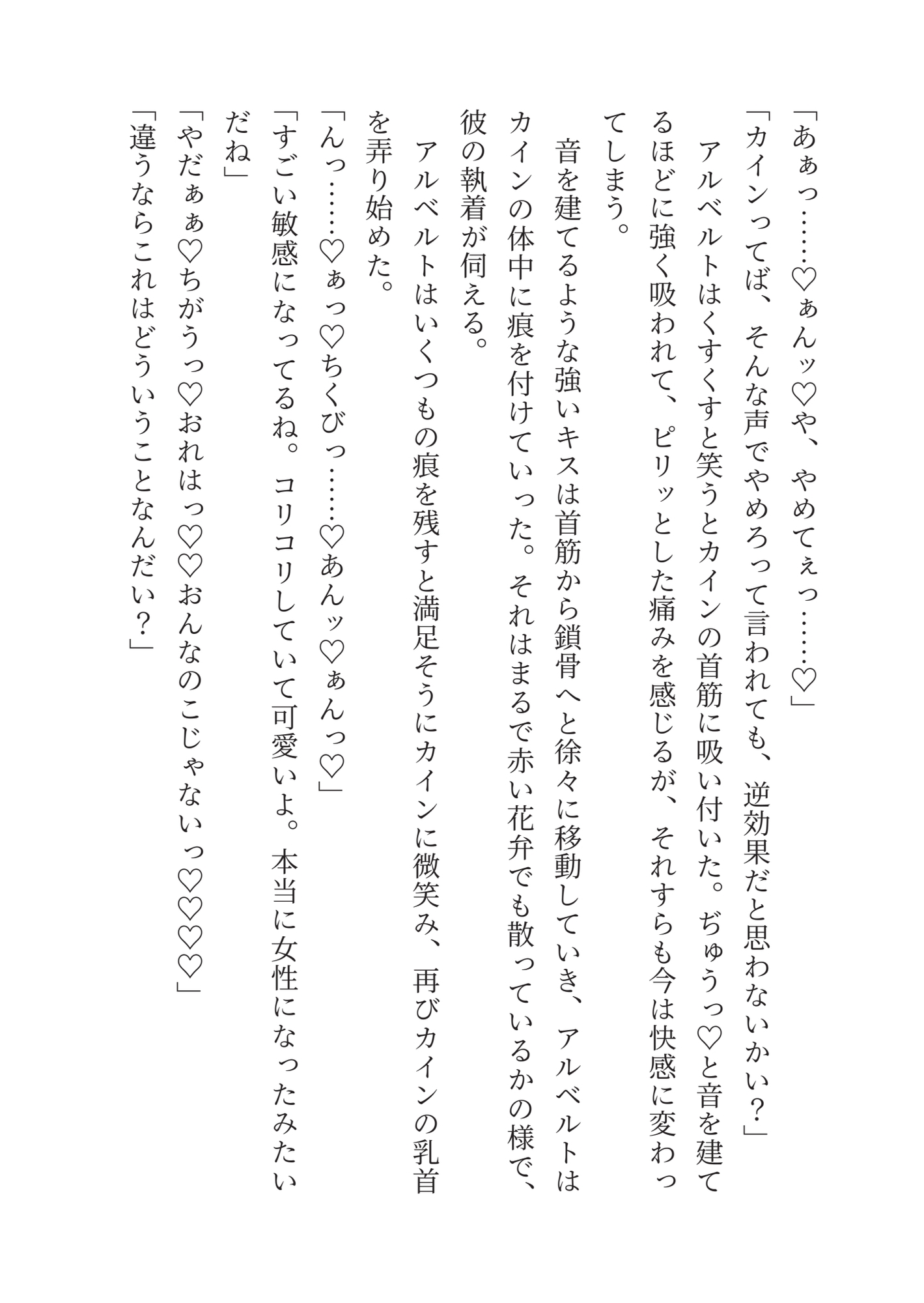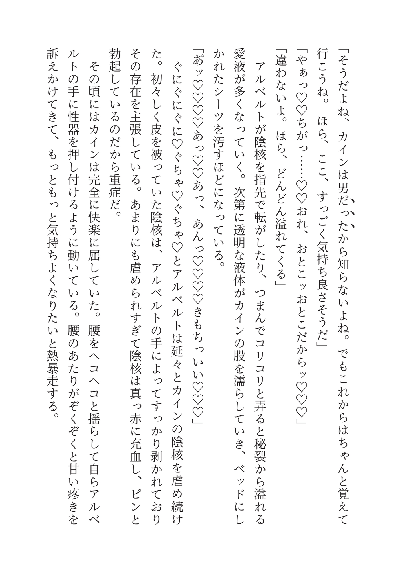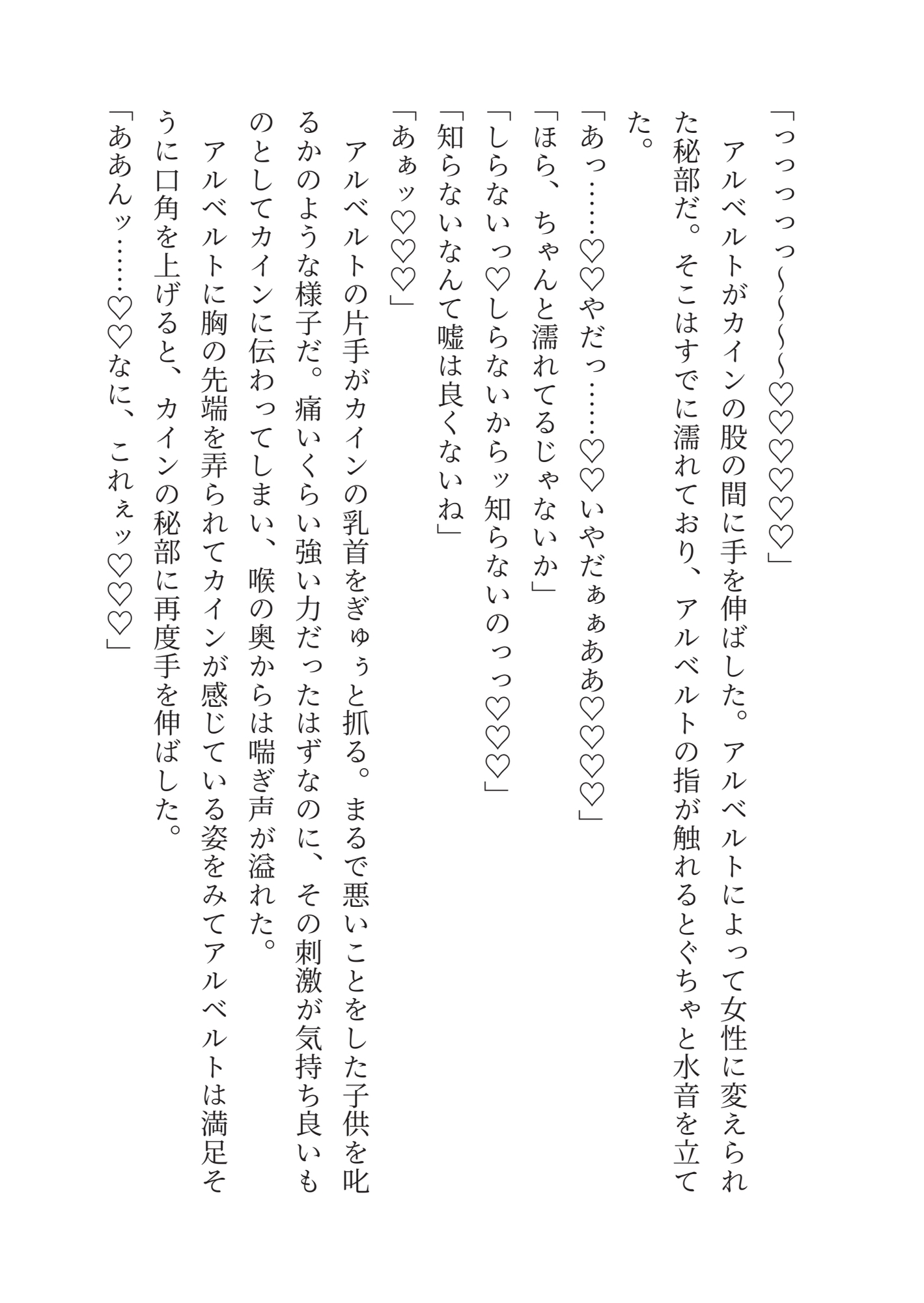 しかし卒業を期に実家に帰ると言うカインをアルベルトは襲う。カインを攫って屋敷に閉じ込めたアルベルトはカインを妻にすると宣言した。男だからそれは叶わないというカインに、アルベルトは男の体を下半身だけ女の子にしてカントボーイ化したと言い張り。