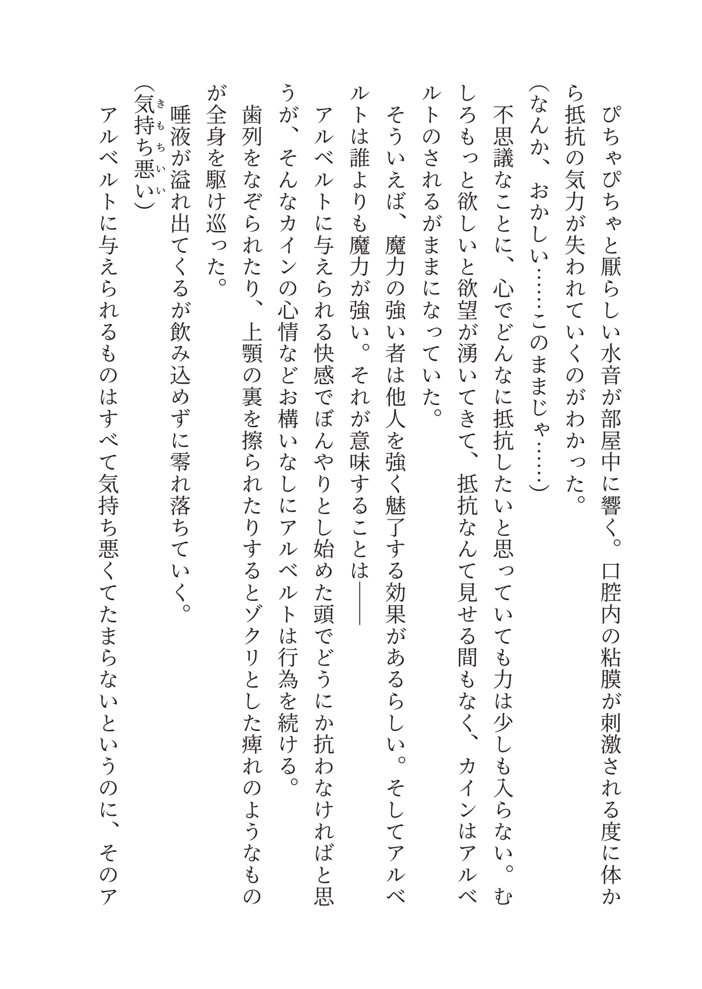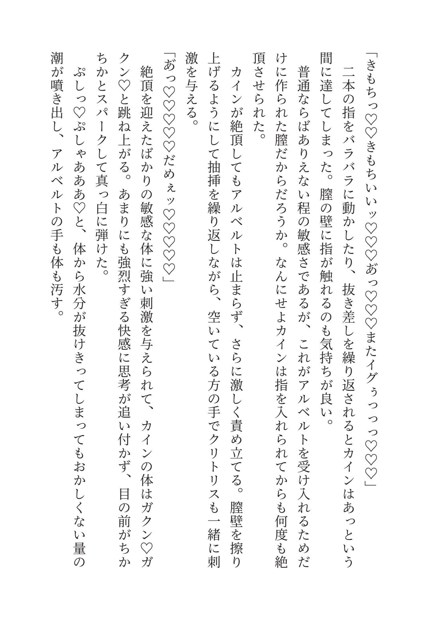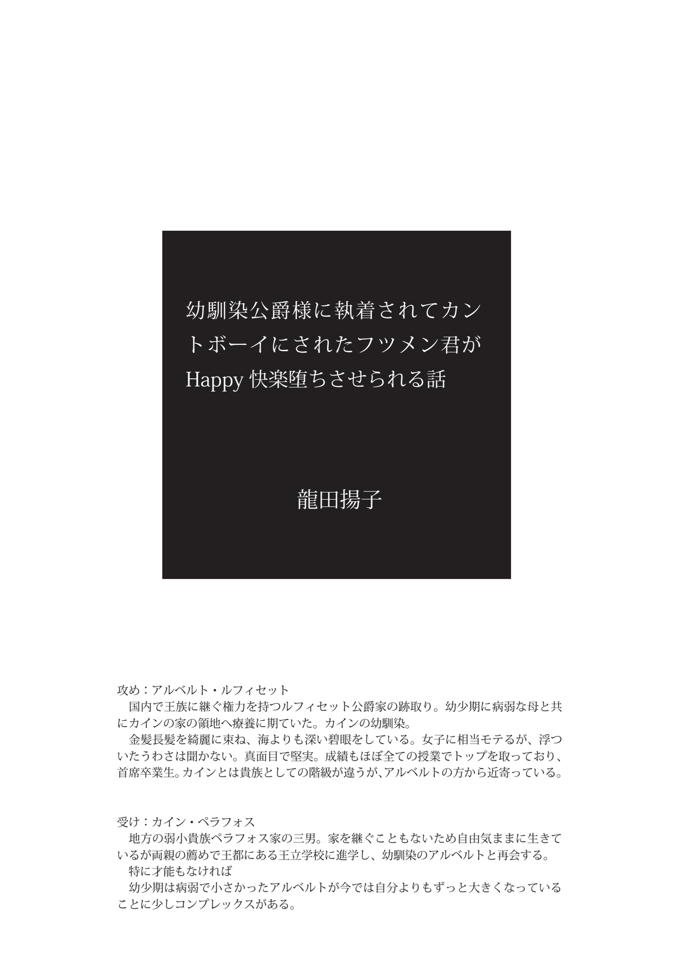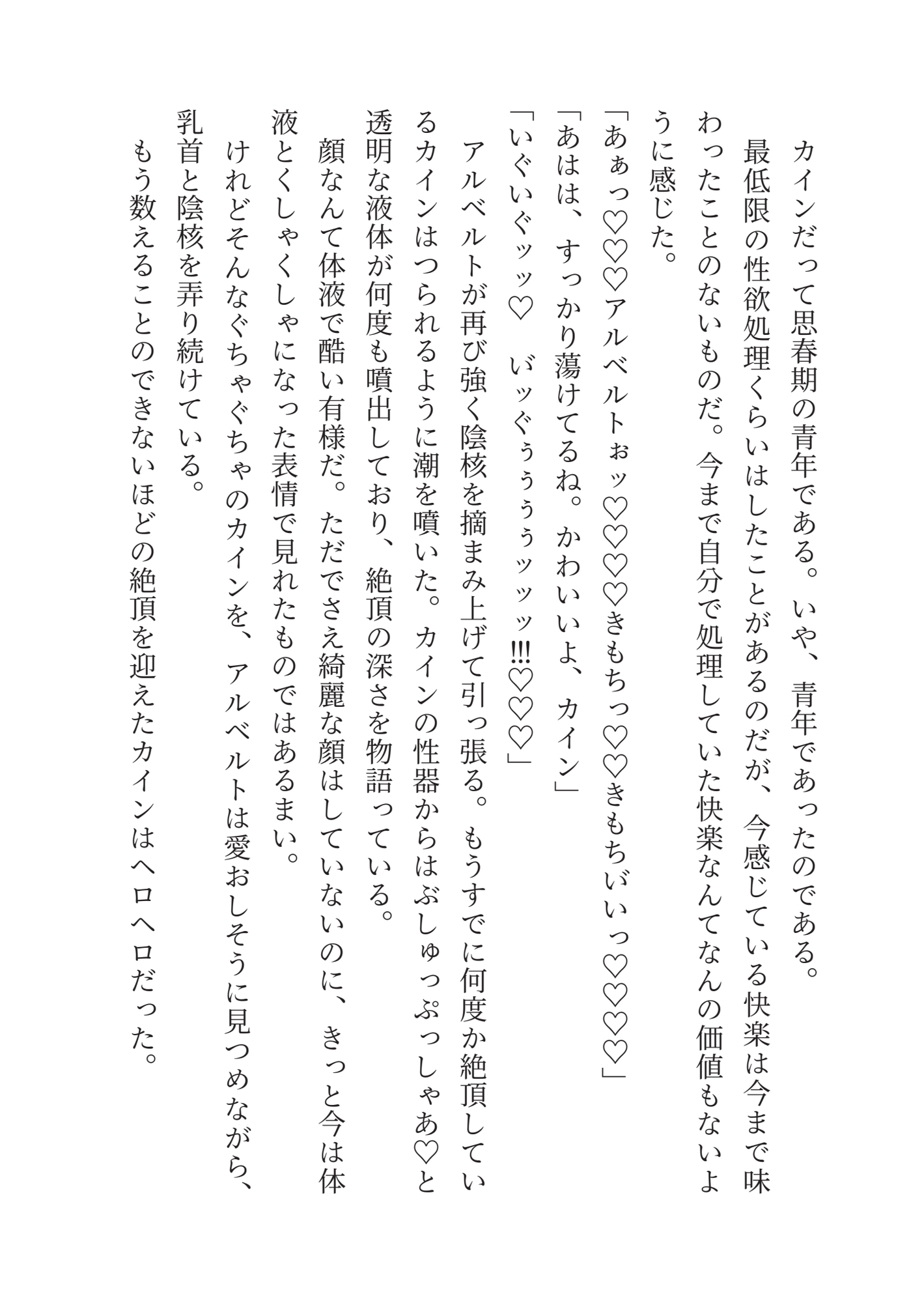 しかし卒業を期に実家に帰ると言うカインをアルベルトは襲う。カインを攫って屋敷に閉じ込めたアルベルトはカインを妻にすると宣言した。男だからそれは叶わないというカインに、アルベルトは男の体を下半身だけ女の子にしてカントボーイ化したと言い張り。