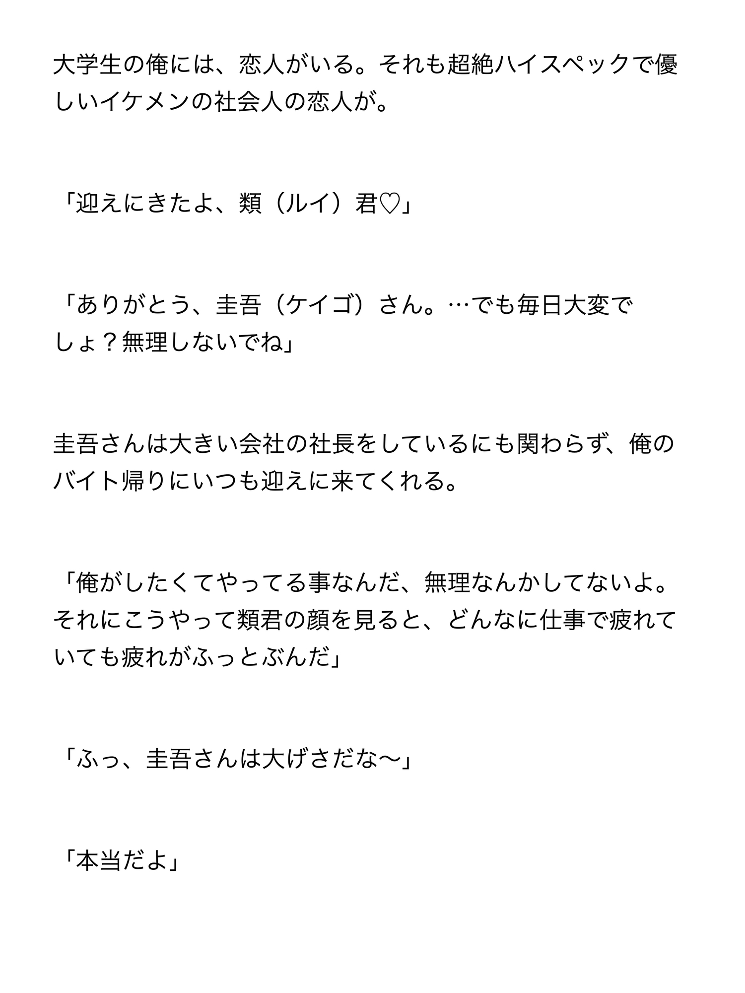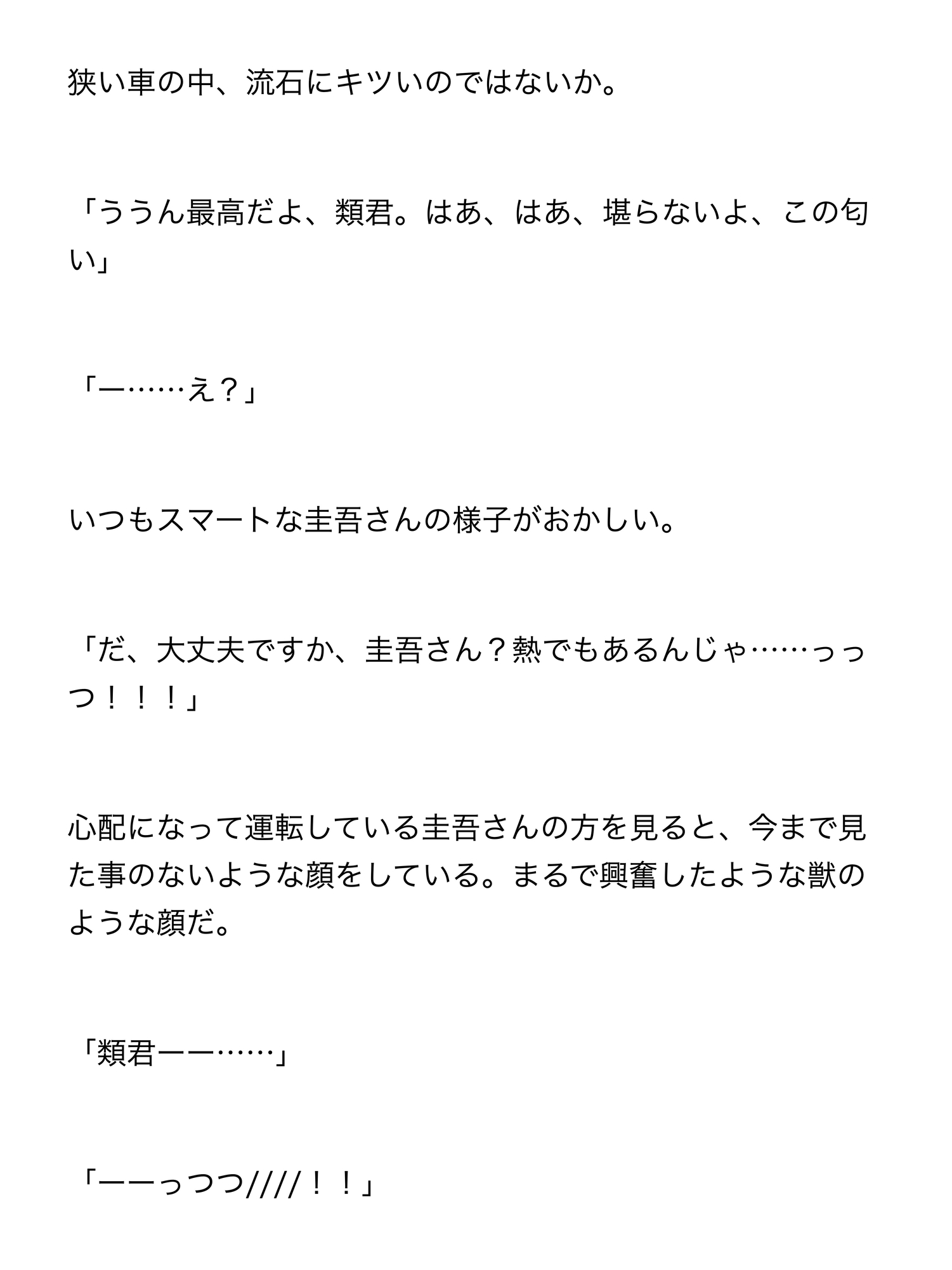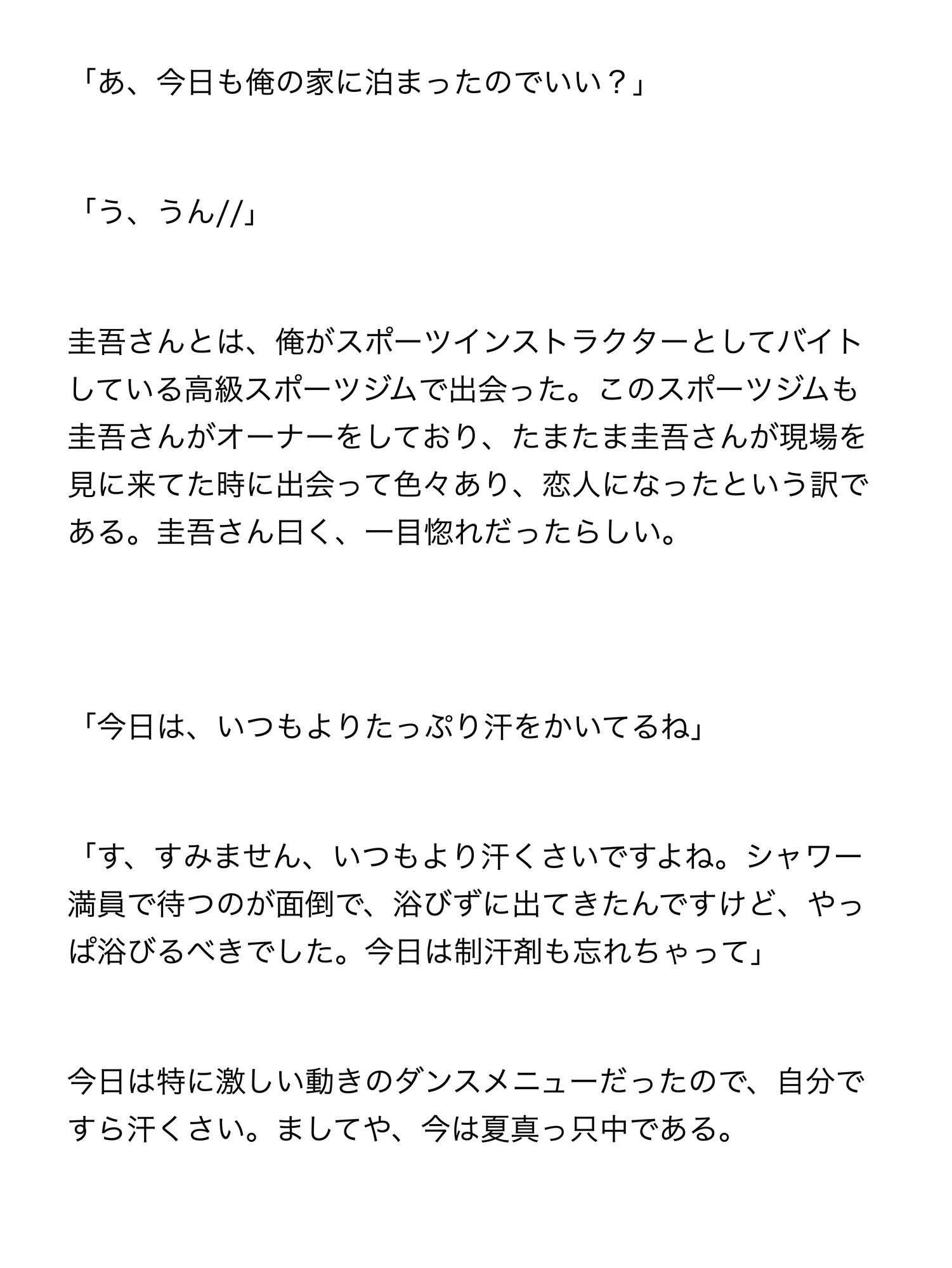 普段は優しい社会人の彼氏が汗の匂いに興奮して豹変し、車の中で朝まで中出し連続絶頂されまくる大学生の話です。攻めが汗フェチの変態で、少しヤンデレっぽい感じです。首絞め表現などがあり、SMっぽい描写もございます。