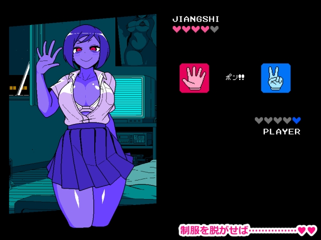 18禁ドット絵野球拳ゲーム今回の相手はホラービデオの中から現れたデカパイ美女「キョンシー」!グー・チョキ・パーのいずれかを選んで対戦します。どちらか先に4回勝つと勝負が決まり、プレイヤーが勝つ度に相手は服を1枚脱いでいきます。1ステージ目で長袍(チャンパオ)を脱がし、2ステージ目ではお札の下着を脱がして全裸に・・・!ステージをクリアする度に「ティッシュタイム(エロアニメ)」に突入!一度ステージをクリアすると『エロモード』で、いつでもキャラの脱衣やエロアニメ等の閲覧が可能です。