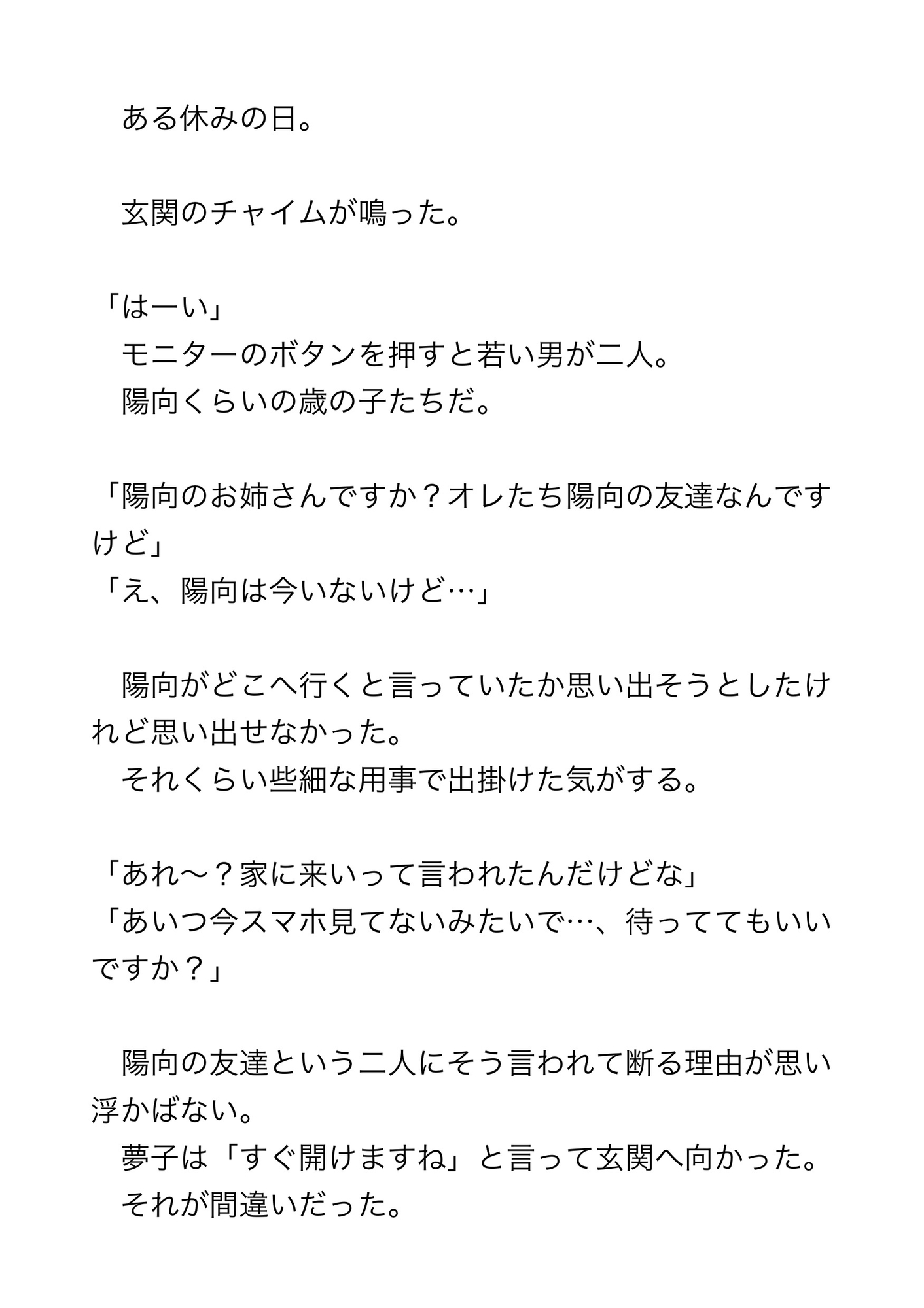 そんな陽向の友人二人が家を訪ねてきた。陽向と待ち合わせしているものの、連絡がつかないと言う。家で待っていてもらおうと二人に家に上がってもらった夢子だったが、家に入れるなり後ろから抱きしめられた。