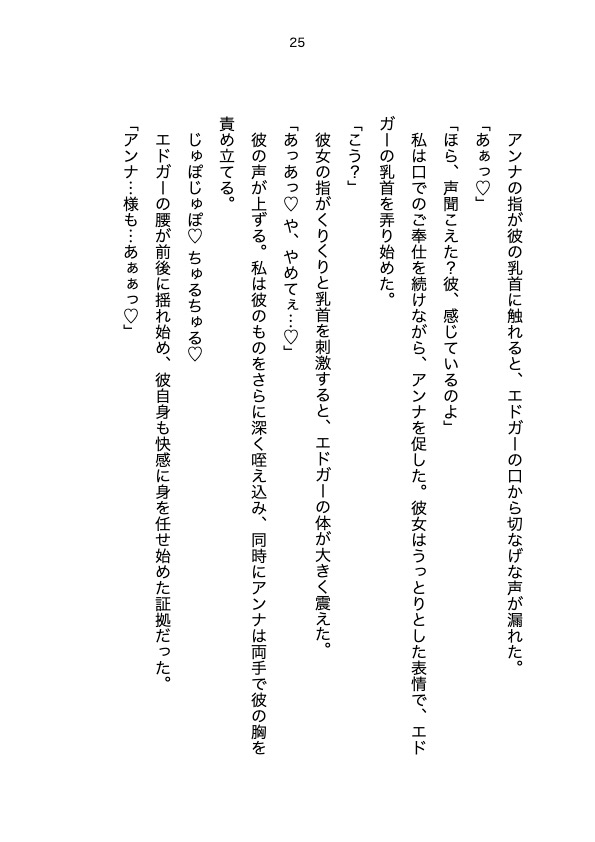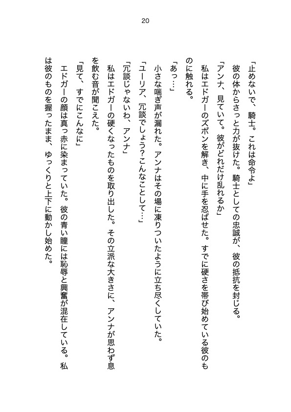 【あらすじ】美貌と聡明さで名高いユーリア・フォン・アルトシュタイン公爵令嬢の護衛騎士として仕える金髪碧眼の騎士エドガー。昼間は完璧な騎士として振る舞う彼だが、一ヶ月前からユーリアと秘密の関係を持ち、二人きりになると理性を忘れる獣と化していた。ある雨の日、城壁の塔で愛し合う二人。だが、ユーリアには騎士をさらに堕とす計画があった—。友人のアンナ侯爵令嬢を晩餐会に招き、エドガーの淫らな素顔を見せる機会を作る。戸惑いながらも、アンナの前で快感に溺れるエドガー。最初は見るだけだったアンナも、次第に興味を持ち始め…。やがて二人の貴婦人に囲まれた騎士は、敏感な乳首を同時に責められ、見られる恥辱と快感に腰の動きが止まらなくなる。「エドガー、もっと腰を振って」ユーリアの命令と、アンナの愛撫。視姦する視線に興奮し、いつもより硬く大きくなったものをユーリアの中で激しく脈打たせる。高潔だった騎士は、もはや快楽には抗えず、二人の貴婦人に完全に堕ちていく—。
