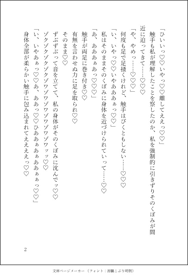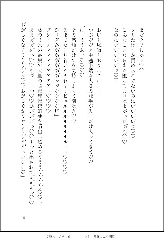 最後は子宮を限界まで疼かされていたことにあなたが気付いたところで、触手の責めが一斉に止まる。子宮の疼きを解消するには自分から挿入せざるを得ない状況になり…抵抗する。が、それが触手の気を害したのか、手足を縛られ、絶頂を焦らしに焦らされ、絶頂しか考えられない状態でついに屈服し自分から挿入した瞬間、眼前に24時間の謎の時間制限が表示される。その長さに絶望しながらも、これを耐えれば出られる可能性を信じるが、調教レベルが進み、最後の8時間は【潮吹き300回】をノルマに潮吹きアクメ地獄。気絶と覚醒を繰り返し24時間連続絶頂を迎えるが……その瞬間、解放されるのでは無く下の層に落ちて……。さらには普通の触手チンポより何倍も快楽を与える新たに回転機能のついた極太イボイボ触手チンポを導入され、絶望しながらさらに強まる快楽に逃げられないと悟ったあなたは、ついに快楽堕ちしてしまう。