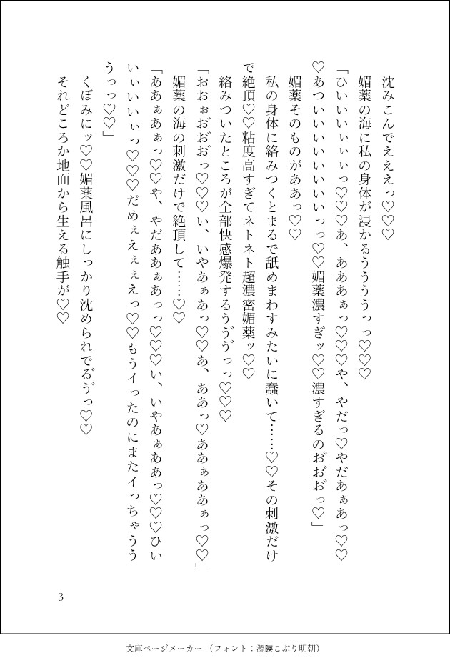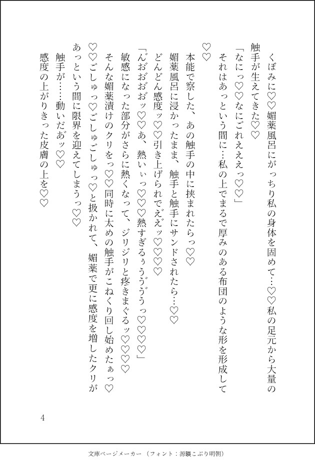 媚薬風呂に入った瞬間、終わらない肌と媚薬が触れるだけで終わらぬ潮吹き絶頂に襲われる。そんな中で身動き取れぬように触手布団があなたに襲いかかりーーー全身余すことなく触手がびっしりとくまなく覆い、今までの調教が児戯出会ったと思えるほどの、あなたがどれだけ謝っても屈服しても終わらない…常に毎秒えげつない絶頂