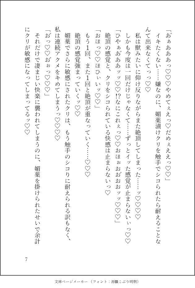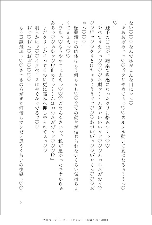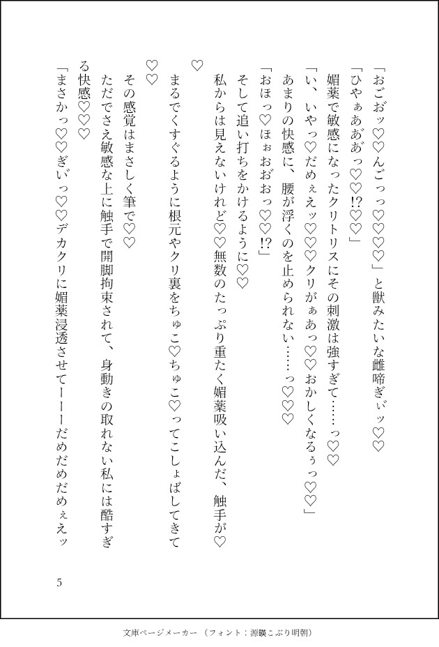触手クリ扱き、イボイボ細触手でのクリ横責め、クリをブラシ触手責めと、着実に過激に強い快楽を与えるクリ責めをされ、【処女を奪わない】魔法のかかった、媚薬をたっぷりまとわせた触手肉棒によって膣内でも幾度も深く連続潮吹き絶頂。