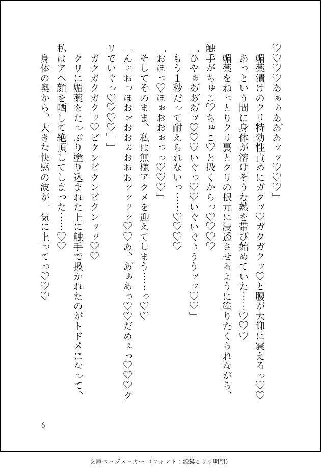 触手チンポで素股しながら媚薬スライムによる尿道開発と、媚薬責め触手チンポによるアナル開発、乳首には吸引振動触手、メインのクリには媚薬浸透されながらクリ剥きにより、何度も深すぎる絶頂を迎えるあなた。