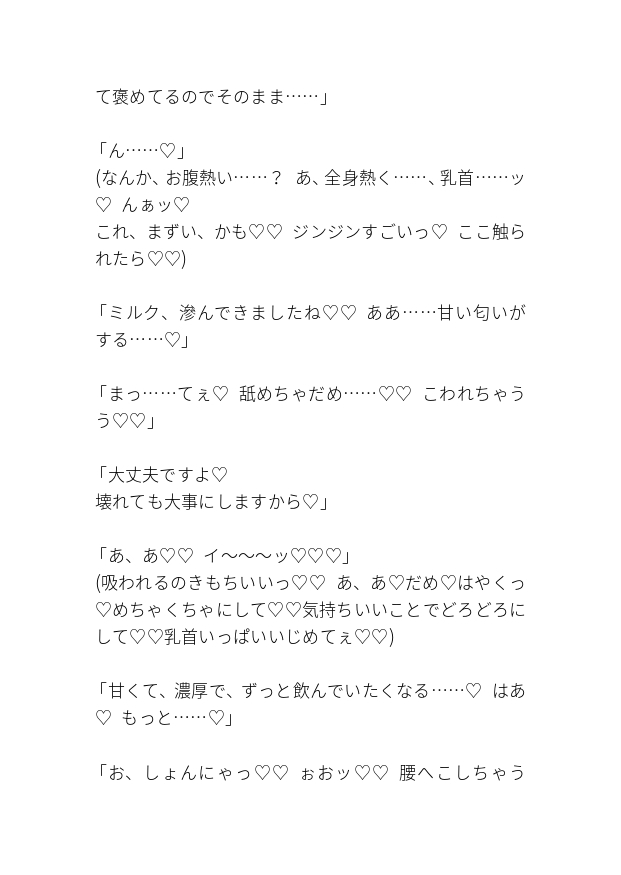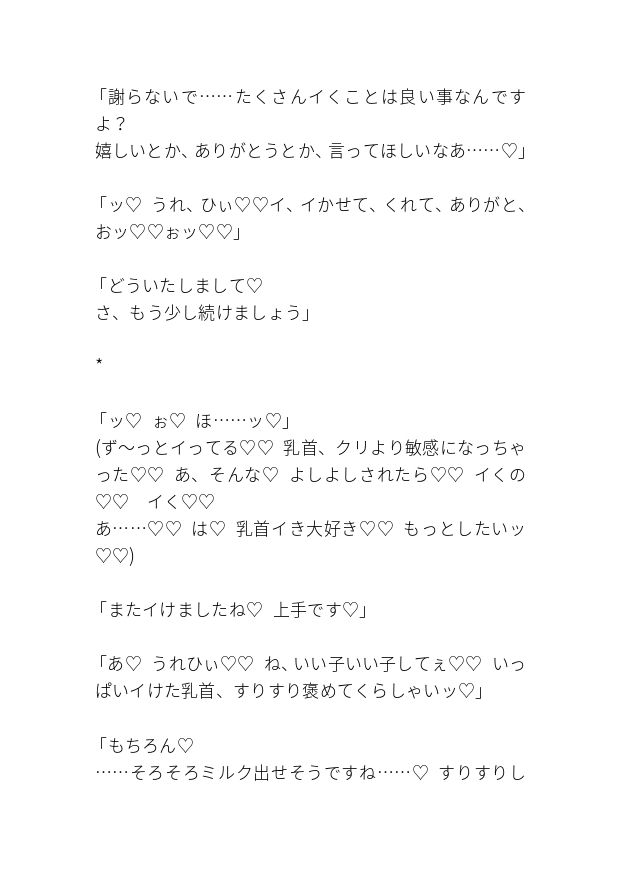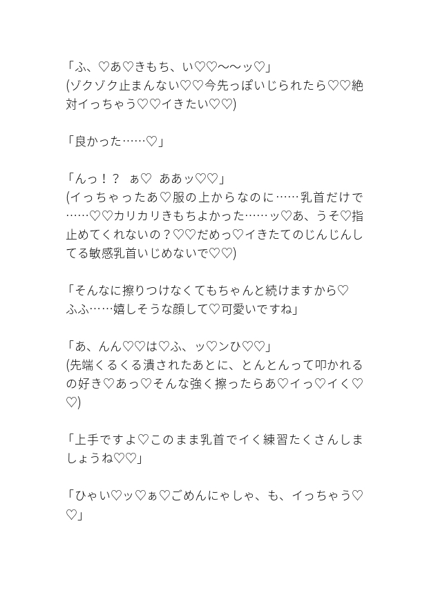 乳首責めメイン、本番と中出しあり、睡眠○、開発。♡喘ぎ、会話分のみです。全文およそ6000文字。ほとんどえっちしてます。当サークルでは主人公が嫌がることはしません!基本のり気です。