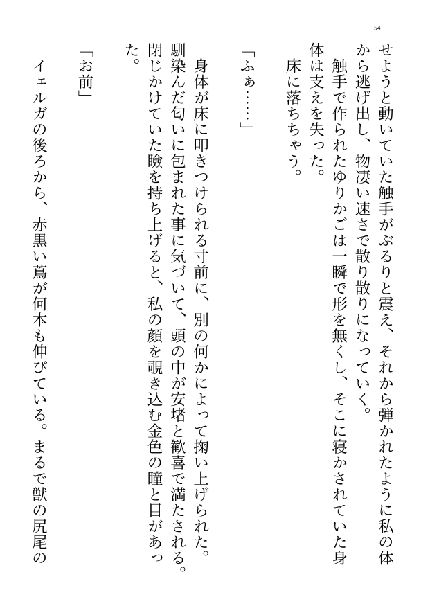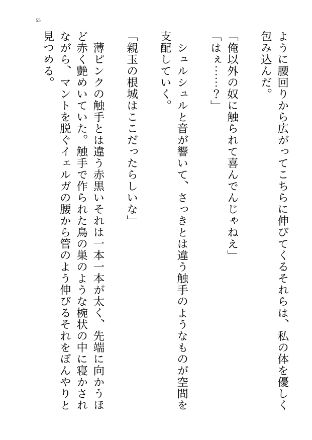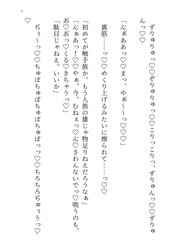 ----※野生の触手は退治されます。本編途中退場です。メインは人型(触手族×人族)同士で、触手での責めと人型での責めは本編中5:5ぐらいの比率です。指や舌も使います。過去作と比べると男の口がだいぶ悪いです。
