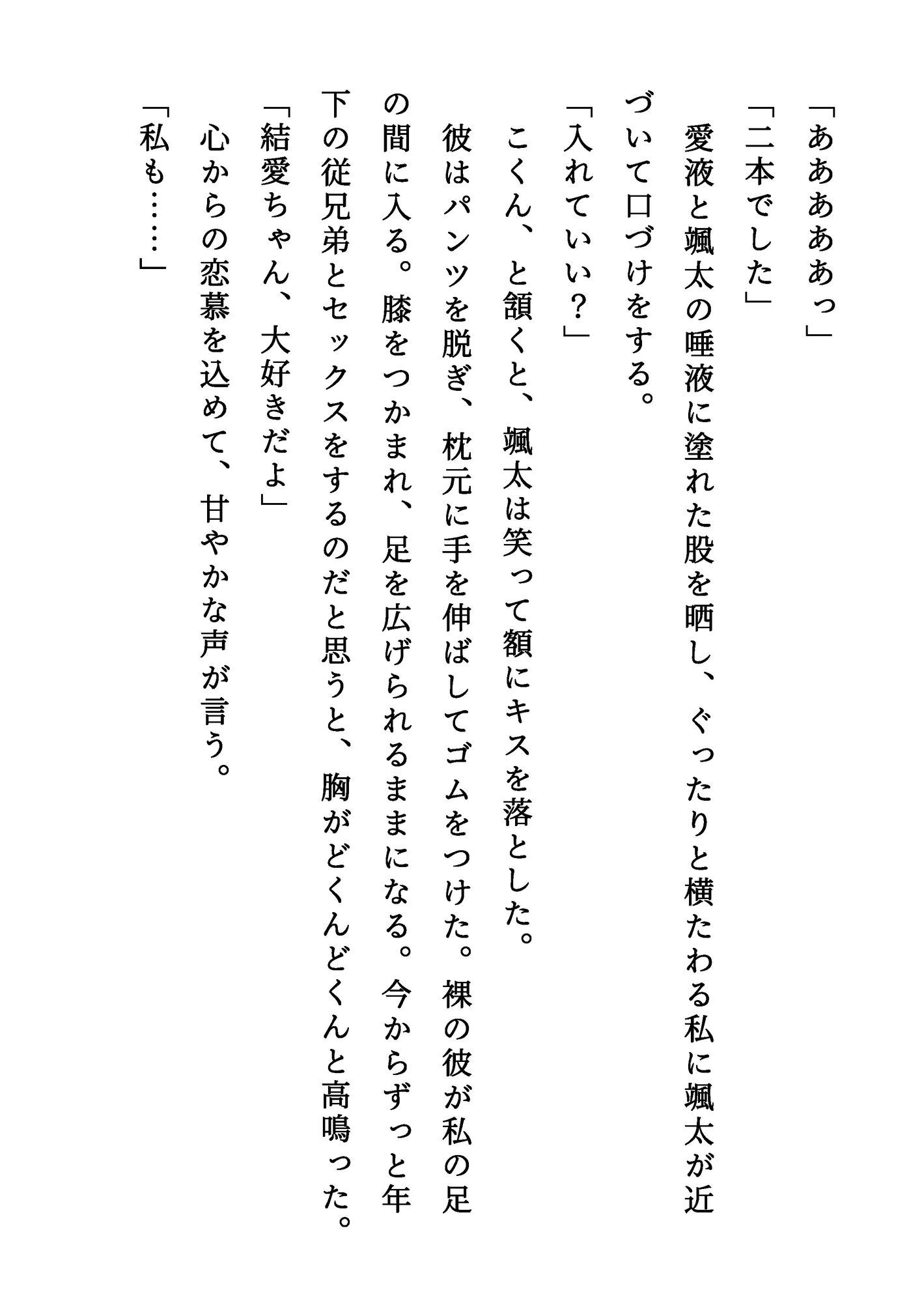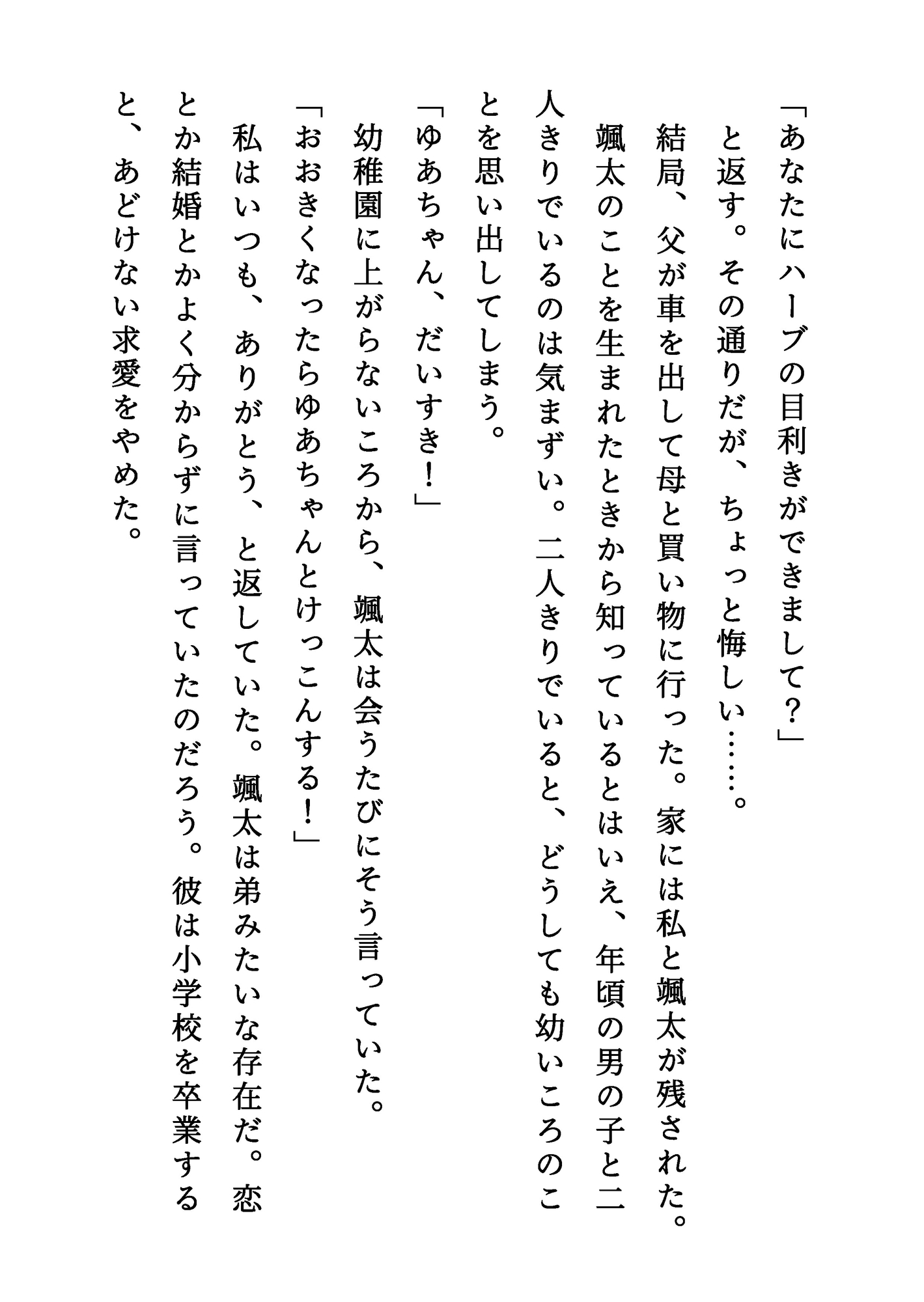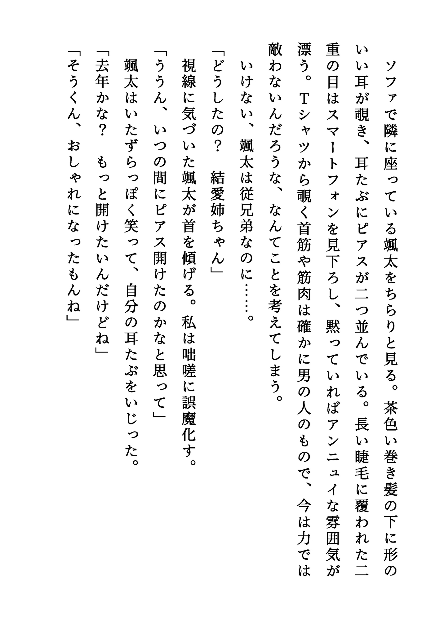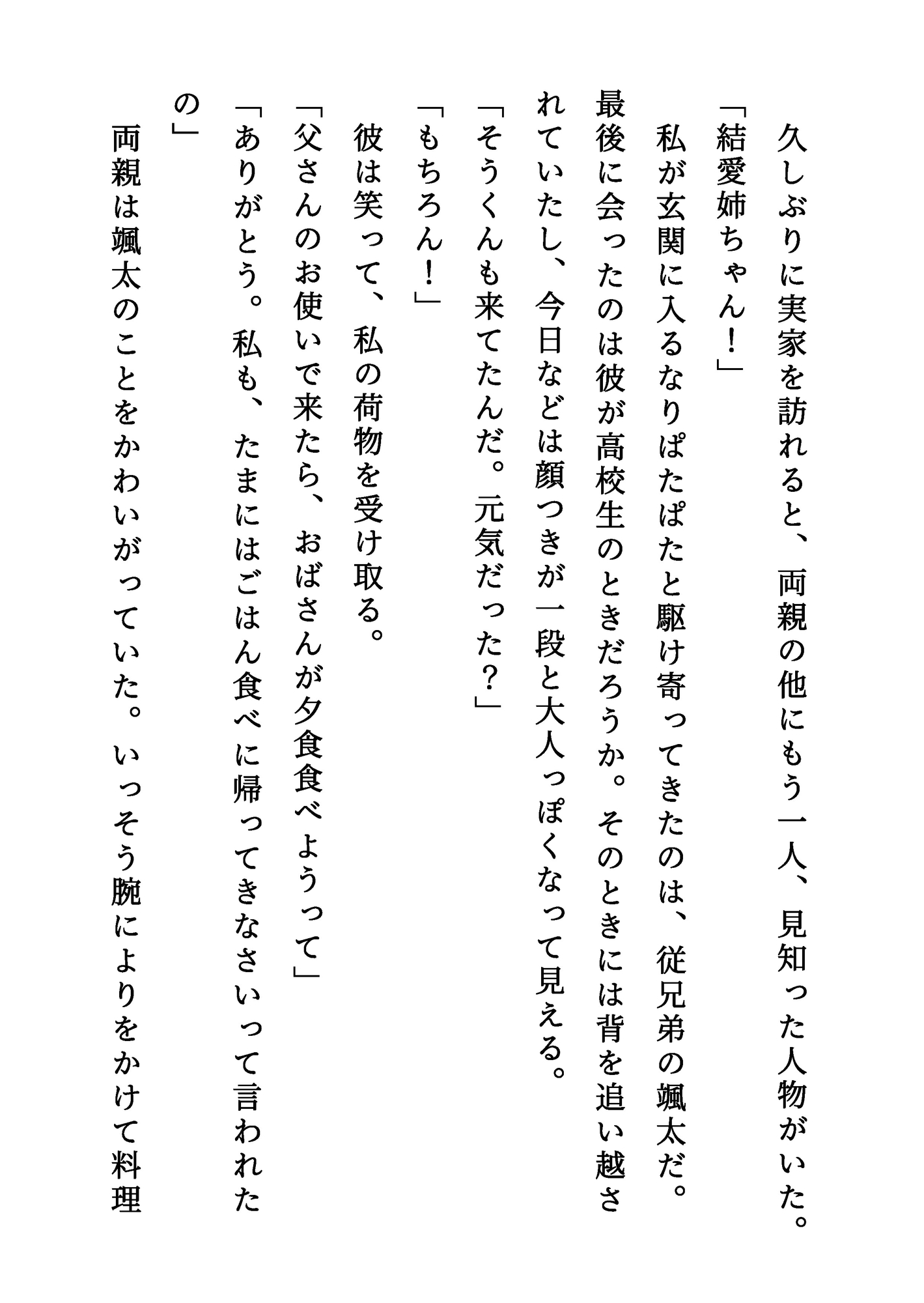 【登場人物】颯太(そうた):いとこの男の子。成人したばかり。結愛のことを幼いころから好きでいたが、ついに男として告白する。