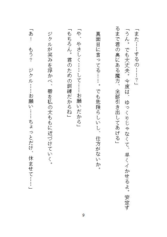師匠と弟子の禁断の境界線が曖牲になるほどに、二人の関係は快感と魔力で絡み合っていく。魔核は快感に共鳴し、絶頂のたびに奥深くでとろけるように開かれる。快感と魔力の連動が、私の心も身体も、すべてを溶かしていくのだった。