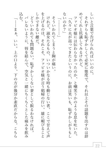 【あらすじ】とある王国の六大公爵家、ブラン公爵夫人となるあなた。ある日、あなた主催のパーティーを開いた折、夫ファビオに「愛想を振りまくな」と言い放たれる。真摯に受け止めたあなたは、次の日から何をするにも「無口」「無表情」となり、ファビオを不快にさせないように、公爵夫人としての役割を全うしようと心に決める。遠のく社交界、巷に広がる根も葉もない噂立ち、段々と周囲から疎遠になってしまう。ファビオは、そんなあなたに対して、表情を崩そうと仕掛けるが、あなたはファビオに言われた言葉を真に受けて、必死に表情を崩さないように生活をするが――。