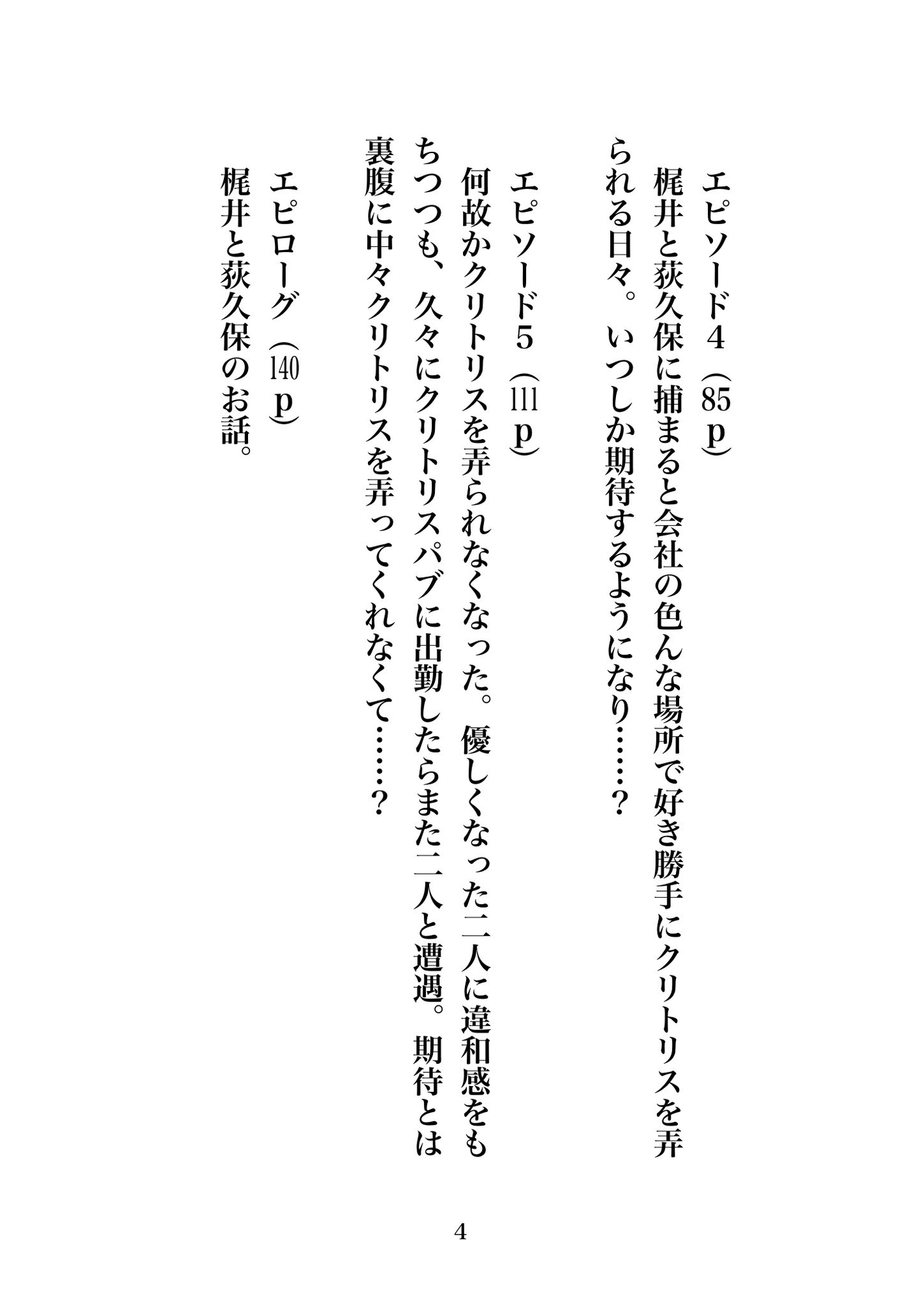 関西弁/クリ責め/強○オナニー/ローター/吸引バイブ/クンニ/言葉責め/羞恥/野外/痴○/動画撮影/脅し/連続絶頂/強○絶頂/謝罪要求/分からせ/モラハラ/♡喘ぎ/一応愛はある 梶井かじい190cm不遜な態度の俺様同僚。実家は大阪の大手家電メーカーでありボンボンの息子。主人公に対して当たりが強い。口調はキツめでバリバリの大阪弁。荻久保おぎくぼ189cm柔和な物腰に反して毒舌同僚。実家は京都の老舗旅館でこちらもボンボン。主人公に対してだけ冷たい。口調は優しげだが京都弁らしく嫌味ったらしい言い方をしてくる。