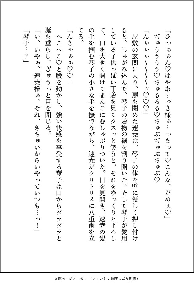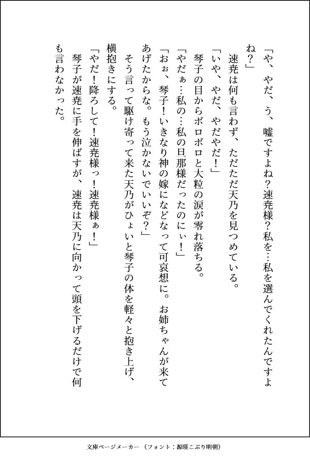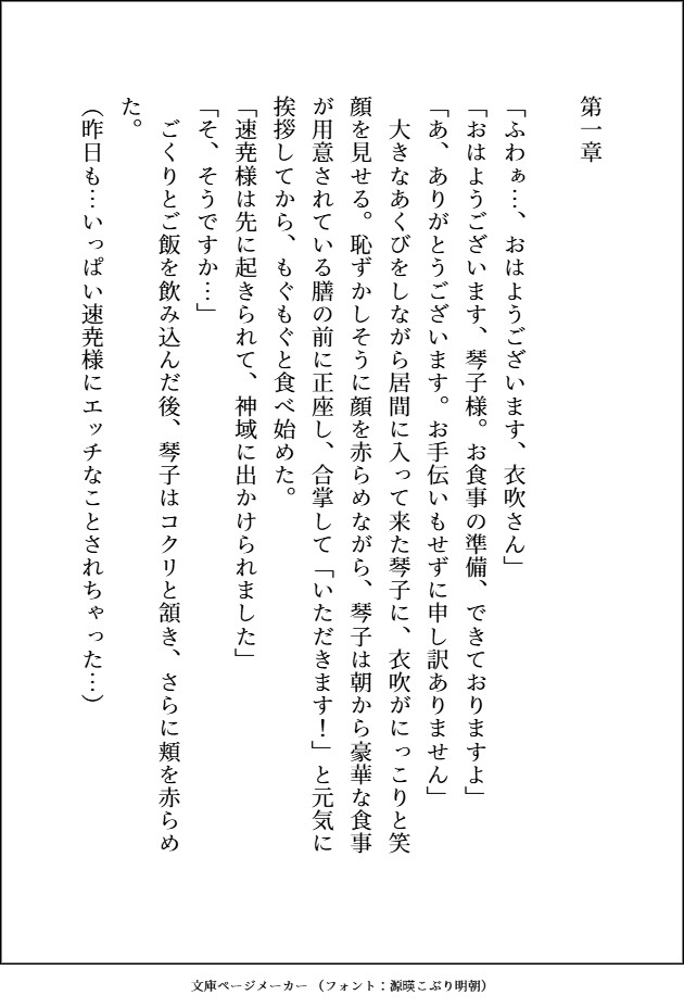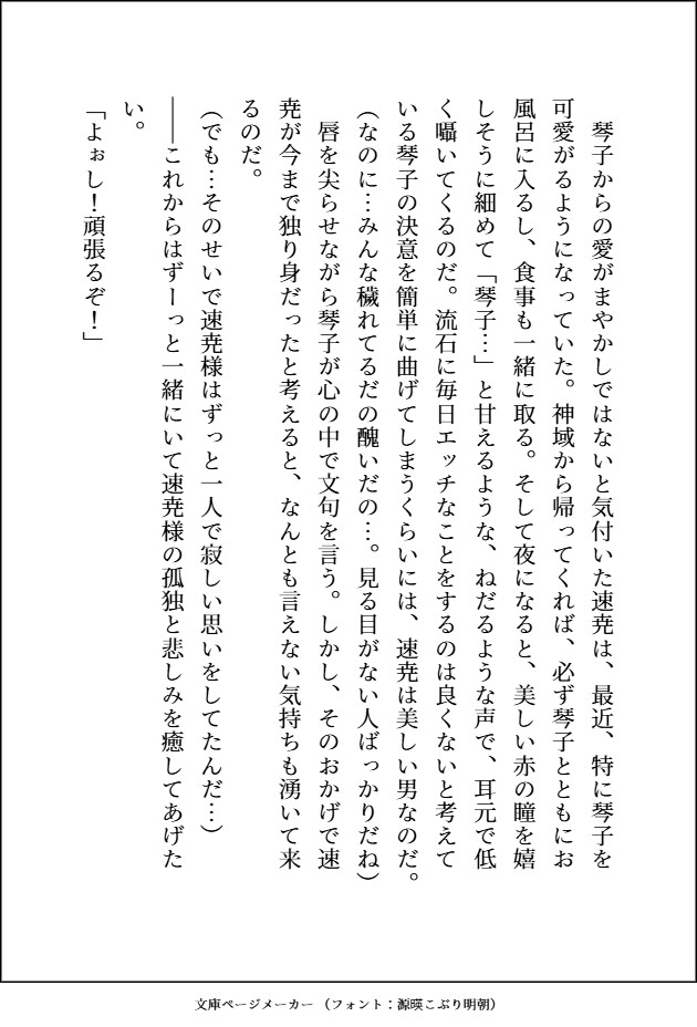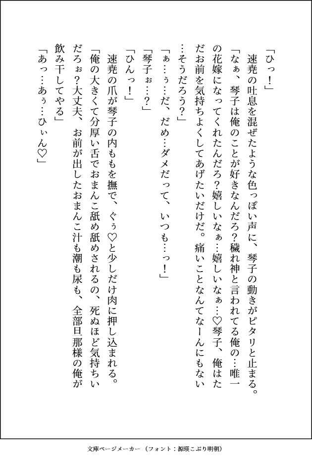 速尭(はやあき)腰あたりまである黒髪と赤い瞳、八重歯が特徴。身長は2メートルほどで褐色肌の筋肉ムキムキ神様。穢れを食らう仕事なので、それを嫌う神や女たちに長年虐げられてきたが、琴子が嫁にきてくれたので今は毎日幸せで堪らない。琴子の全てを可愛がりたいので、前も後ろも可愛がるぐちゃとろエッチは当たり前。琴子に与えてもらった幸せを何倍にも大きくして彼女に返したいし、気持ちいこともいっぱいしたいと思っている。が琴子のトラウマ自体がかなり気に入らない。「お前の心にあるのは俺だけでいい」。たまに悪そうな笑みを見せるのはちょっと隠し事があるから。