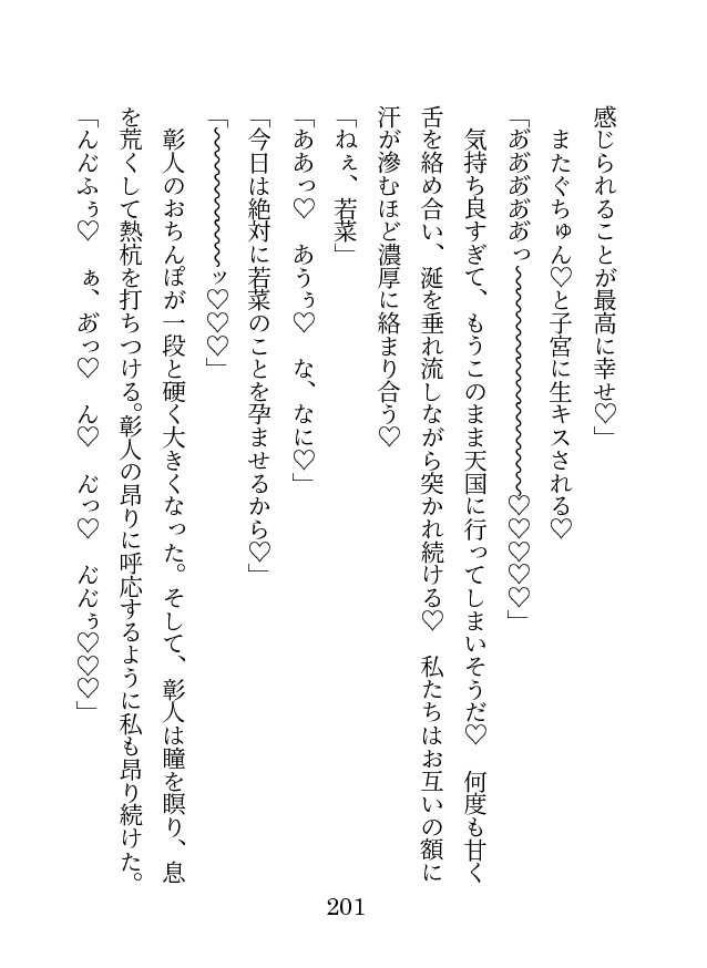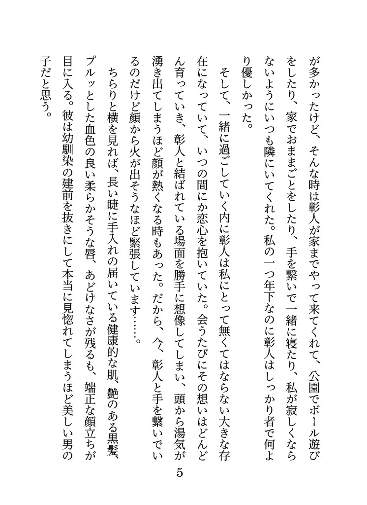 新興玩具メーカーであった氷川製作所の跡取り息子。彰人のことをライバル視しており(彰人は全くしていない)、若菜のことを自分の物にしたいと思っている。MANOソリューションズに技術研修に訪れていたが、密かに技術と技術者を奪う算段をつけていた。自分が一番にならないと気が済まない性格で、MANOソリューションズの技術と若菜を手に入れるために、海外企業と結託してMANOソリューションズの技術者と販売シェアを奪って若菜の父親の会社を潰して買収する。若菜が西城グループに渡ってしまったことで手が出せずとても悔やんでいたが、その八年後――。彰人の秘書となった若菜と出会った氷川は、父親の借金を盾にして若菜に彰人の秘書を辞めて自分と結婚するように脅して奪うことを強行する。 ヤンデレ・執着・連続絶頂・溺愛・焦らし・クリ責め・乳首責め・キス責め・中出し・媚薬・絶倫・ハート喘ぎ・濁点喘ぎ・オ声・潮吹き・睡眠〇・一部玩具責め&放尿シーンあり・ハッピーエンド・サスペンス要素あり・すれ違い・シリアス ・キス責め、乳首責め、クリ責め、焦らしも入ります。・ベッド上にて、手足を縄で縛られたまま中出しセックス。・手枷をつけられたまま睡眠〇や背中側で手足を枷で拘束されて中出しセックス。・一部、媚薬ローションや大人の玩具を扱うシーンもありますがメインではありません。・大好きな人とのエッチが気持ち良くて、拒まなければならないのに自らおねだりしてしまう傾向にあります。 【一】大好きな幼馴染の秘書になるまで【二】没落令嬢は大企業になった社長の幼馴染の溺愛秘書【三】父の会社を潰した大嫌いな男に脅されました【四】会社の炎上騒ぎと最後にお別れを伝えようと思ったら(縄で両手足を拘束して監禁エッチ)【五】幼馴染が寝ている時に犯してきます!(彰人視点、ベッドで手枷をはめられたまま睡眠〇)【六】甘い監禁生活の終わりと二人の未来(仕事帰りの彰人と拘束エッチ&玄関先で監禁ごめんね溺愛エッチ)・エッチシーンは四章から六章となっており、約38,000字程度。・六章は氷川に対する断罪シーンもあります。表紙・目次2ページ。奥付1ページ。あとがき3ページ。本文A6判208ページ(約70,000字)