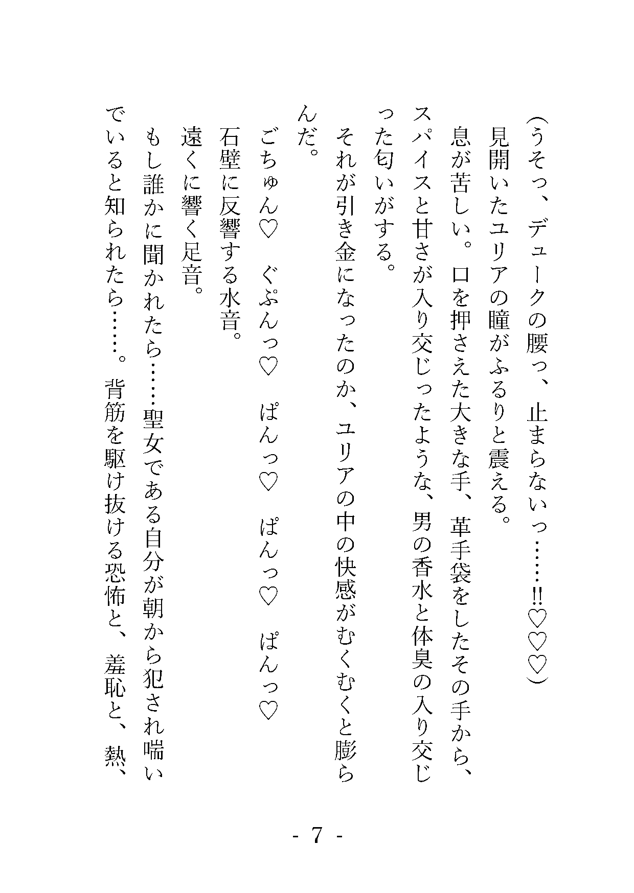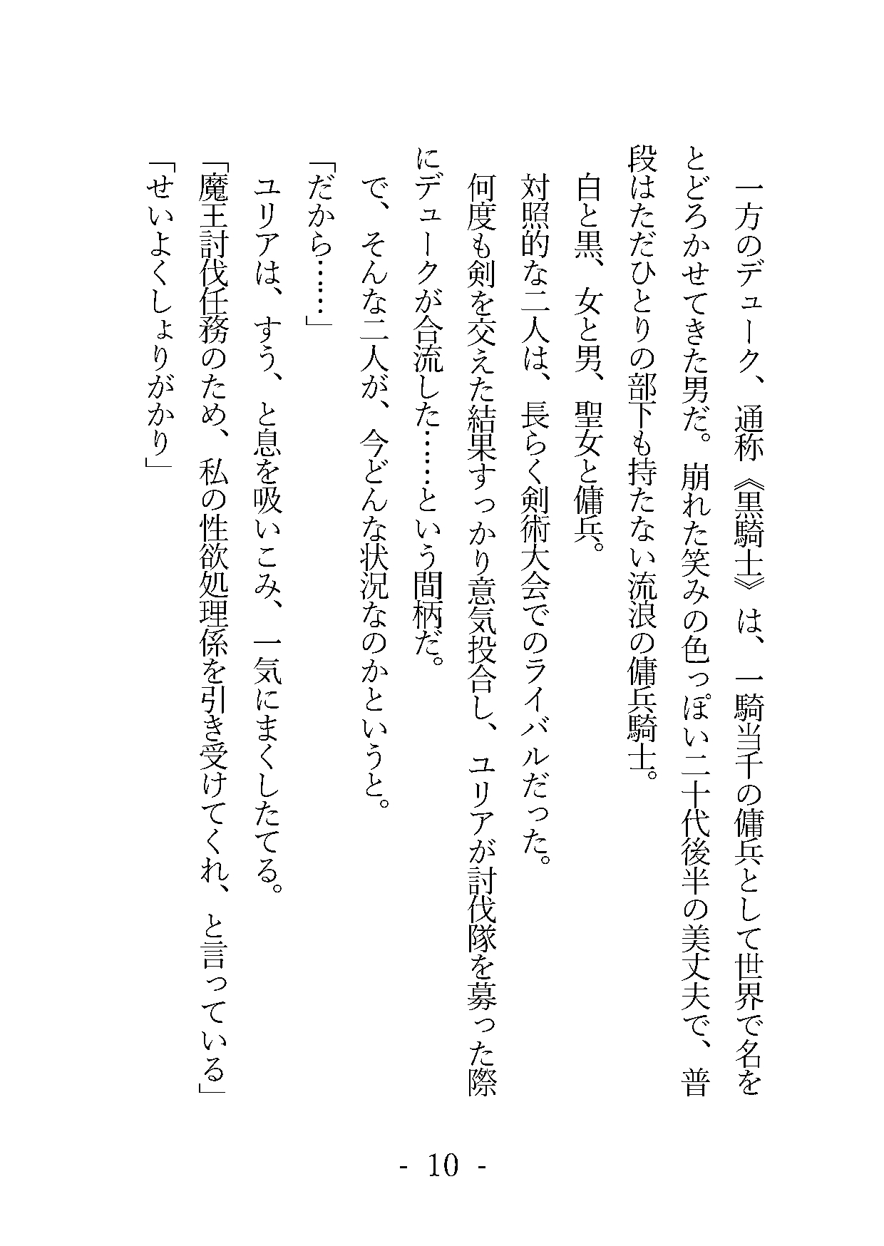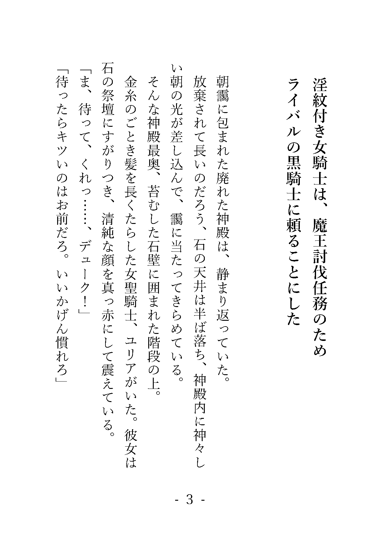 魔王軍と人間軍が戦い続けている世界、ランズエンド。清らかで凜々しい聖女騎士のユリアは、人間軍の先頭に立って戦っている。が、あるとき魔王に淫紋を付けられてしまい、毎日男の精を胎に受けなければ体がうずくようになってしまった。このままでは聖女騎士としての面目はまるつぶれ、一体どうする……?困ったユリアが選んだのは、ライバルの黒騎士、デューク。