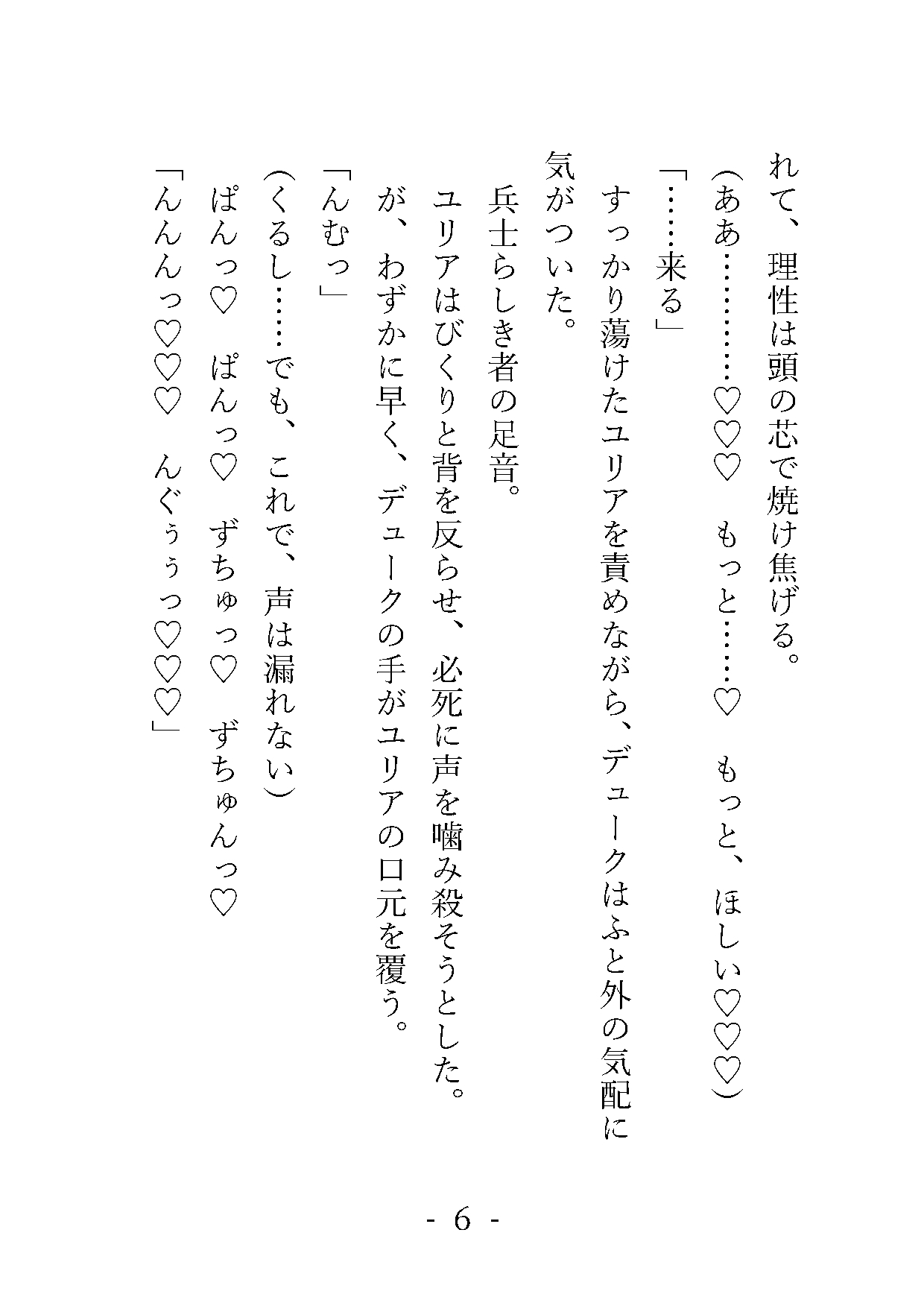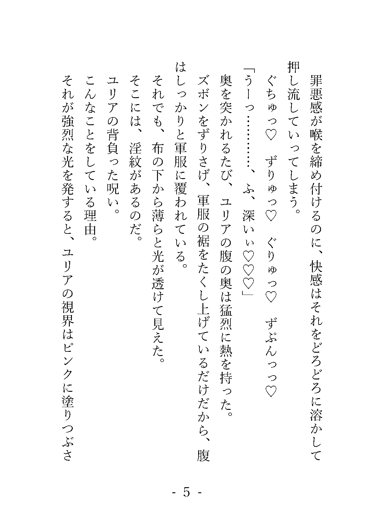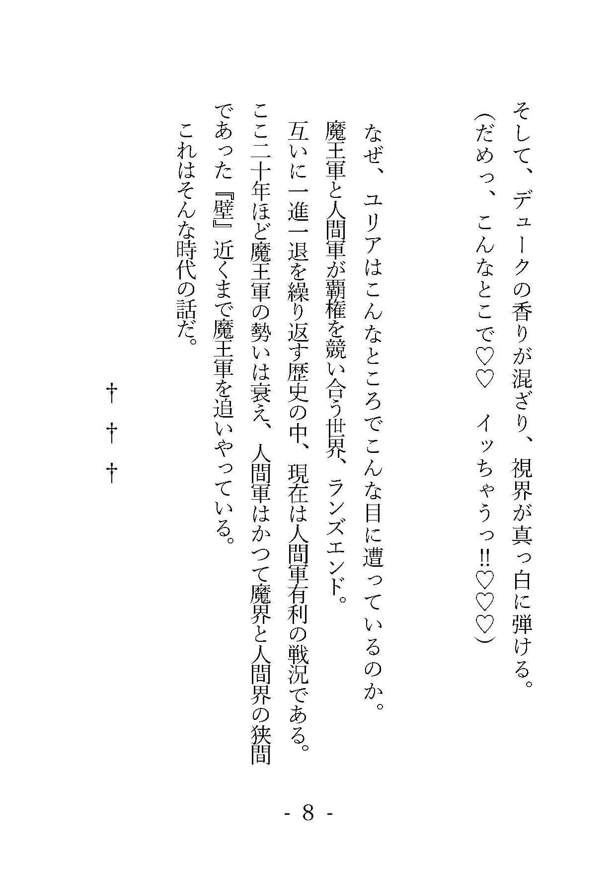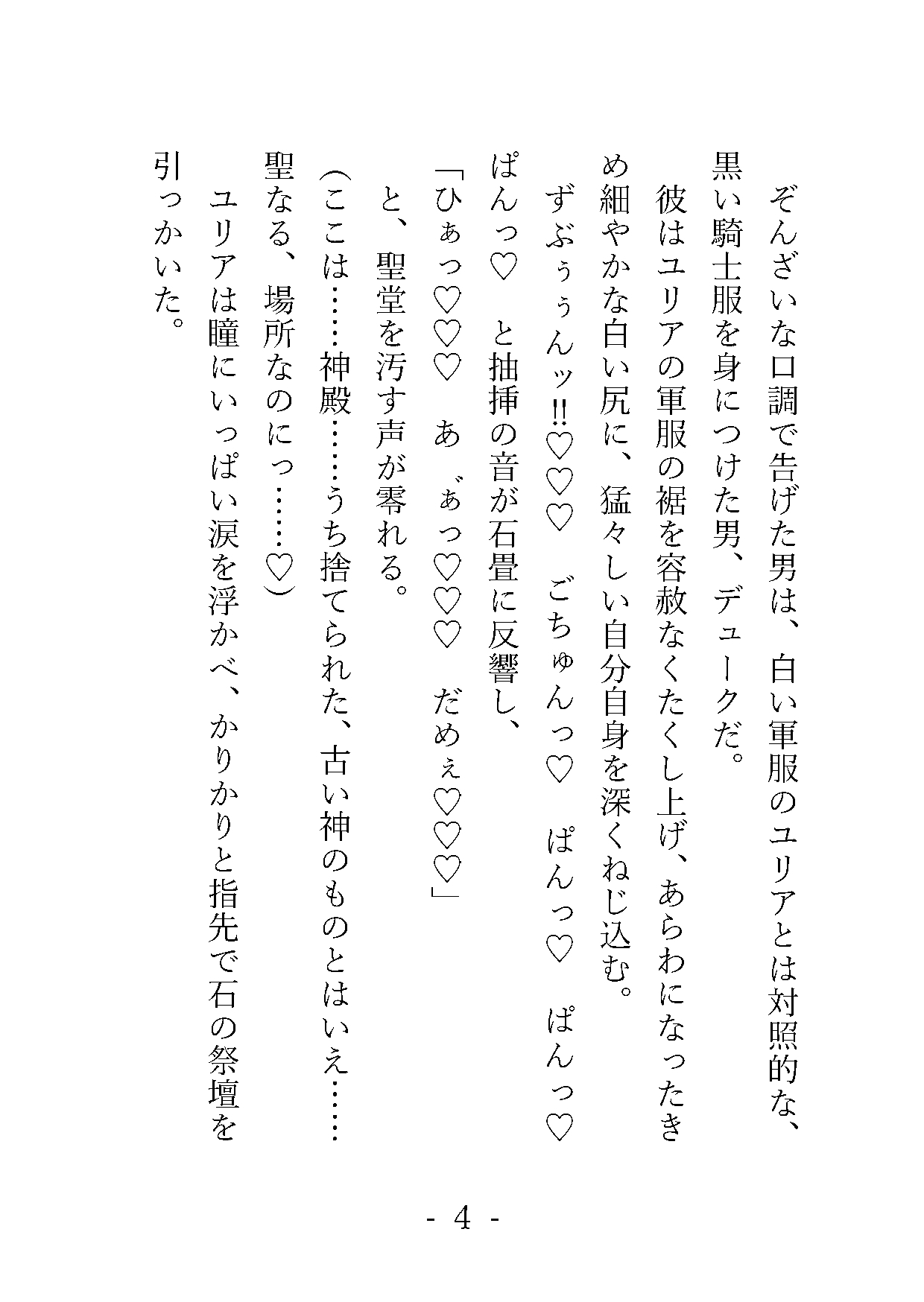 魔王軍と人間軍が戦い続けている世界、ランズエンド。清らかで凜々しい聖女騎士のユリアは、人間軍の先頭に立って戦っている。が、あるとき魔王に淫紋を付けられてしまい、毎日男の精を胎に受けなければ体がうずくようになってしまった。このままでは聖女騎士としての面目はまるつぶれ、一体どうする……?困ったユリアが選んだのは、ライバルの黒騎士、デューク。