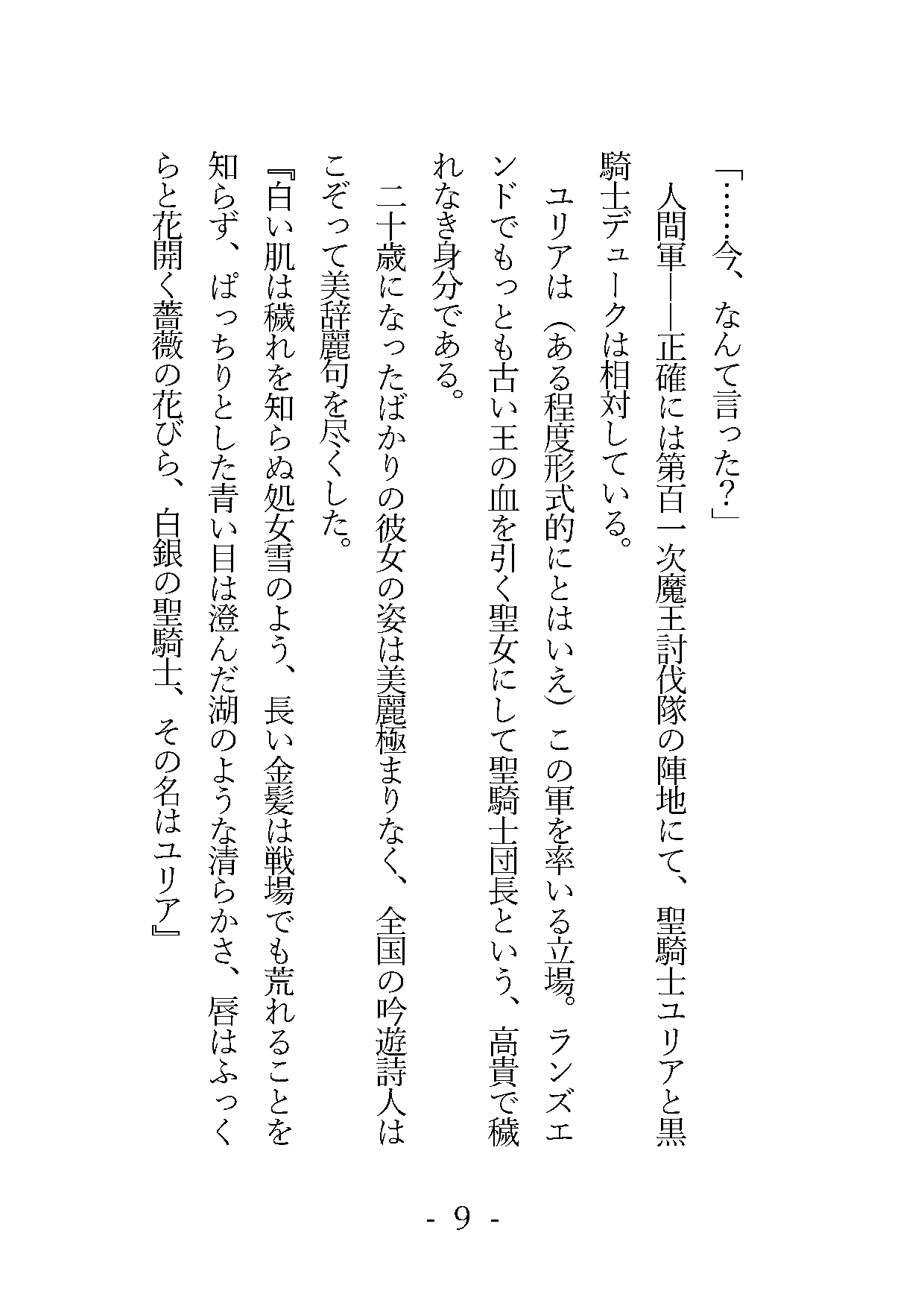 ユリア……20歳。金髪碧眼。(ある程度形式的にとはいえ)人間軍を率いる立場。ランズエンドでもっとも古い王の血を引く聖女にして聖騎士団長という、高貴で穢れなき身分。クールで凜々しいが無知気味で健気。恋愛経験がなさすぎて、デュークに対する気持ちが信頼なのか恋なのかよくわかっていない。