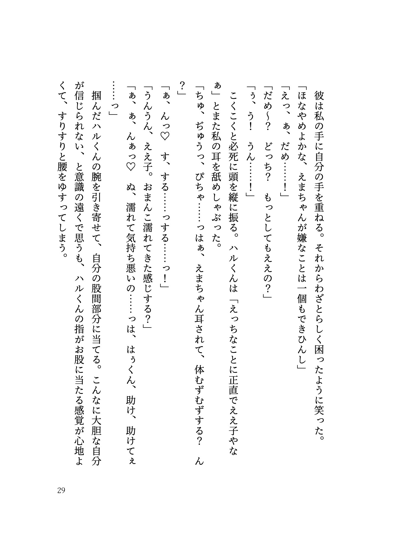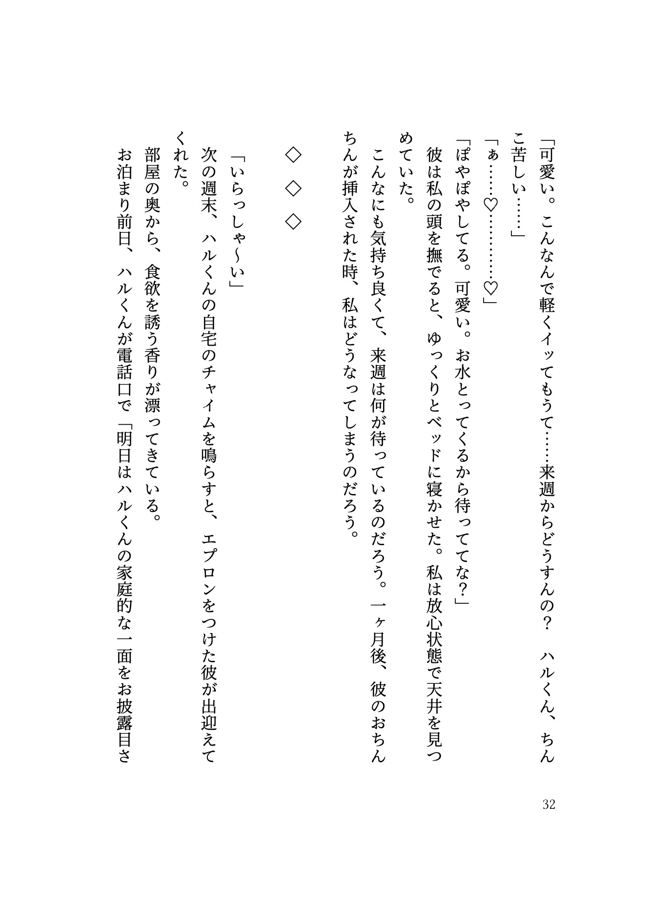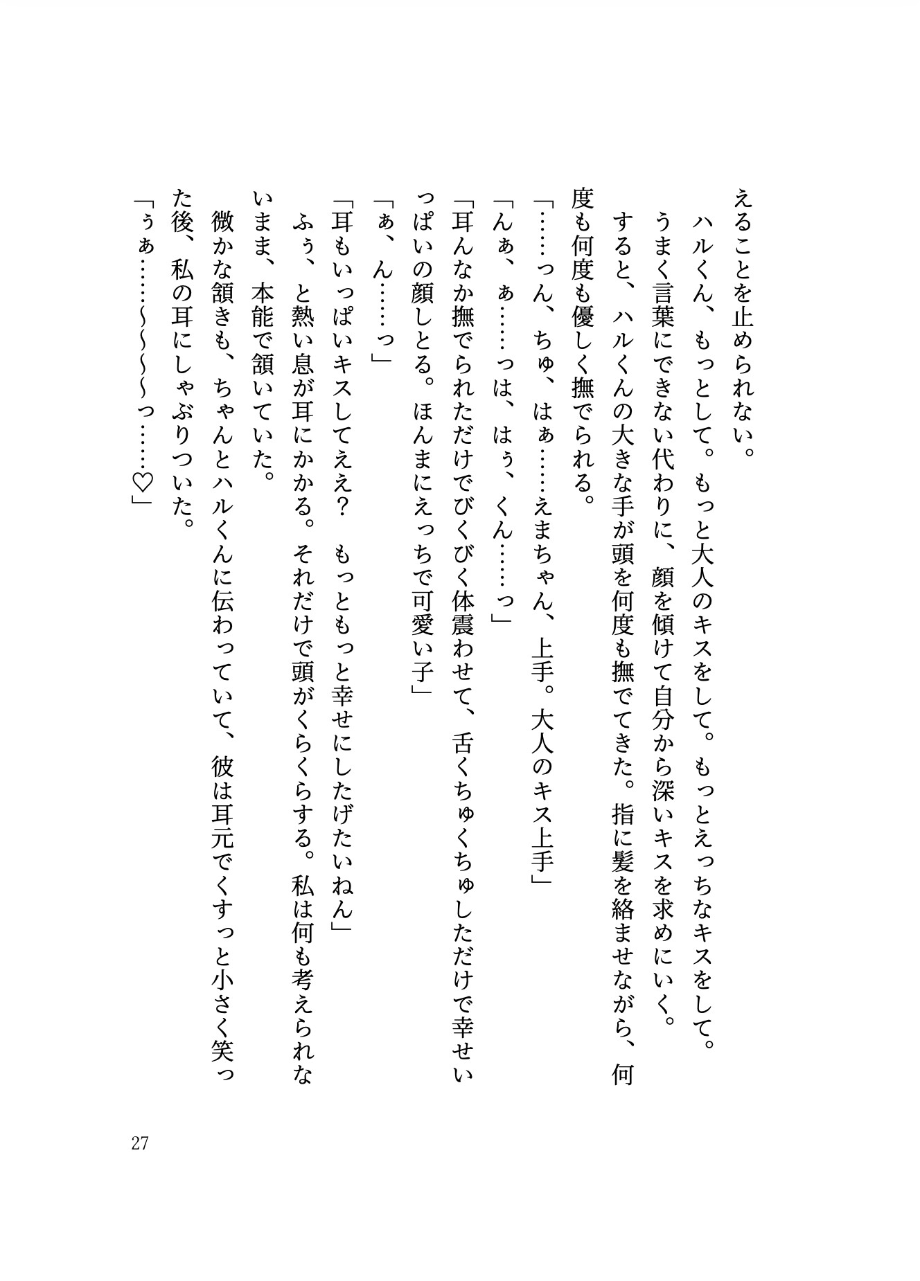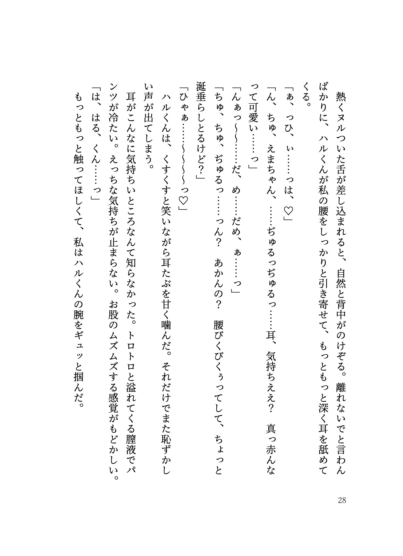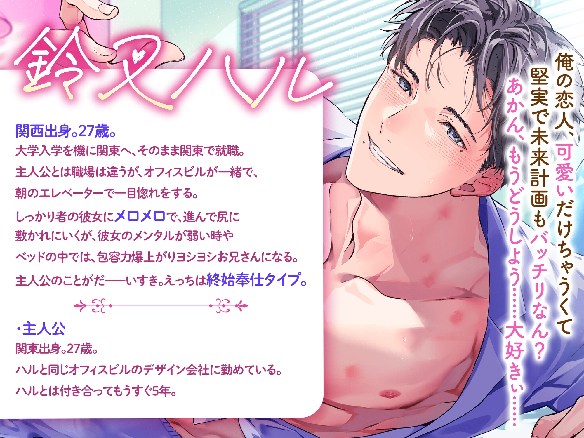 これは壮大な物語なんかじゃない。ドラマチックな展開だってない。私とハルくんの日常だ。他愛もない日々の、幸福なセックスの断片集。 【鈴叉ハル】関西出身。27歳。大学入学を機に関東へ、そのまま関東で就職。主人公とは職場は違うが、オフィスビルが一緒で、朝のエレベーターで一目惚れをする。しっかり者の彼女にメロメロで、進んで尻に敷かれにいくが、彼女のメンタルが弱い時やベッドの中では、包容力爆上がりヨショシお兄さんになる。主人公のことがだーいすき。えっちは終始奉仕タイプ。