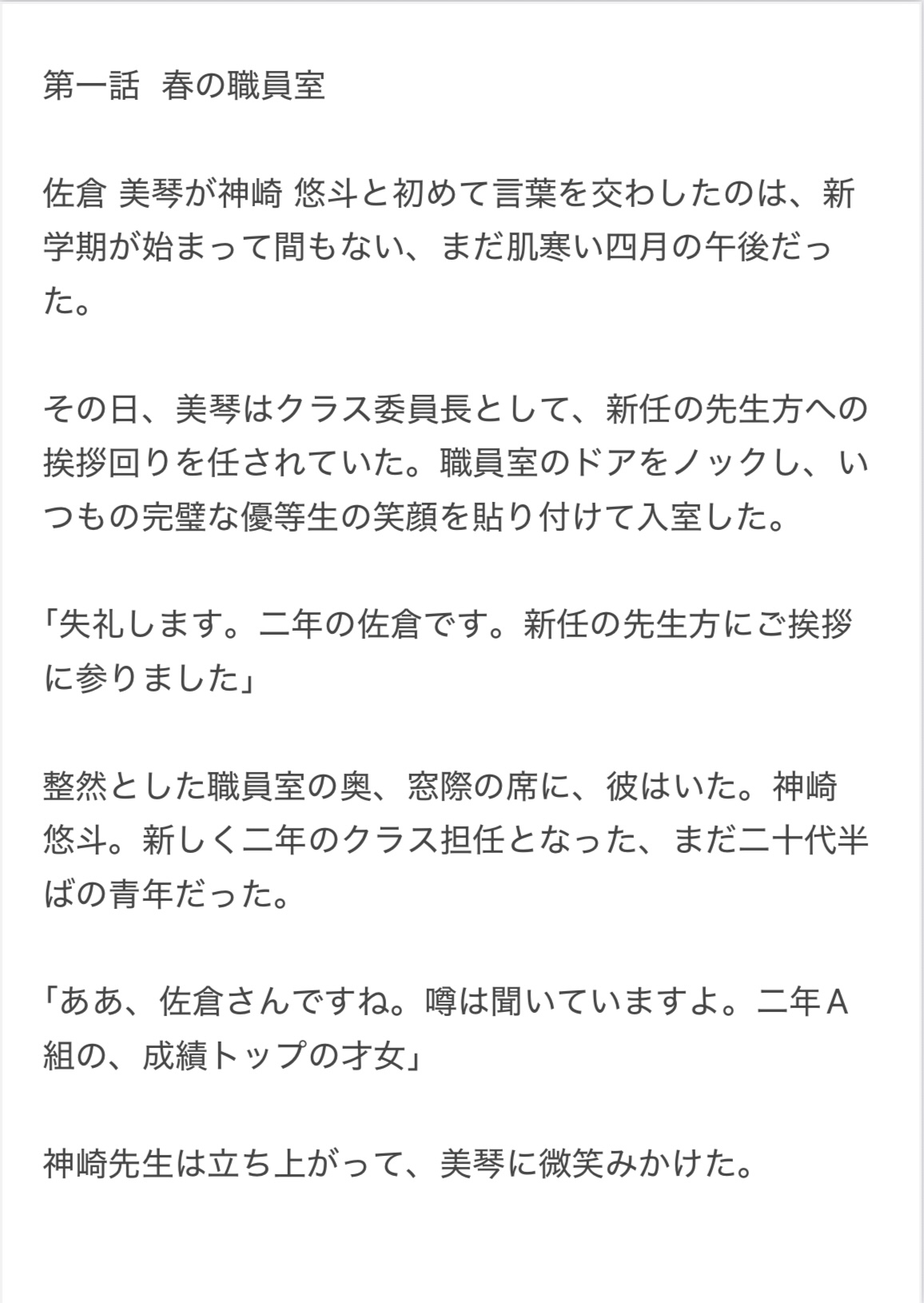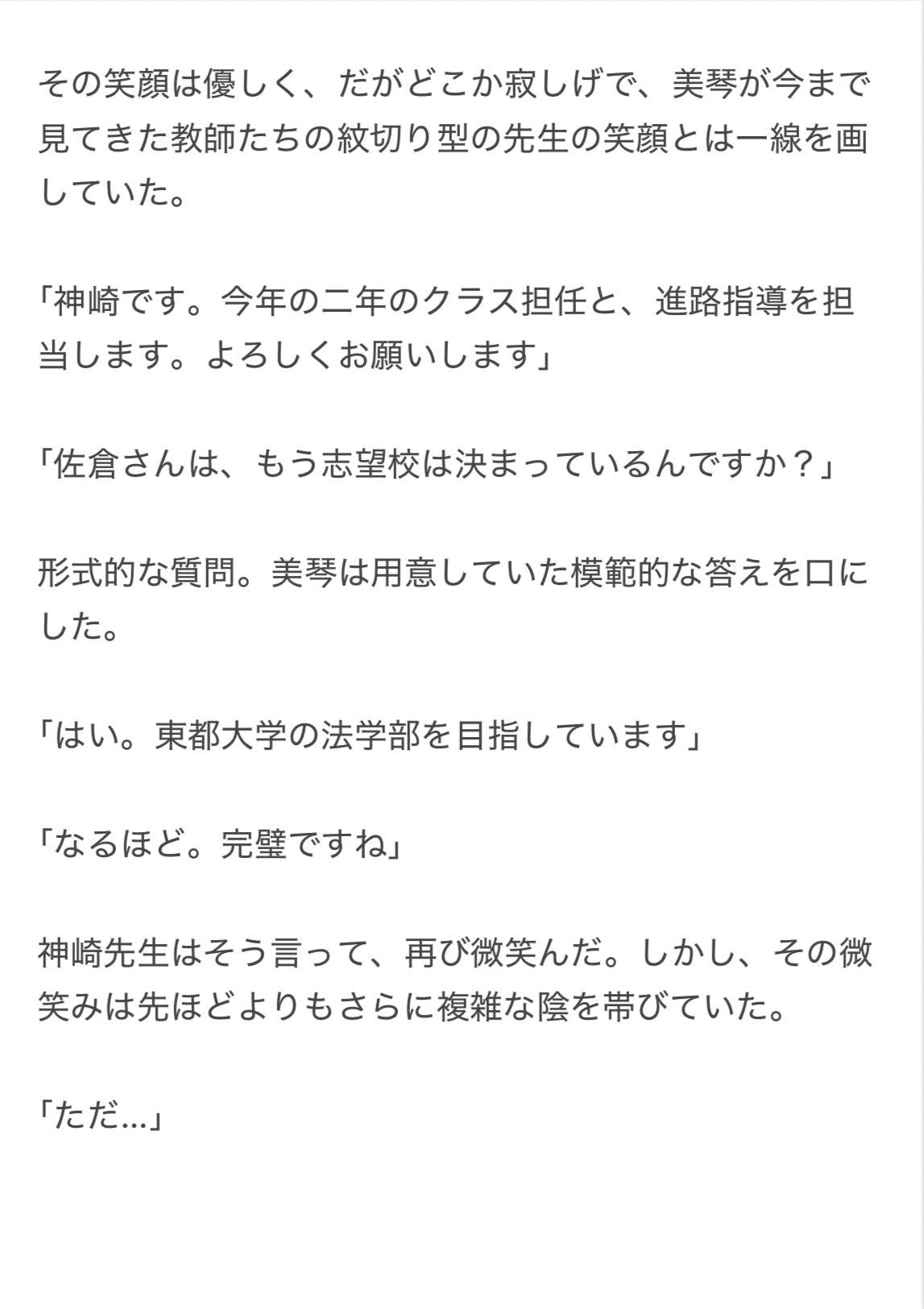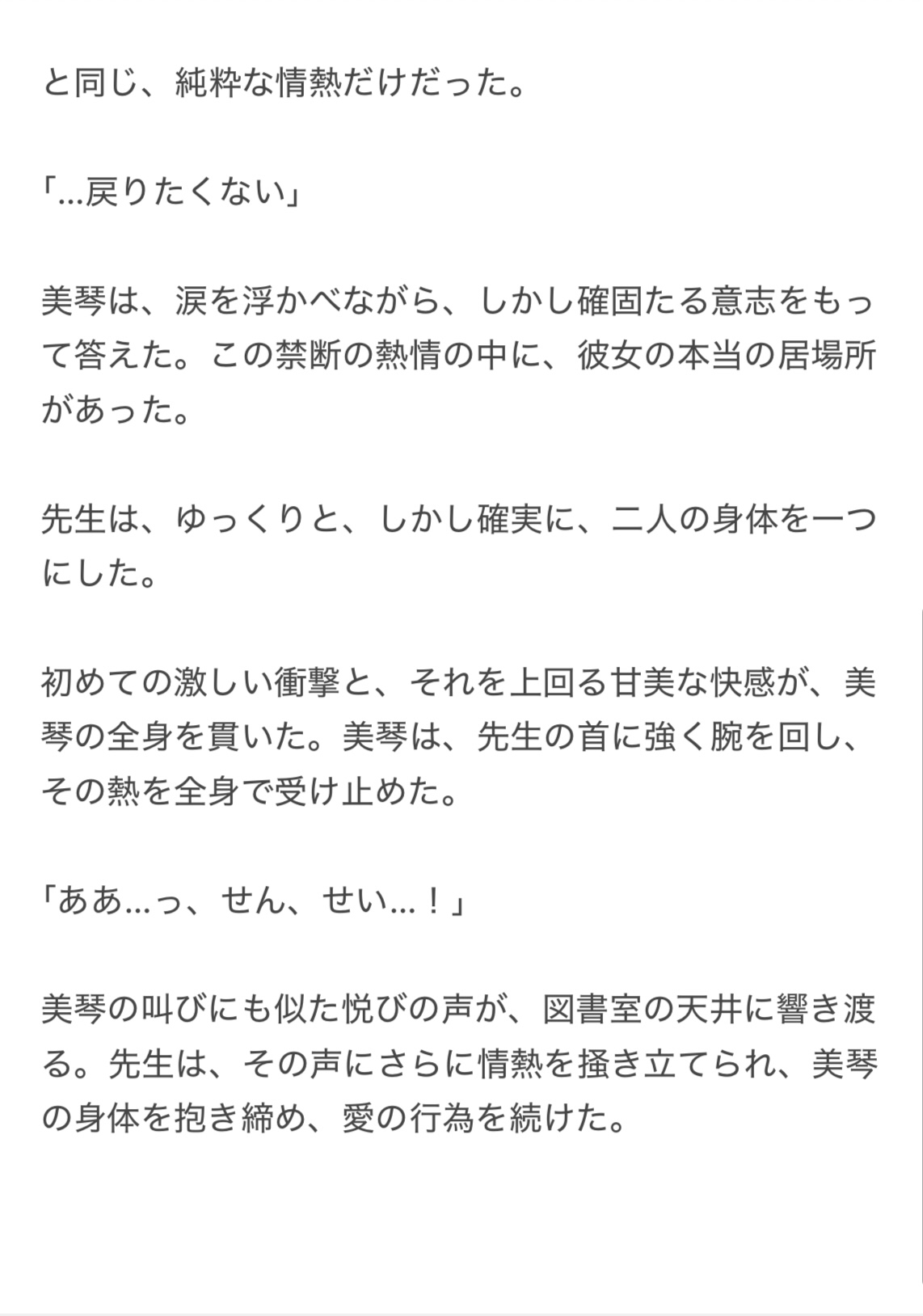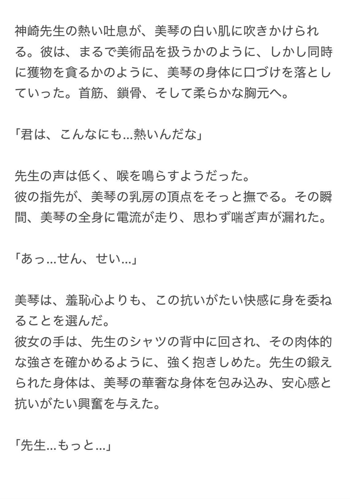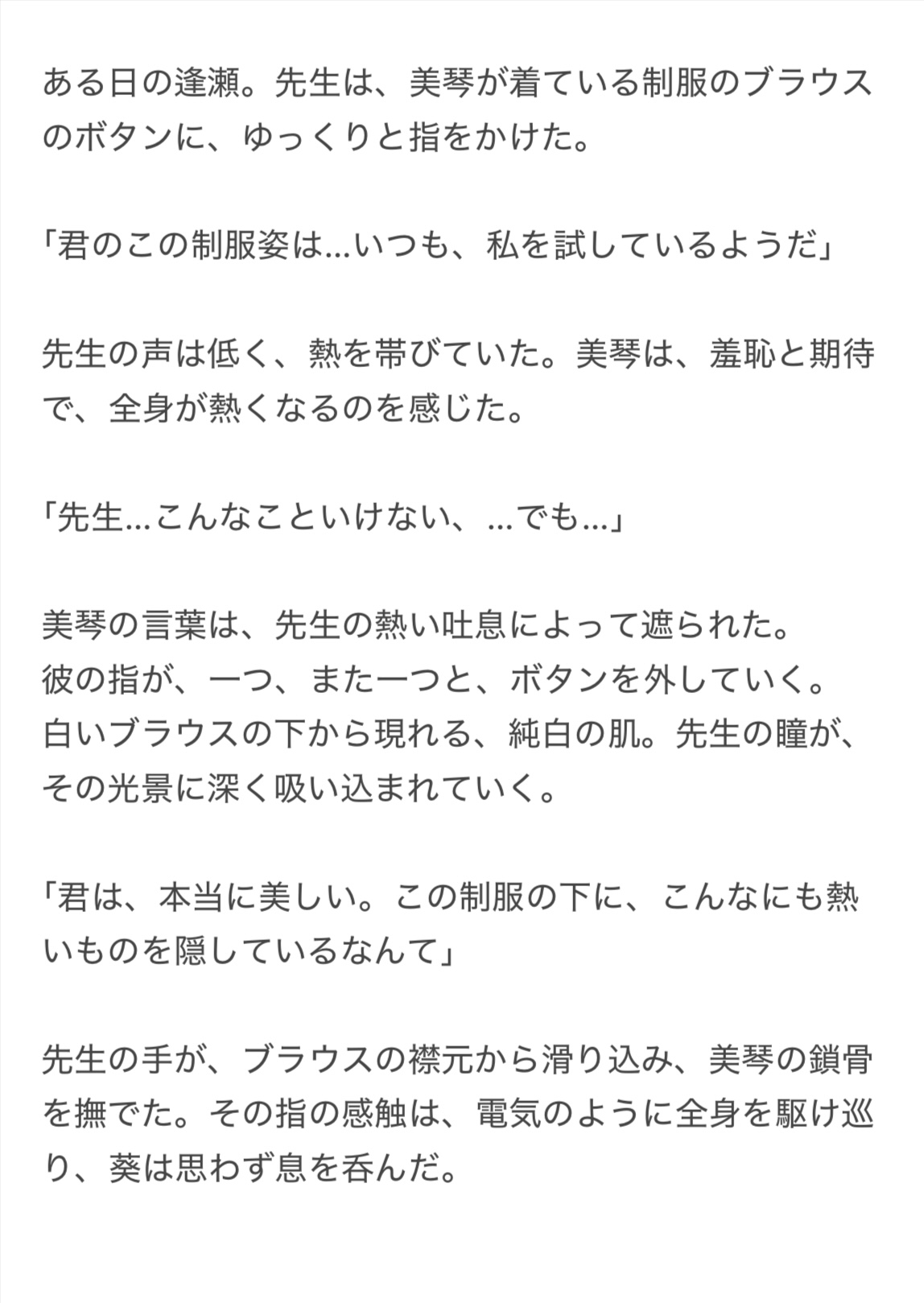 優等生という仮面を被った女子高生の美琴が、教師との禁断の関係を通じて、自己の内に秘めた情熱と欲望を解放していく物語。
