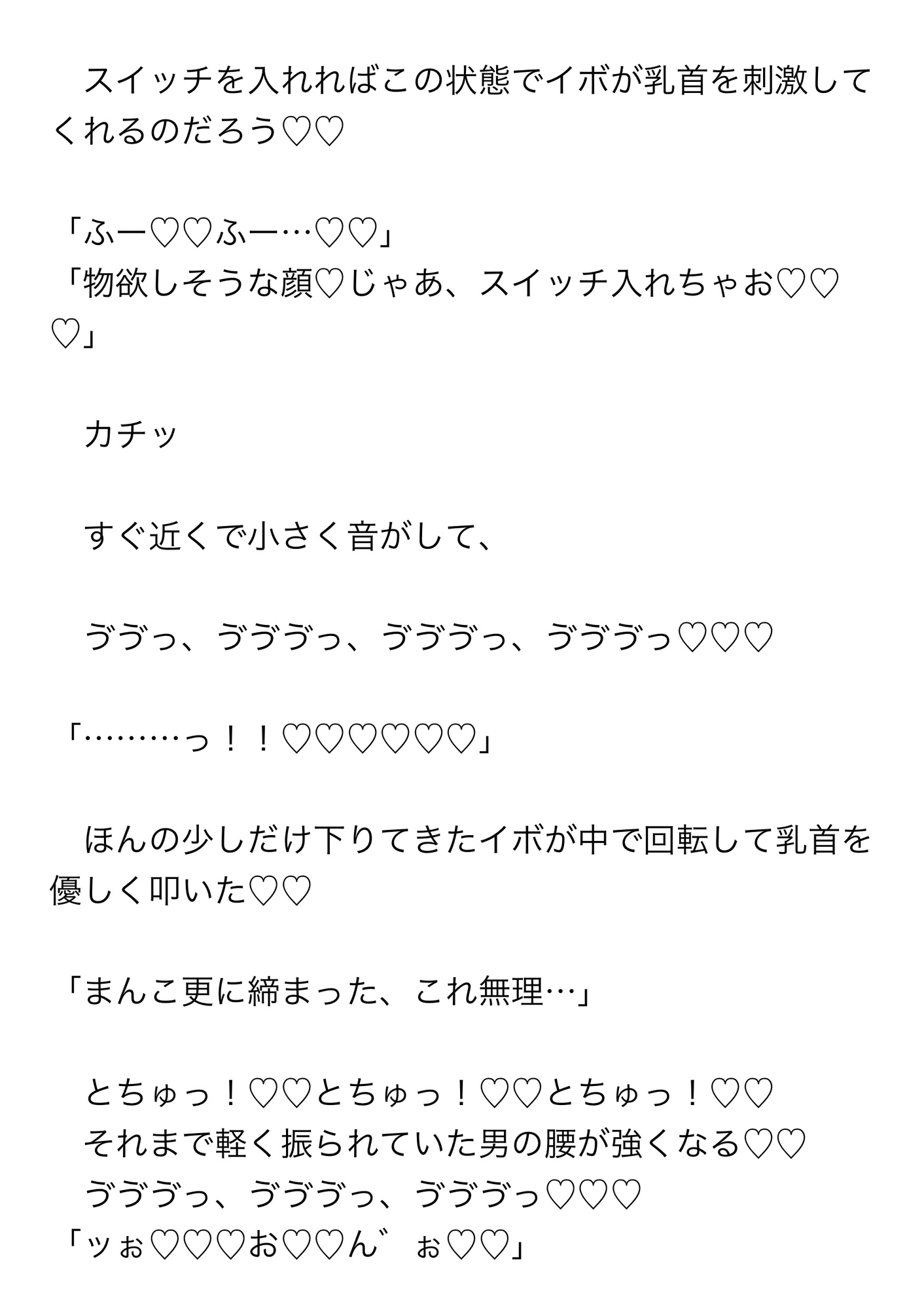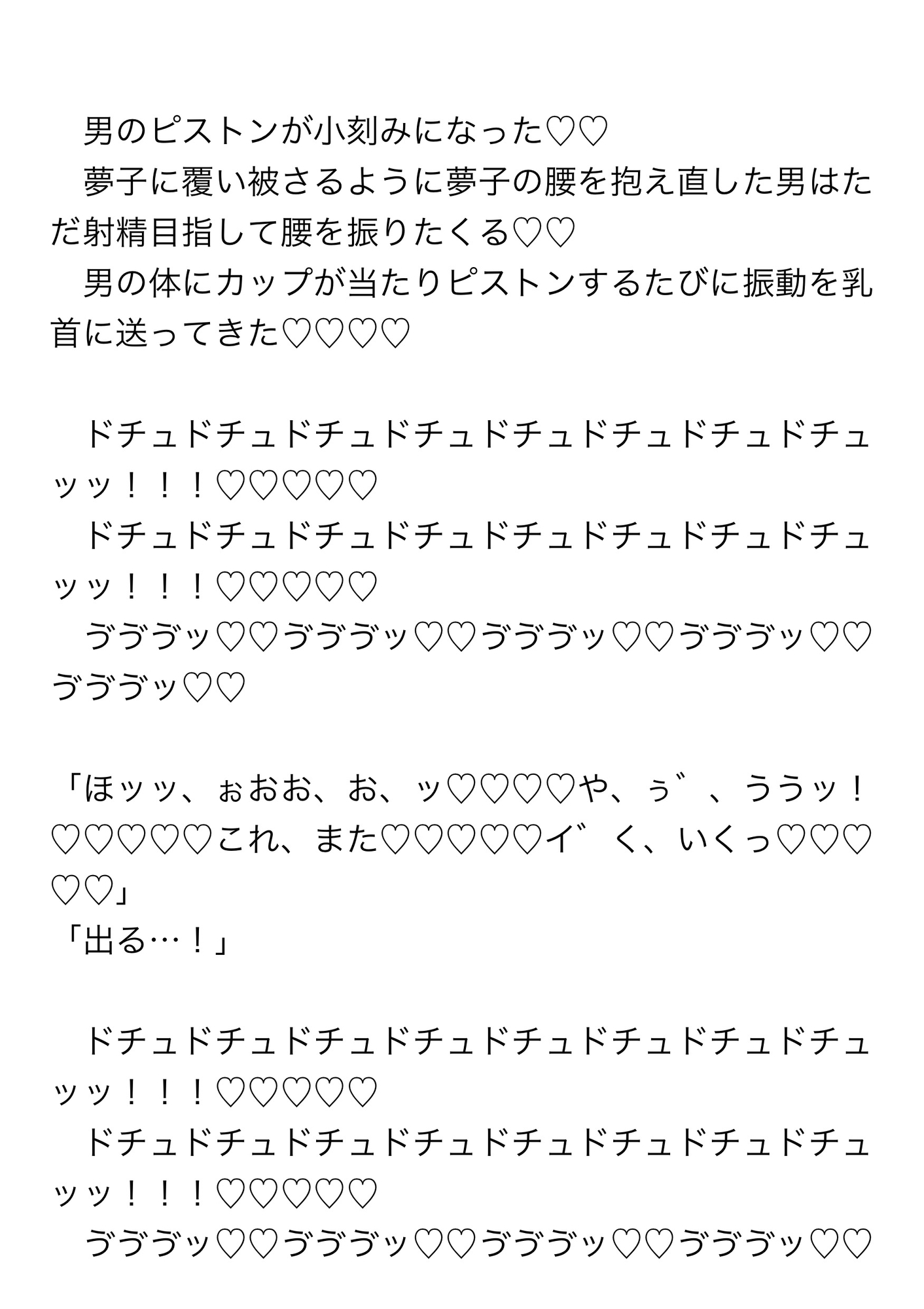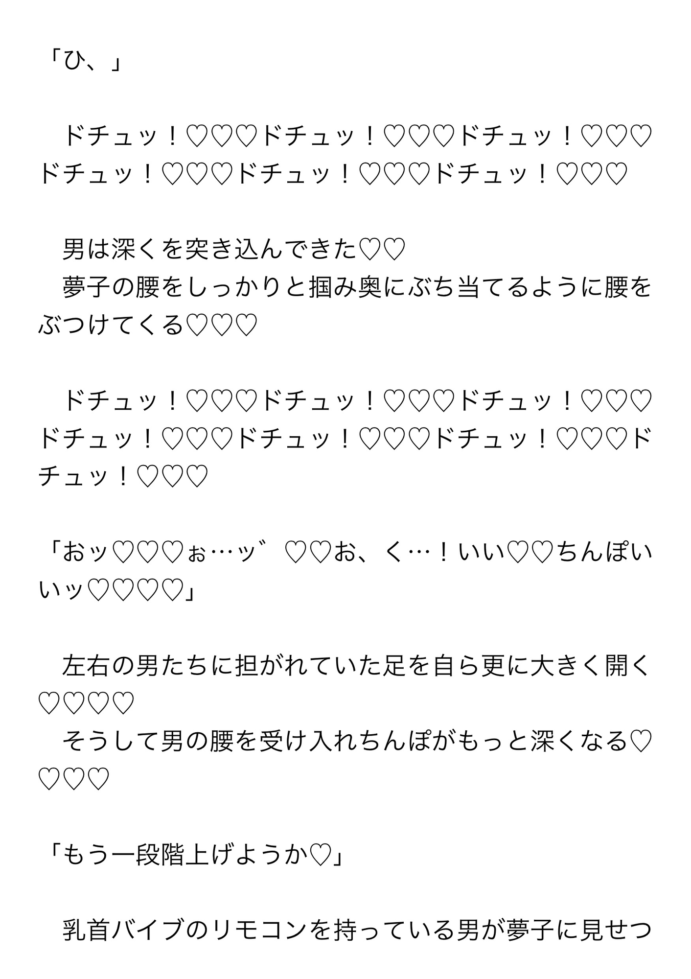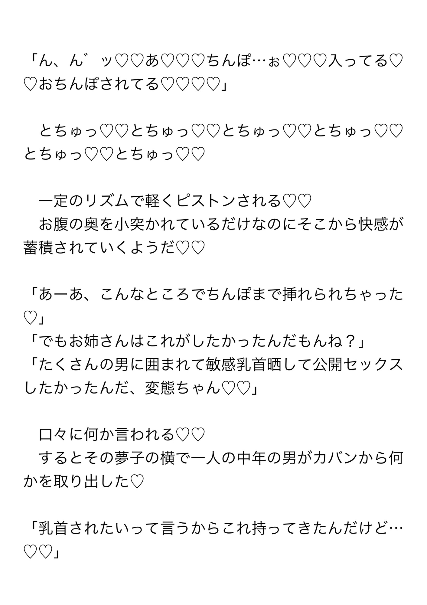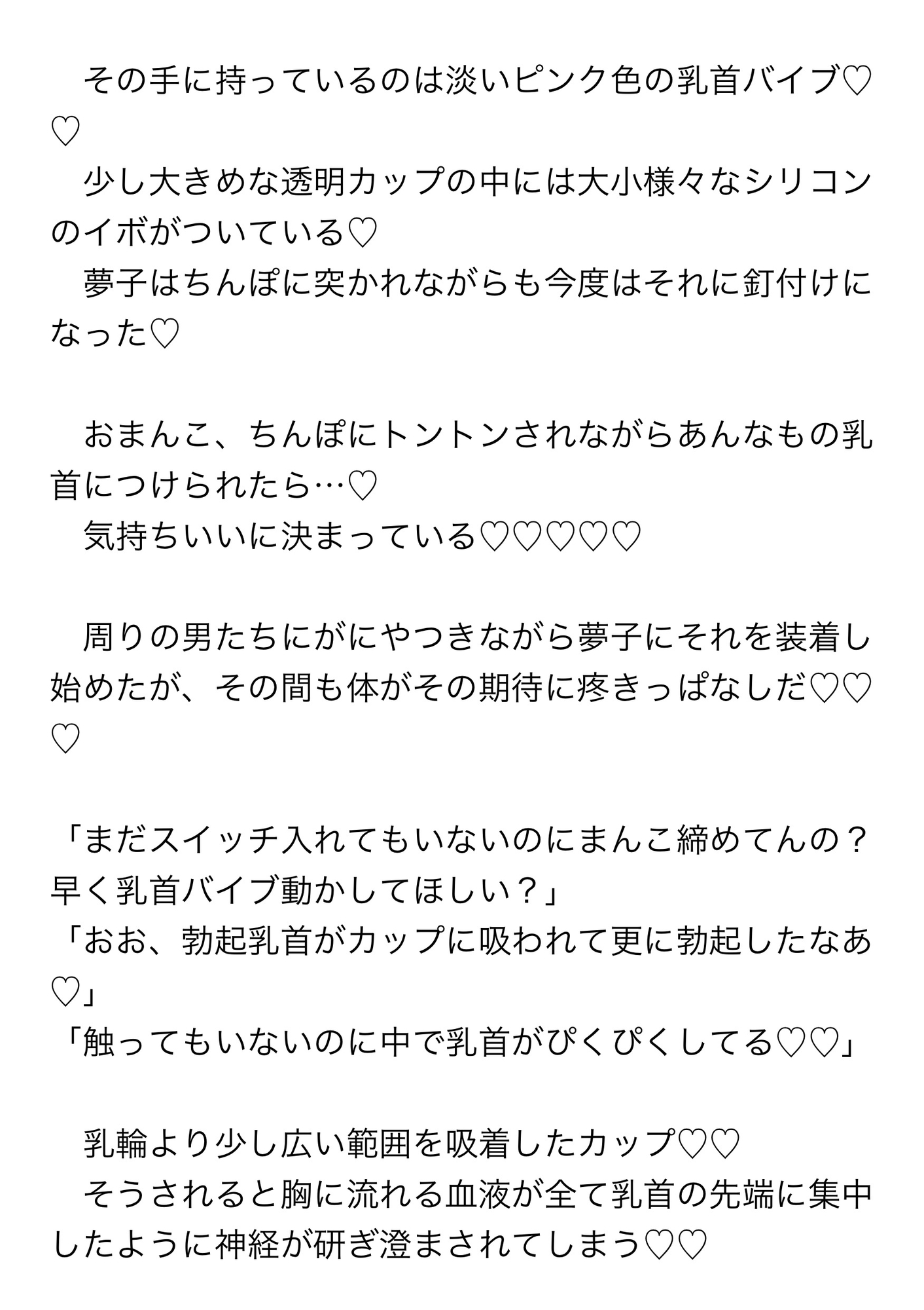 そこで「乳首されたいって言うからこれ持ってきたんだけど…」と、透明のカップの中にシリコンのイボのついた乳首バイブを持ってきた男がそれを取り出し夢子に装着した。夢子はいくつものちんぽを受け入れながらだんだんと強く激しくなっていく乳首バイブに何度もイかされる。乳首バイブによって勃起させられ敏感になった乳首を解放されると今度はその敏感乳首をフェラチオされ乳首イキまで……。