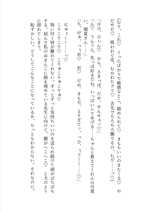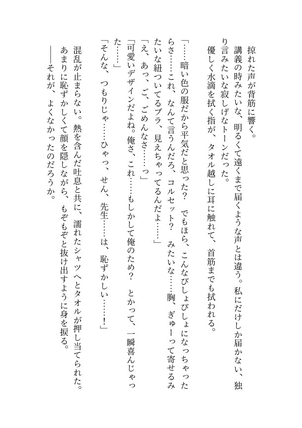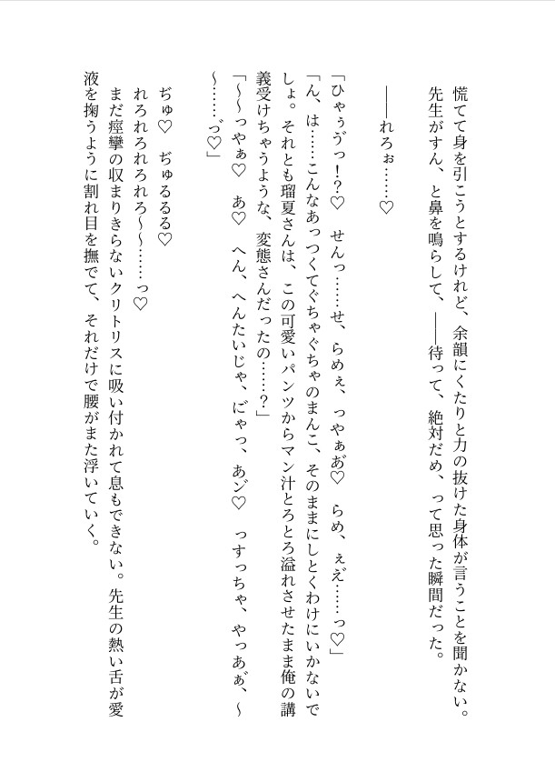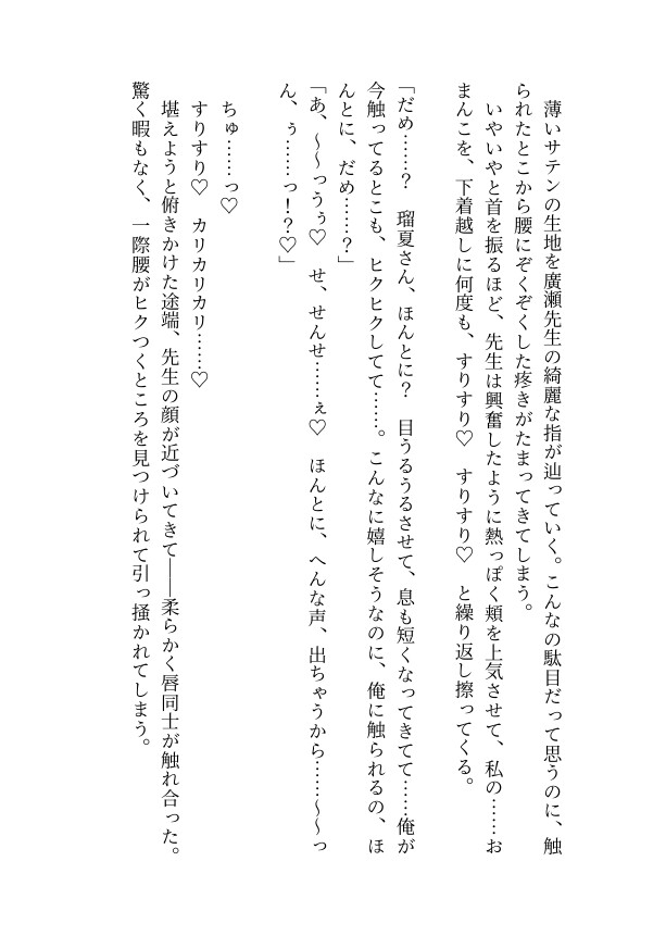 と言ってくれる。優しく接してくれる廣瀬先生にドキドキしつつも、勘違いしないようにしなければと心に決める瑠夏。しかし個別指導の日、豪雨に遭ったことがきっかけで瑠夏の秘密である「セクシーな下着を着るのが趣味」ということがバレてしまう。慌てて、親から普段は地味にしなさいと言われているためこっそり趣味で着ているだけと弁明する瑠夏だったが、先生は……